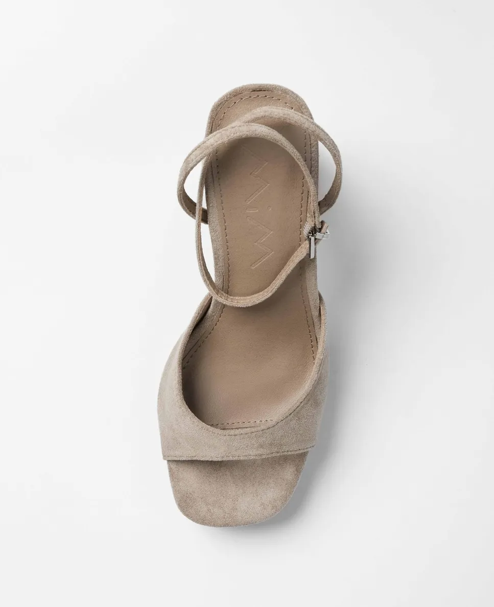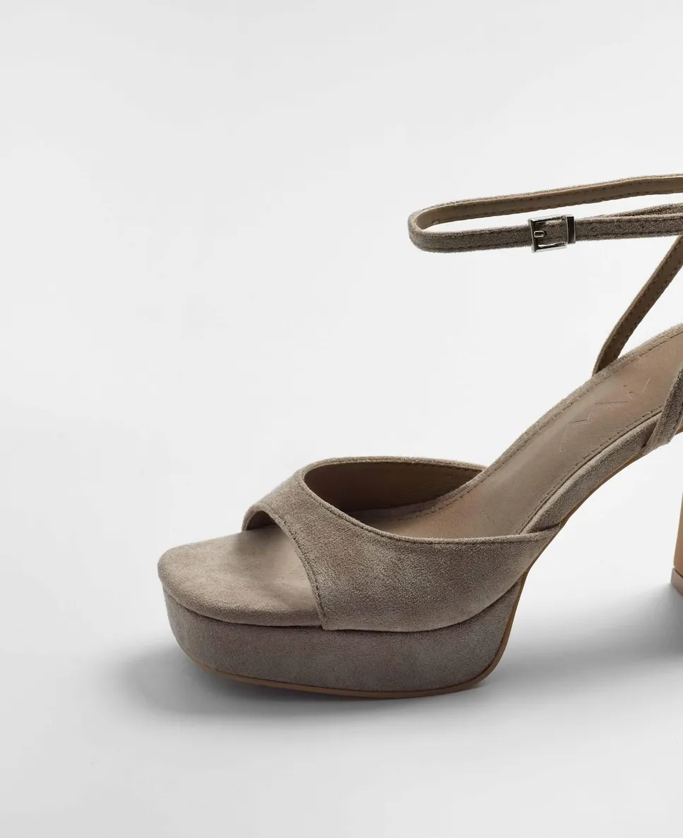 Босоножки на каблуке с платформой цвета топо. Широкая полоска спереди и застежка на ремешок вокруг щиколотки. Прямоугольный каблук.
