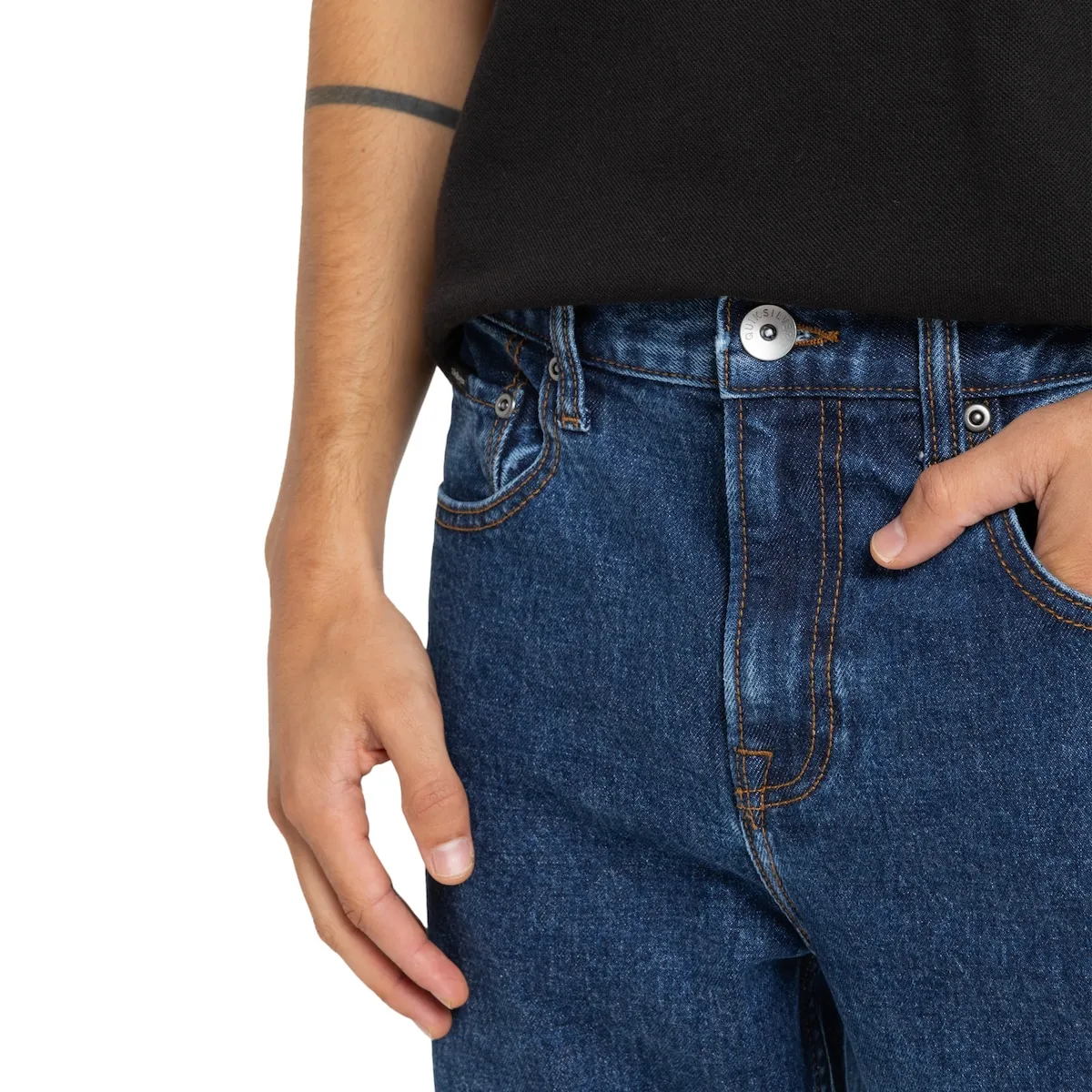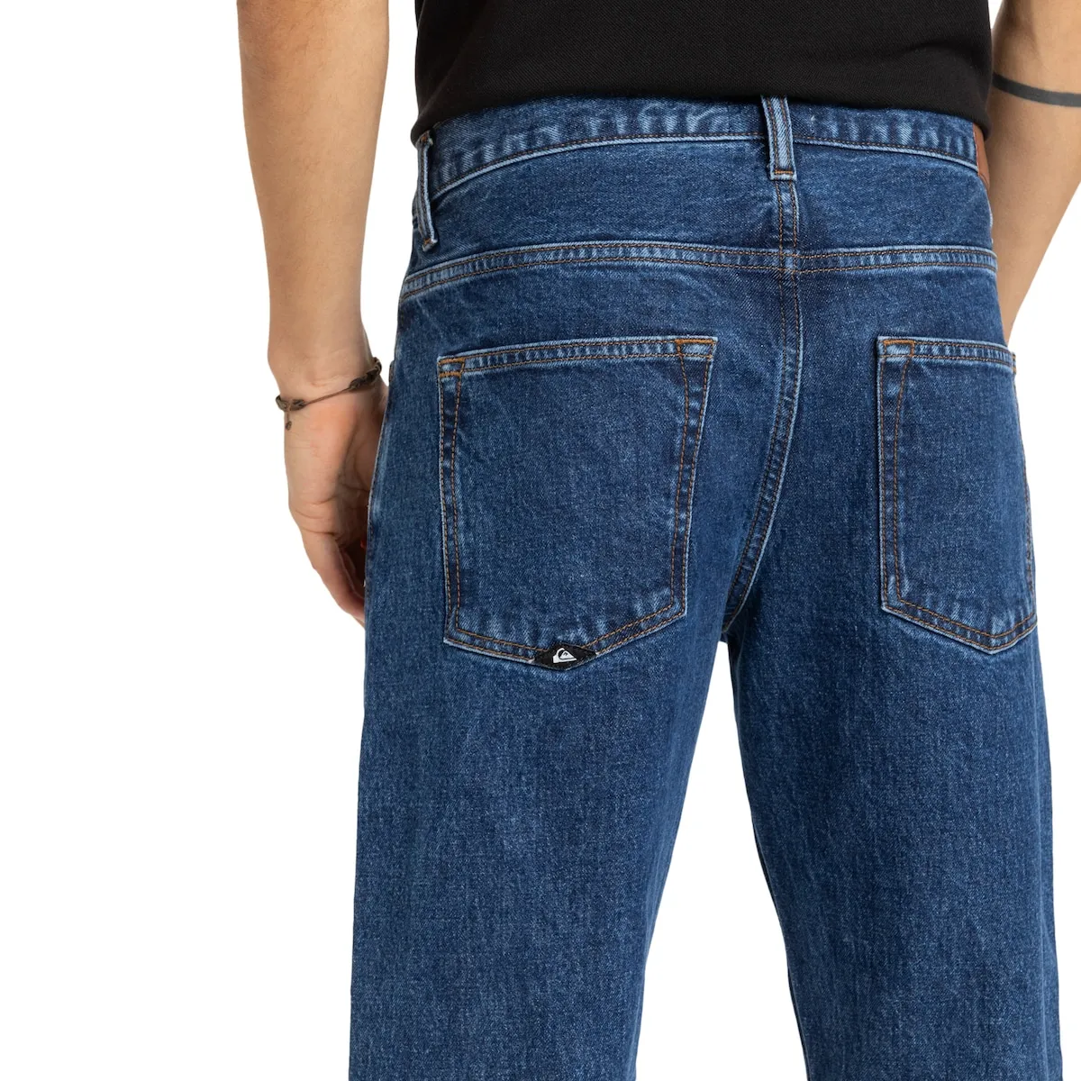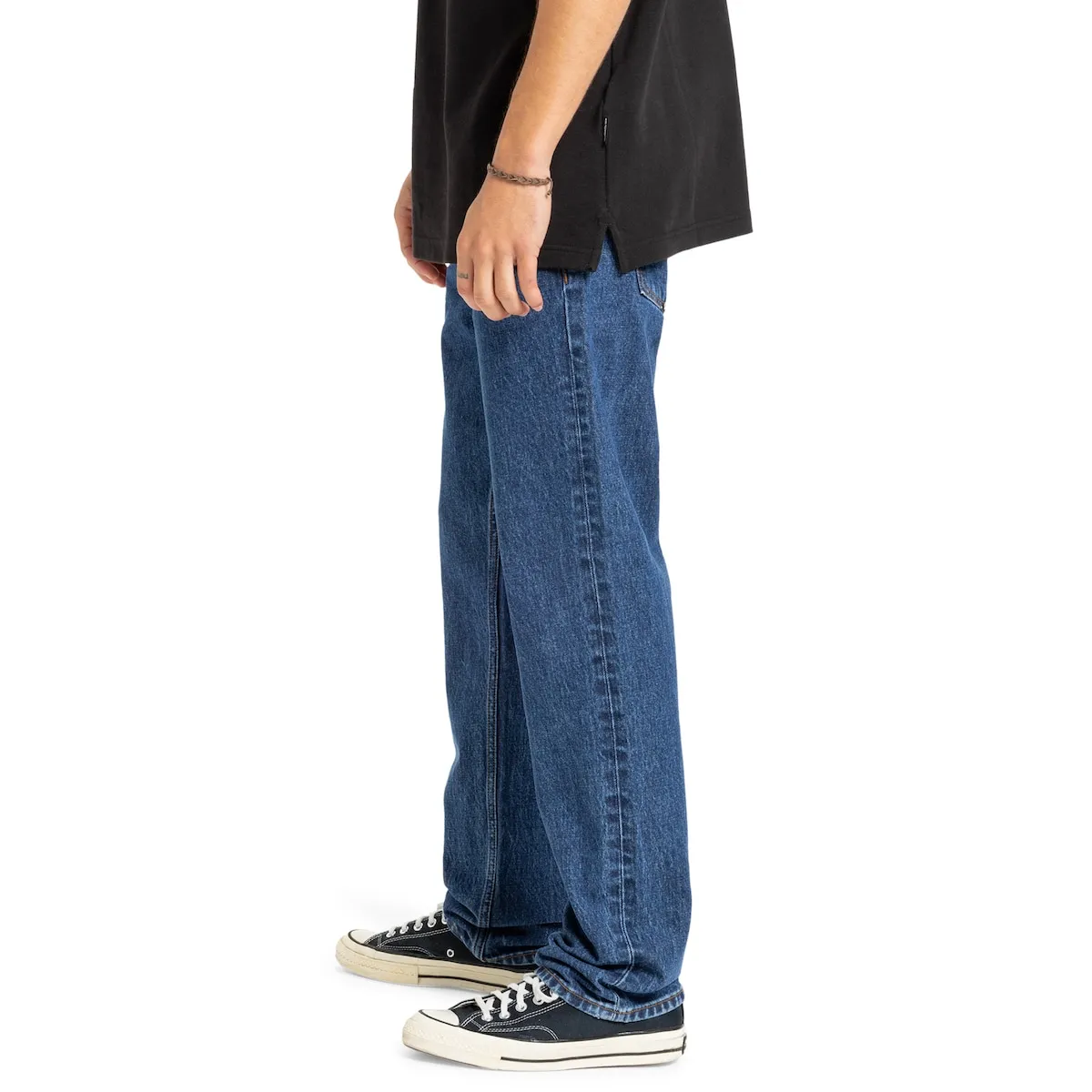 Джинсы для мужчин. Характеристики включают: Ткань: смесь хлопка и эластана [15 унций], Крой: обычный крой с небольшим объемом и прямой от колен до щиколоток, Стирка: средне-синий цвет, достигнутый через несколько процессов для винтажного вида, Бренд: ярлык на кармане для купюр, кожаная нашивка на задней части пояса, логотип на заднем кармане и другое: внутренний карман с принтом Denim Story.