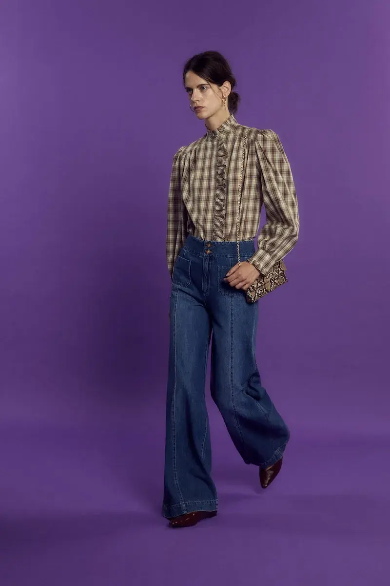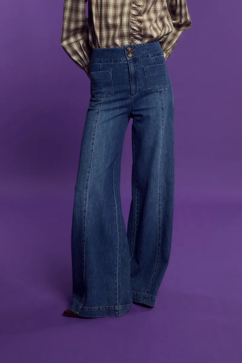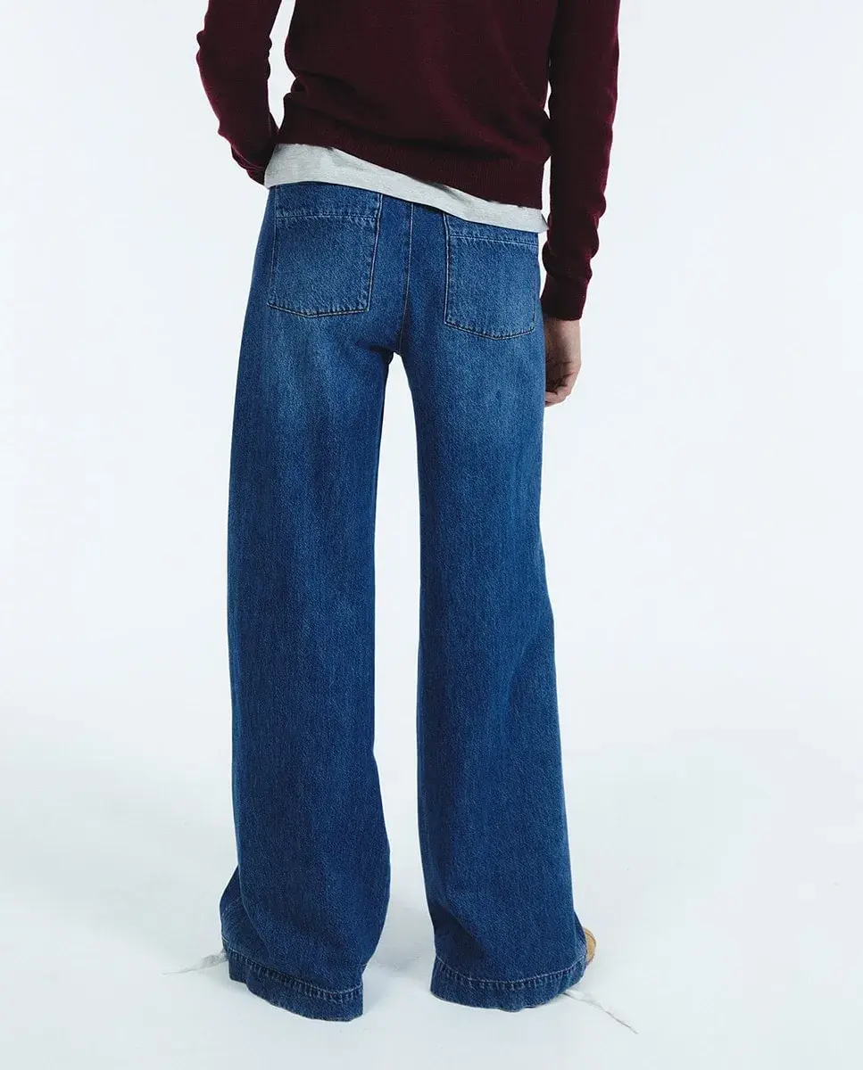Свободные джинсы широкого кроя с декоративными швами и передними карманами. Передняя застежка на молнию и двойную пуговицу. Материал: 100% хлопок.