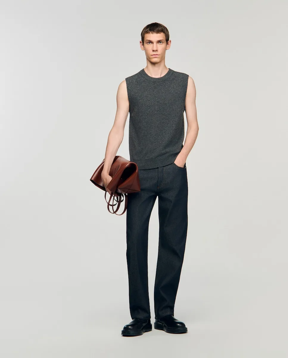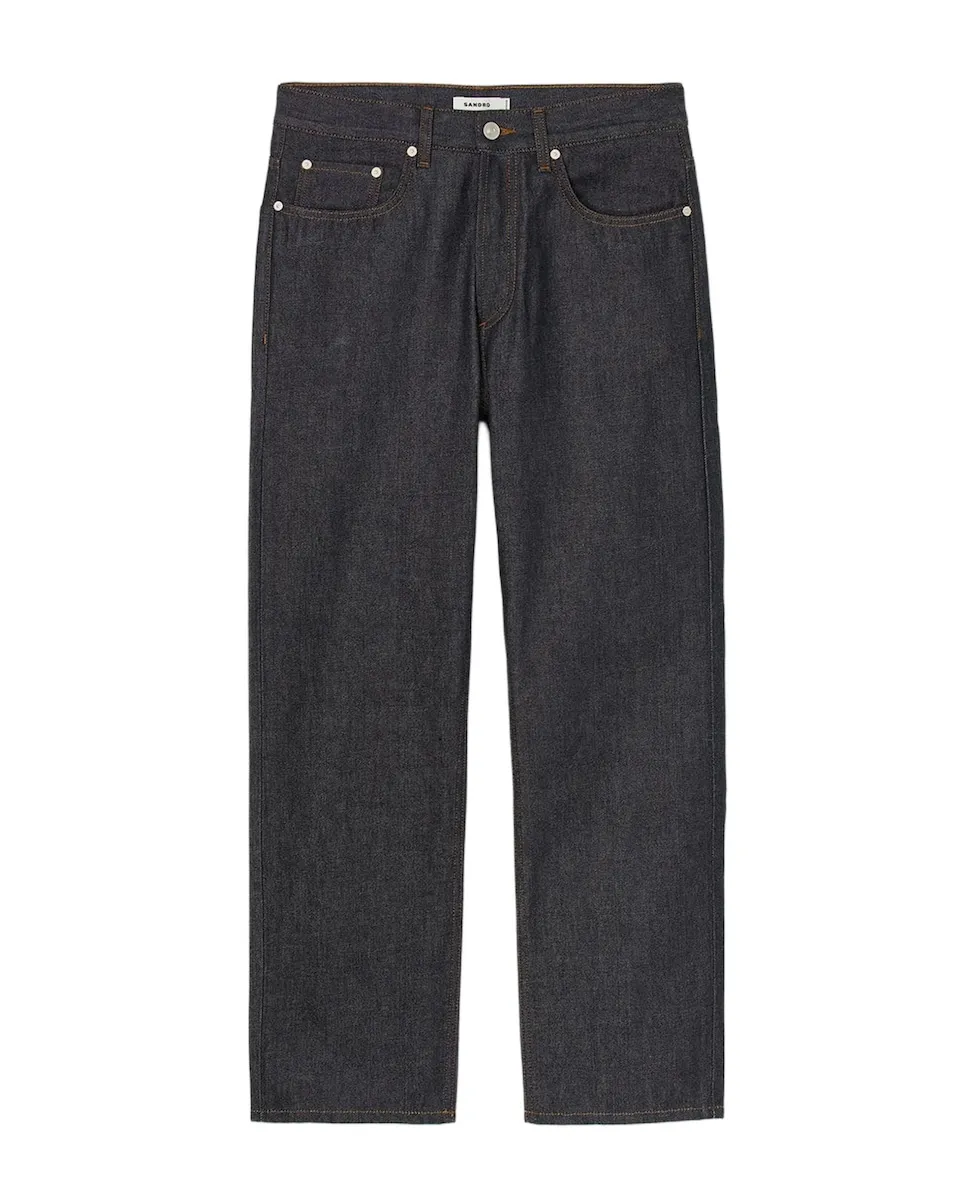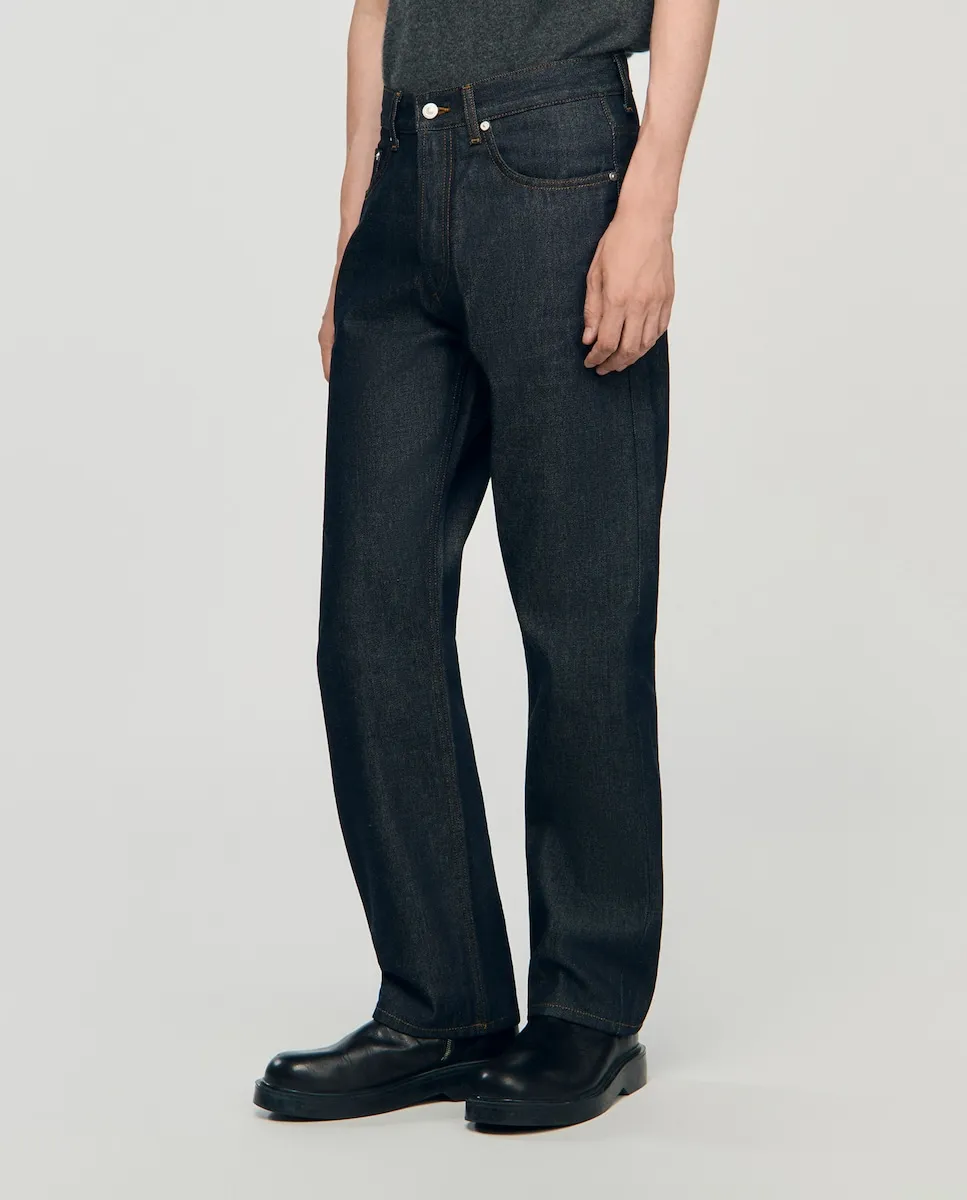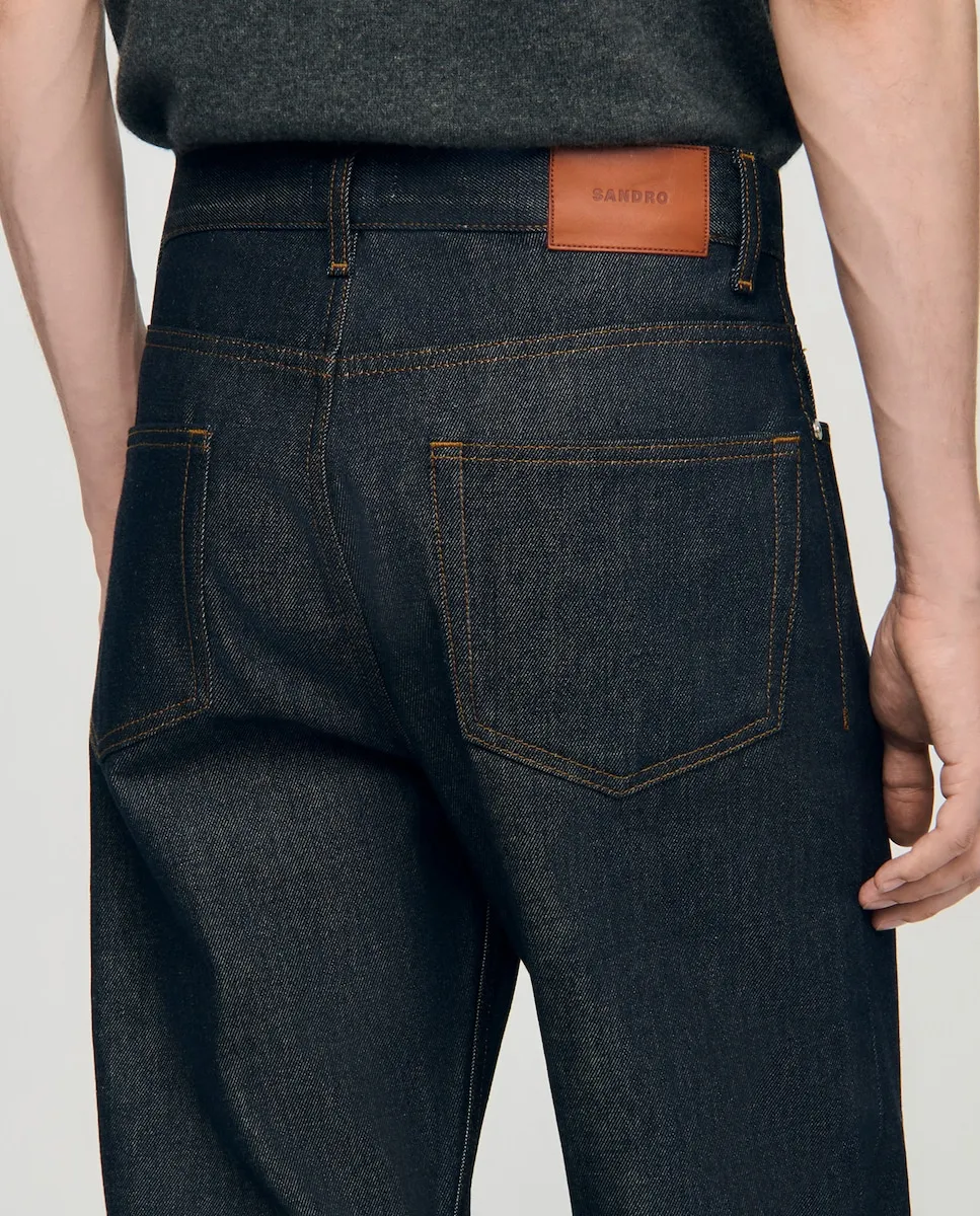 Регулярные джинсы из необработанного денима с пятью карманами и кожаной накладкой на спинке. Мужские джинсы Sandro из денима. Классический крой. 5 карманов. Кожаная накладка.