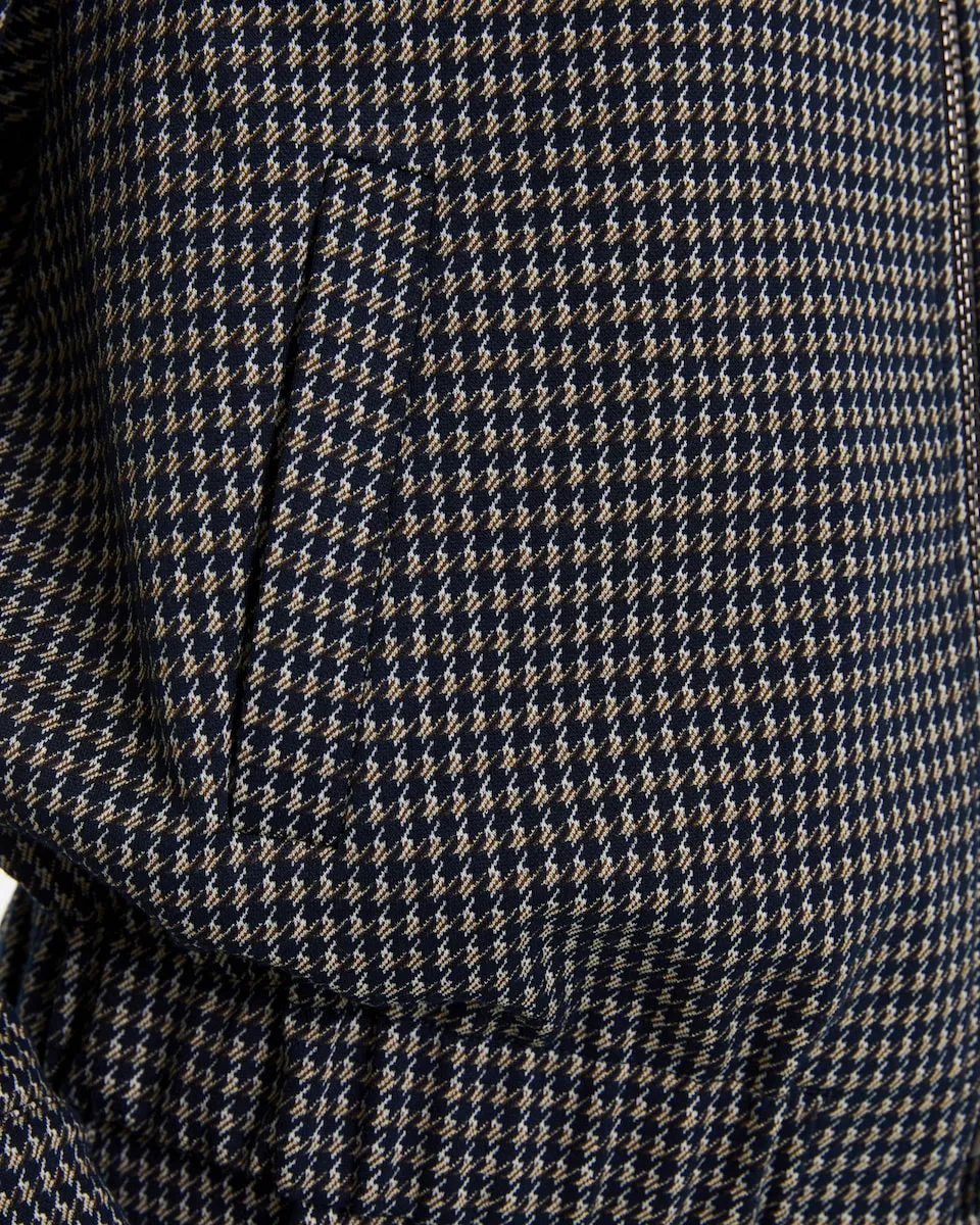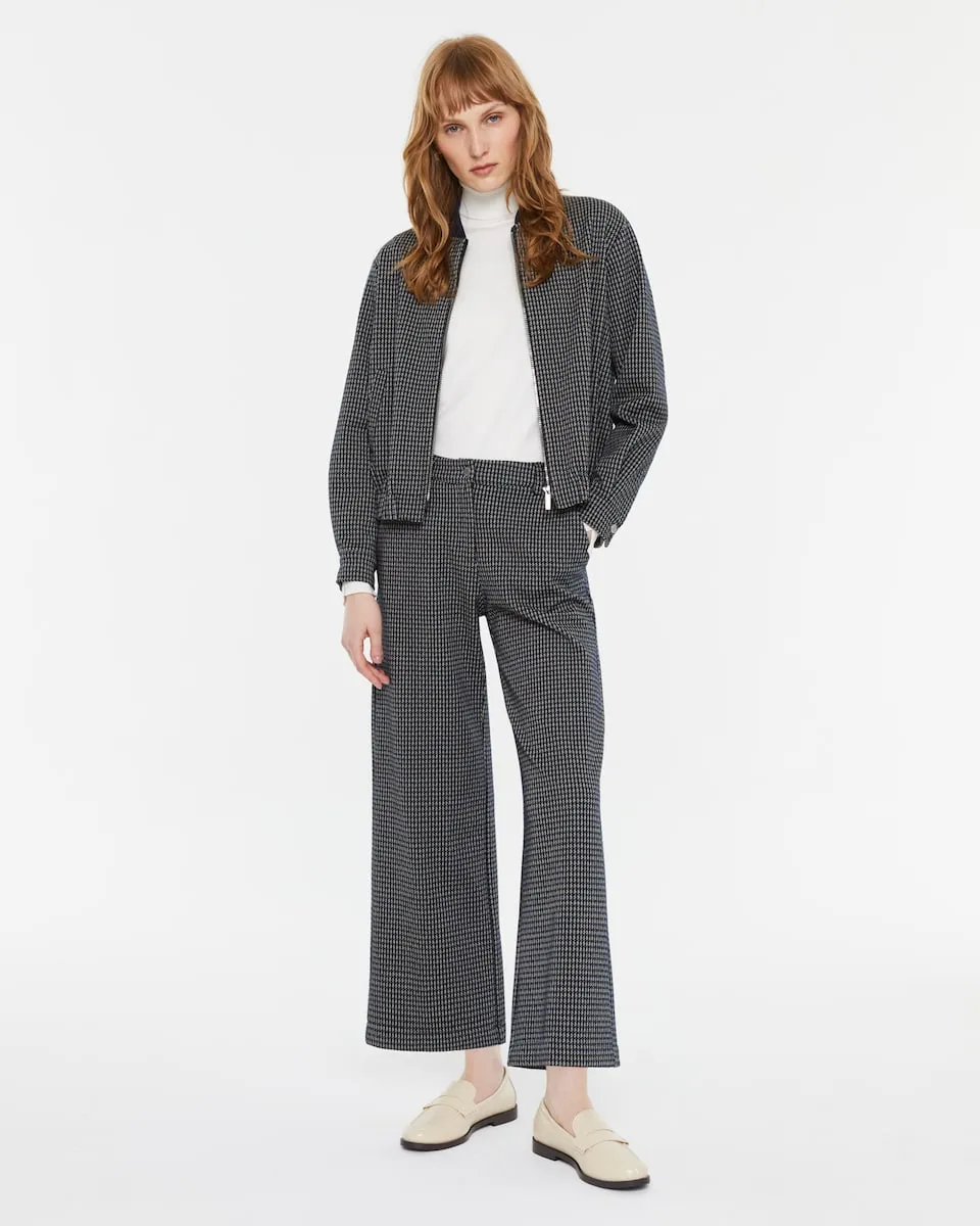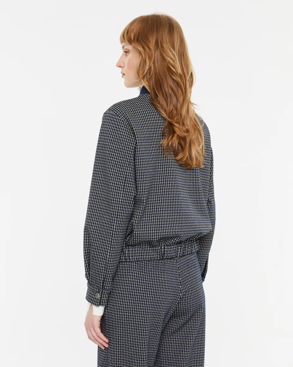 Куртка-бомбер из трикотажа с принтом в гусиную лапку, длинные рукава с манжетами и металлической кнопкой. Застежка спереди на металлическую молнию и эластичный пояс. Вы можете найти к ней подходящие брюки. Обычный фасон.