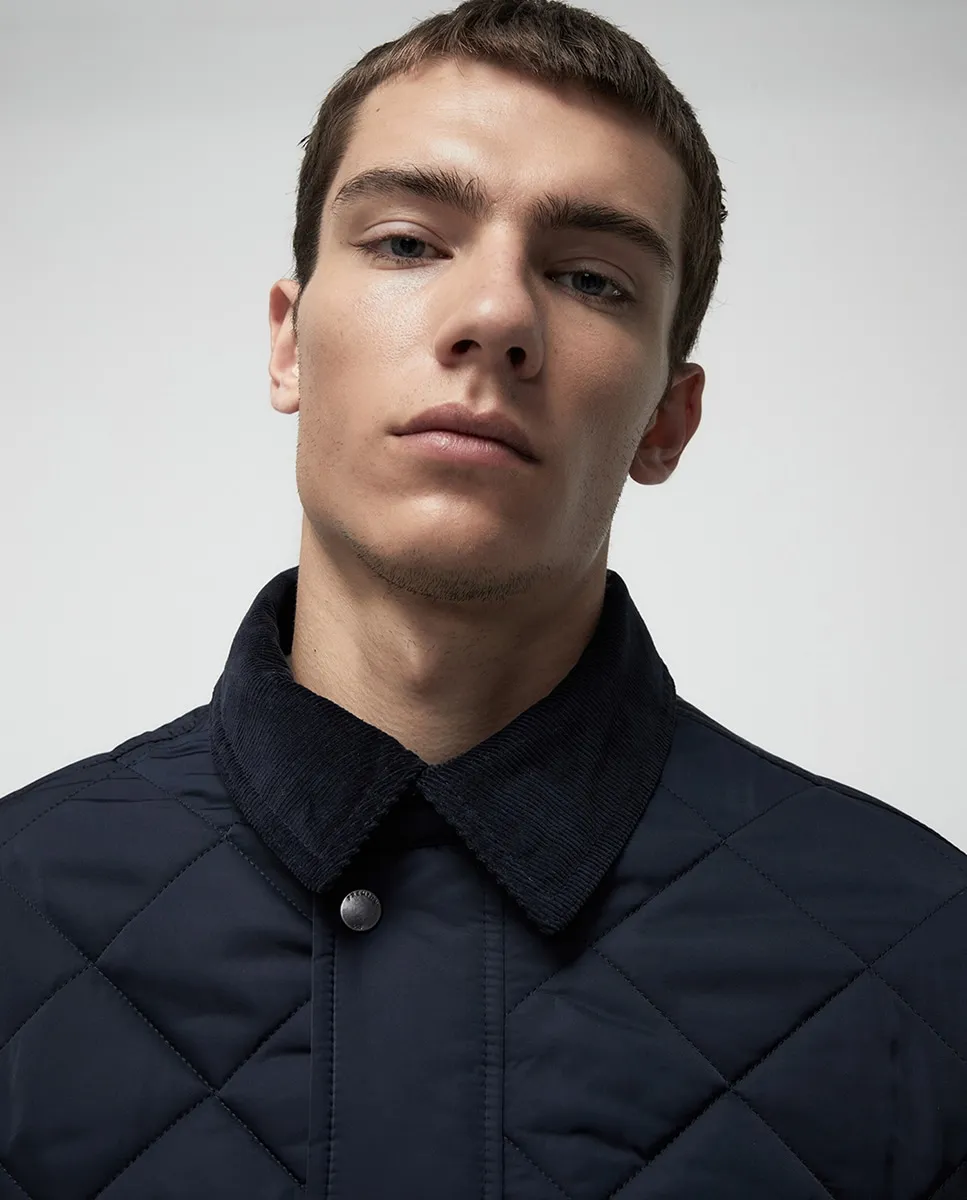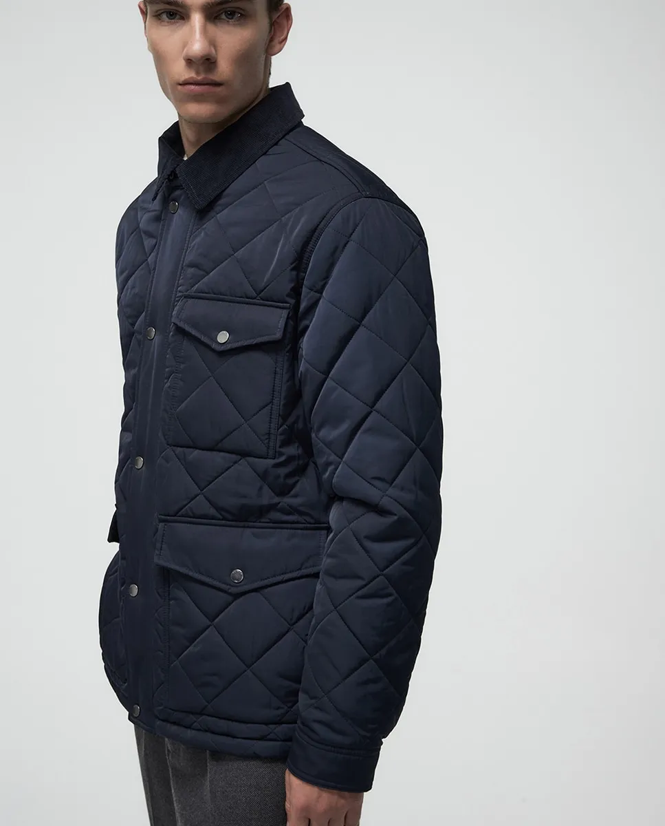 Стеганая куртка с застежкой-молнией и кнопками. Передние карманы. Деталь из вельветового воротника.