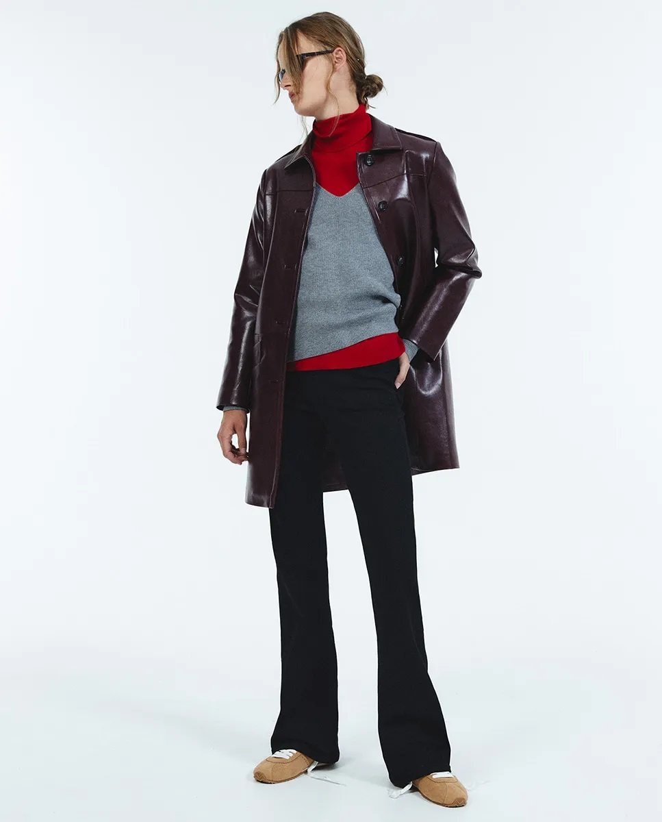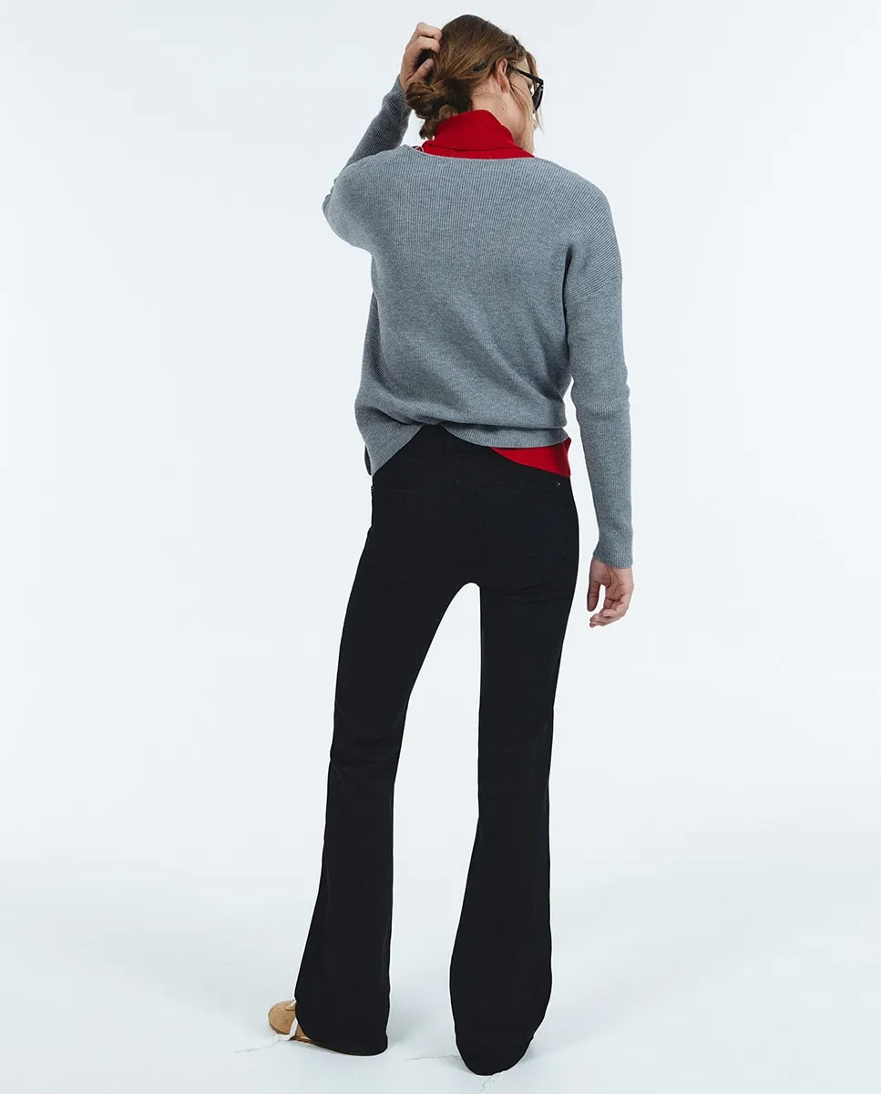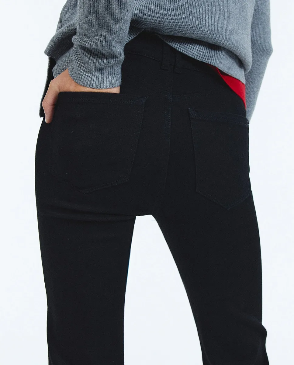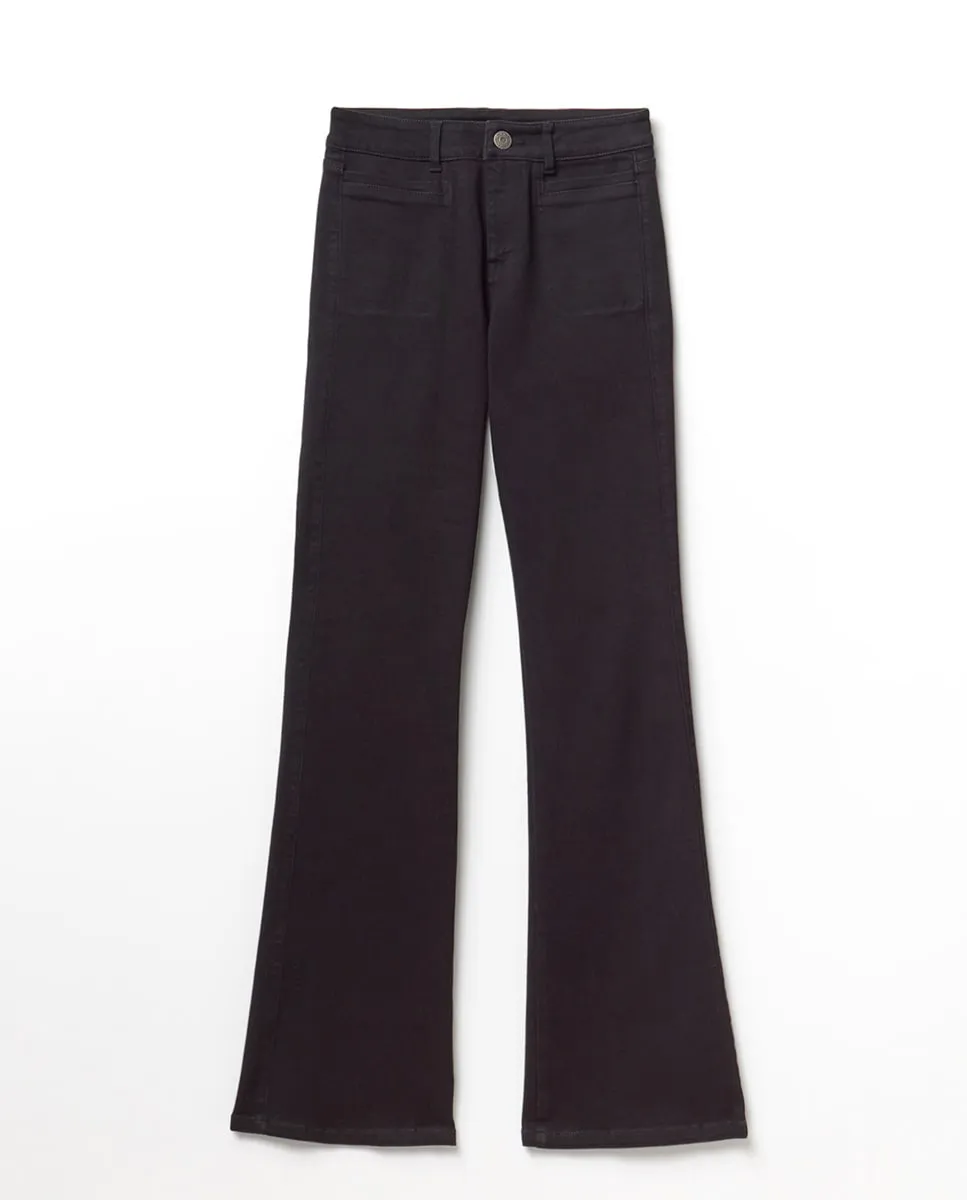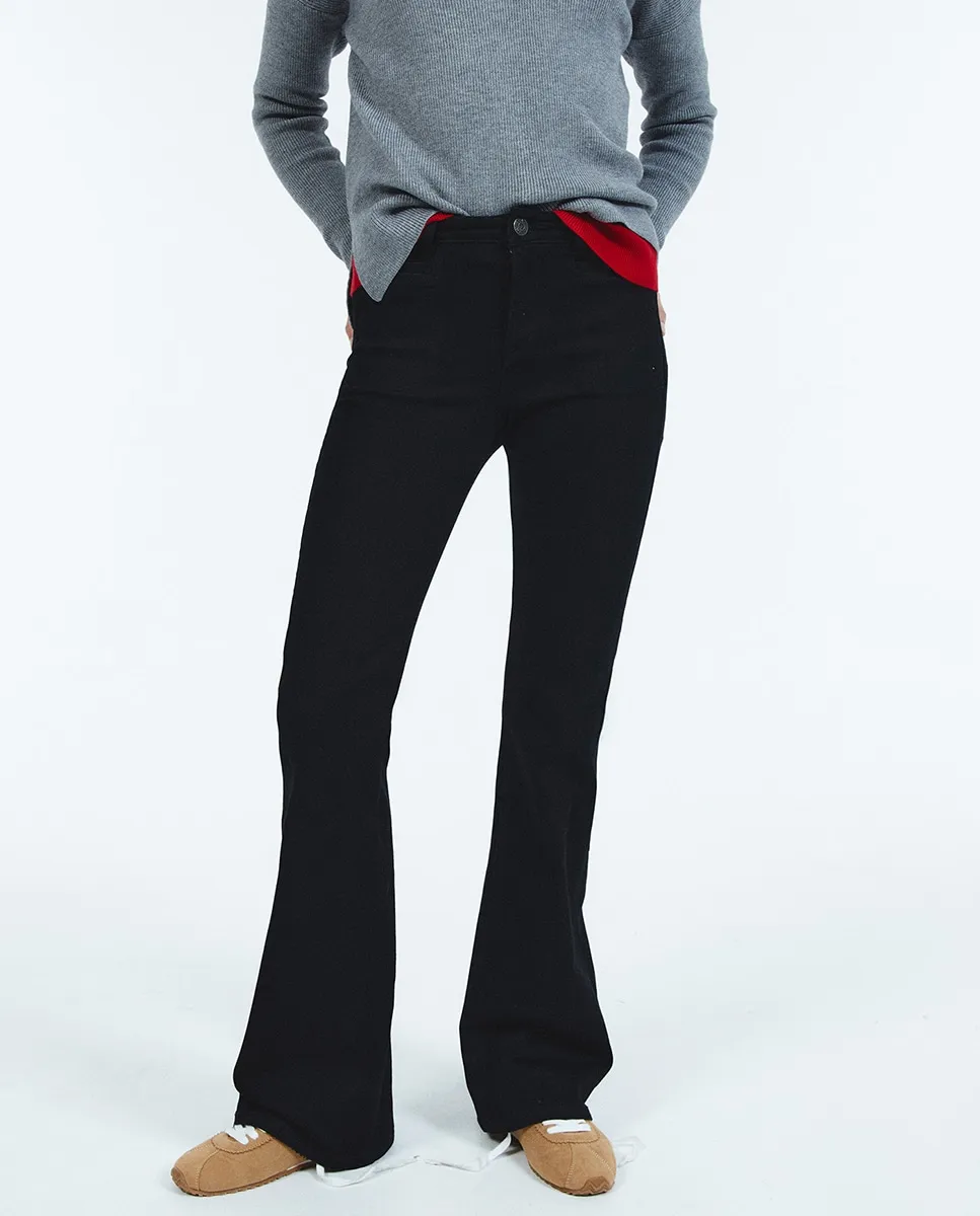 Обтягивающие джинсы с расклешенными штанинами. Видимые карманы, скрытая застежка-молния и пуговица