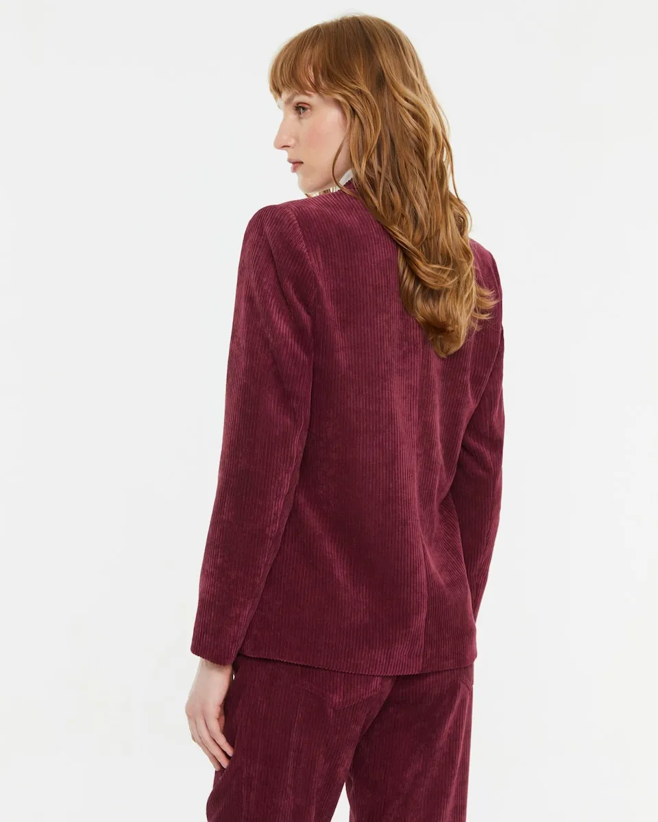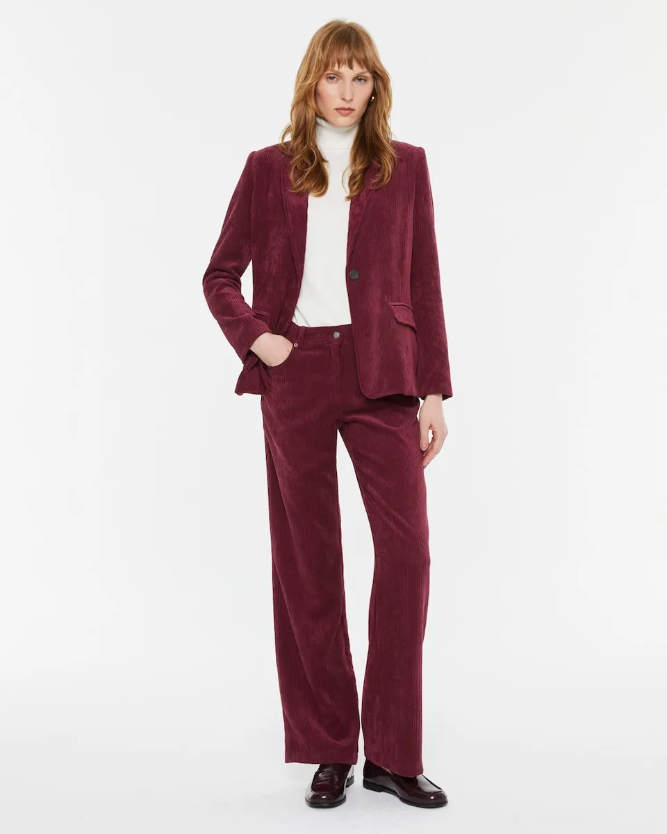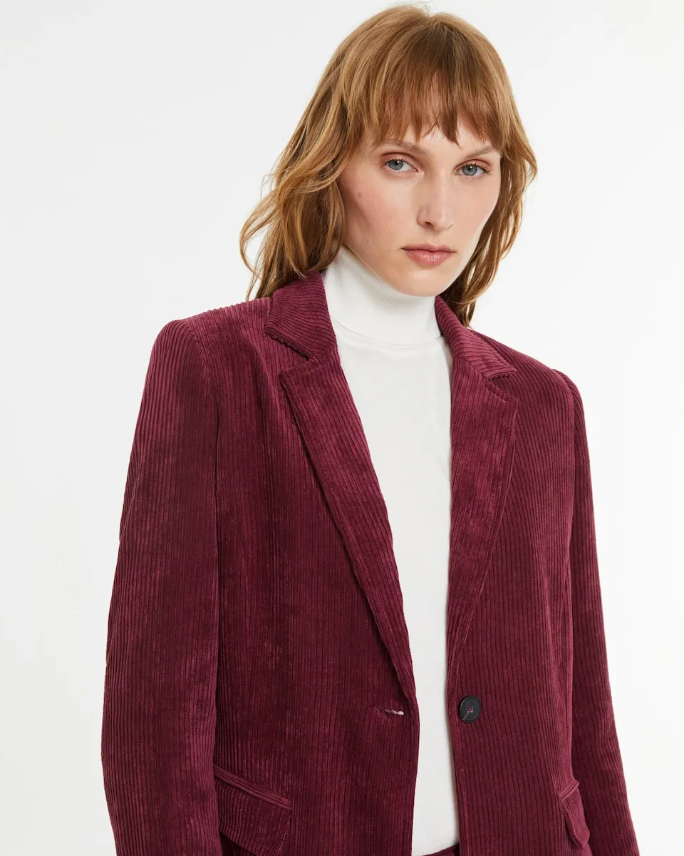 Блейзер из вельвета, с длинными рукавами и лацканами. Передняя застежка на одну кнопку и накладные карманы. Можно подобрать брюки в комплект. Прямой крой.