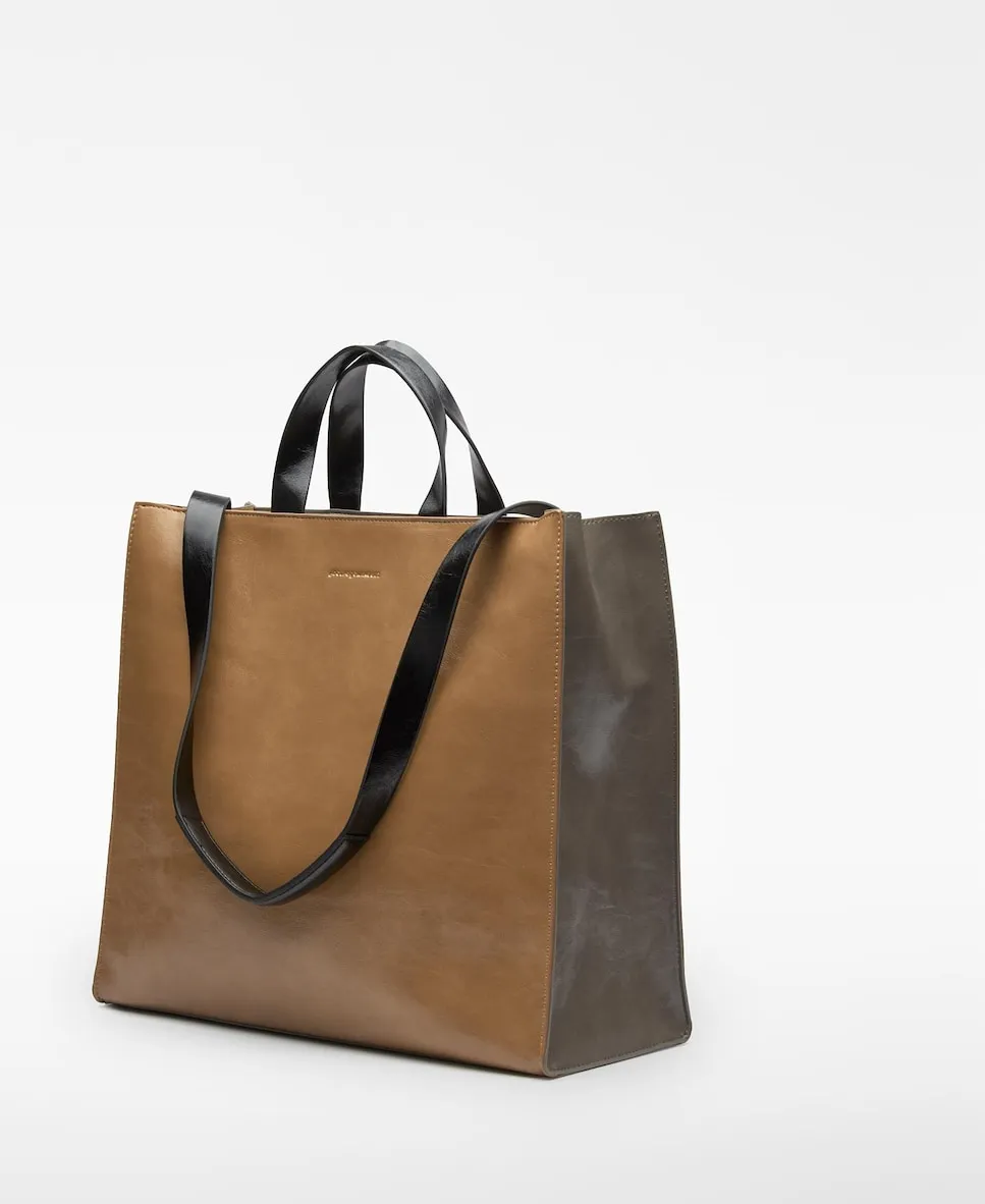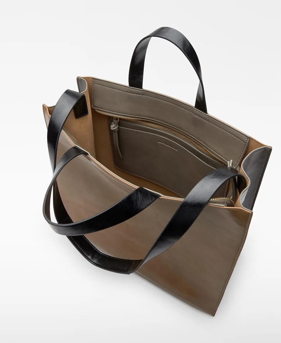 Большая трехцветная сумка-шоппер из кожи и кожзаменителя. С блестящей отделкой и текстурой «кракле», имеет квадратную форму, одно отделение, внутренний клапан на молнии, внутренний карман, ручку для руки, длинный ремень с плечевой накладкой и тисненый логотип.