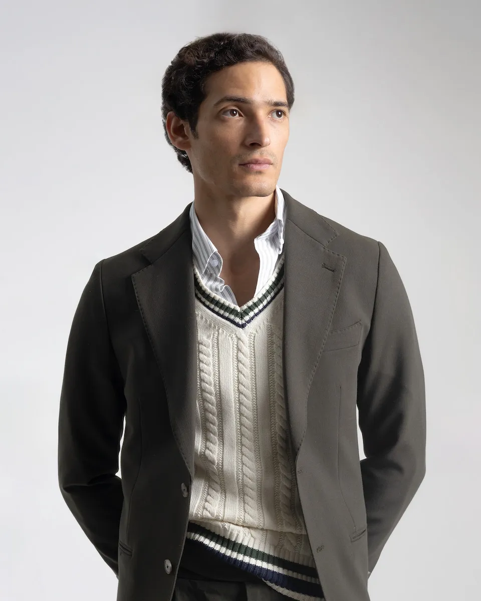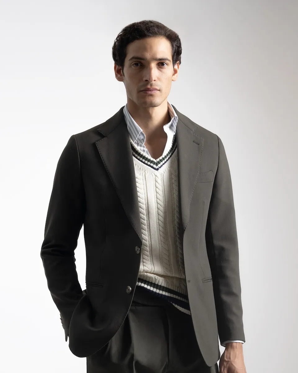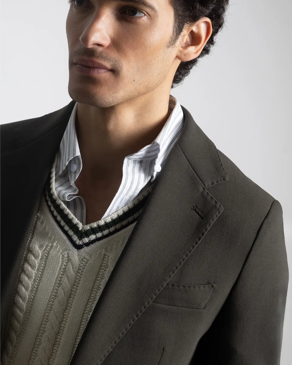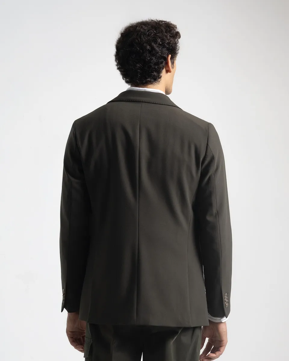 Пиджак класса slim fit, выполненный из структурированной ткани с добавлением шерсти. Модель оснащена двумя задними разрезами, рукавами с контрастными пуговицами и неструктурированными плечами для более расслабленного образа. Внутри подкладка. Незаменимый элемент линии Tailored, сочетающий классический крой с современными деталями в универсальном цвете хаки.