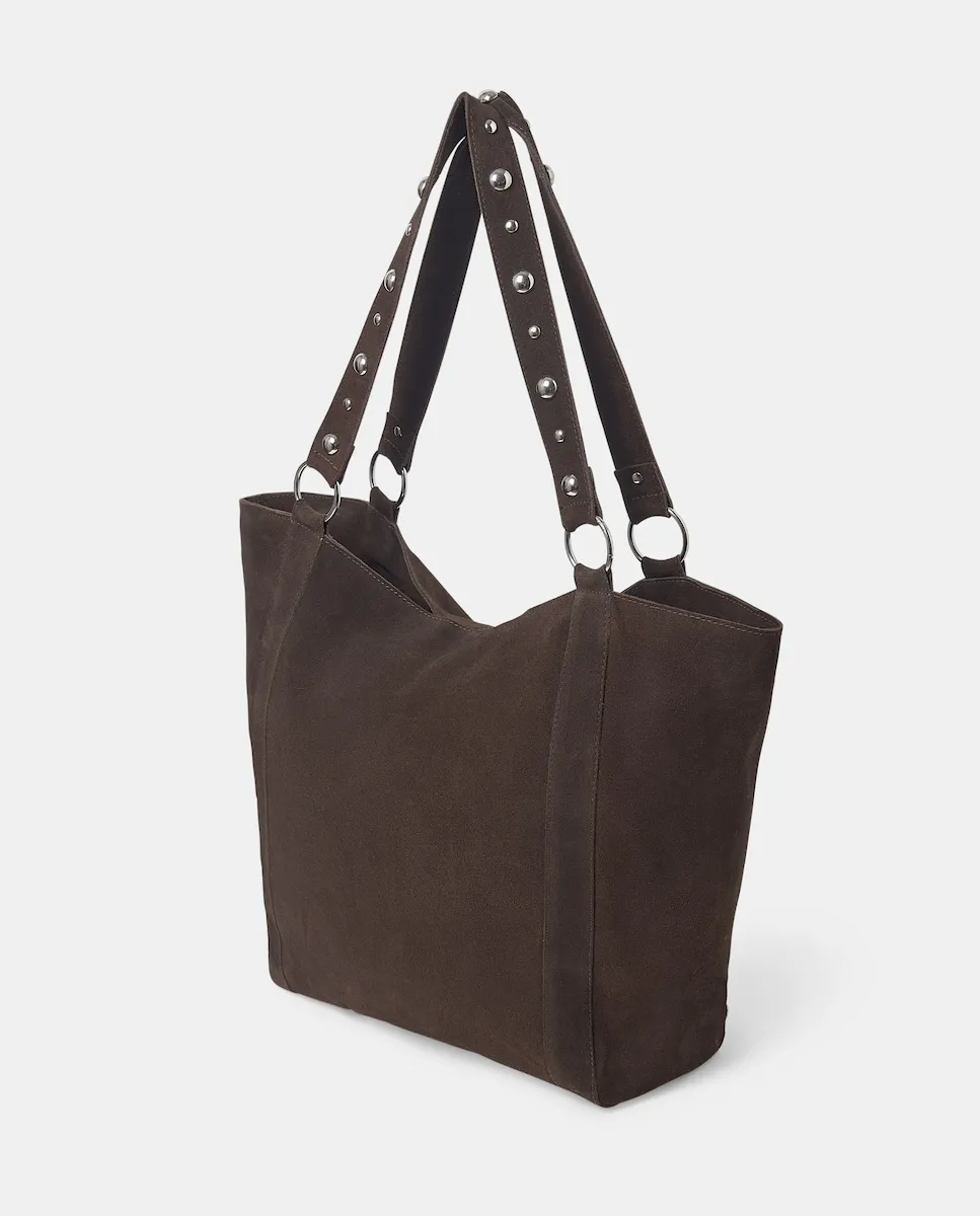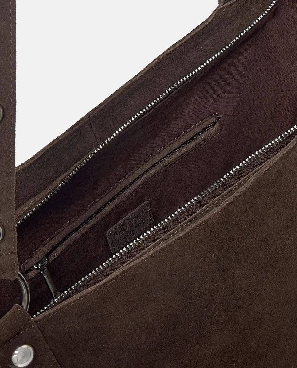 Кожаная сумка через плечо коричневого цвета с заклепками.