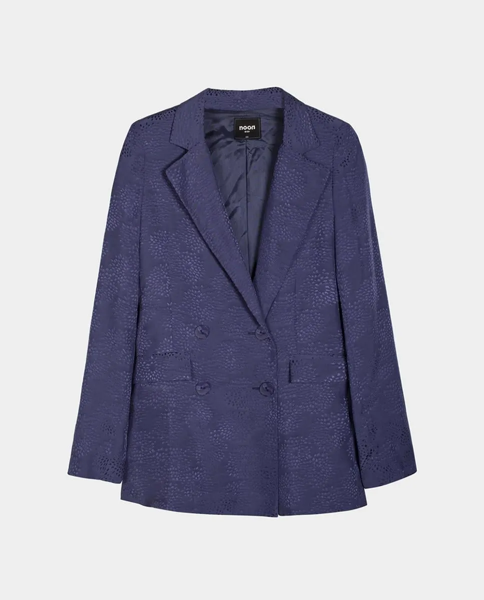 Блейзер с отложным воротником и длинными рукавами. Передние карманы с клапанами. Деталь застежки спереди с перекрестной планкой и пуговицами.