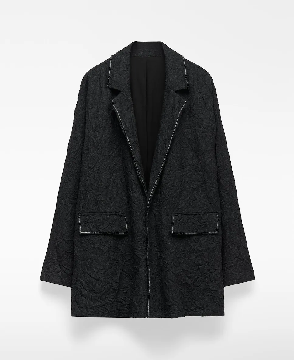 Распущенный пиджак с эффектом смятия. С длинными рукавами, застежкой на пуговицы, прорезными карманами с клапанами спереди, разрезом на спине и контрастной декоративной строчкой. Размер больше обычного.