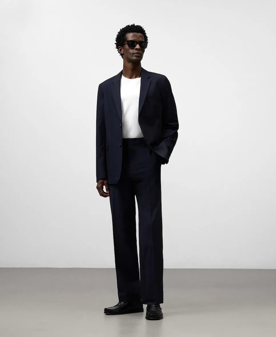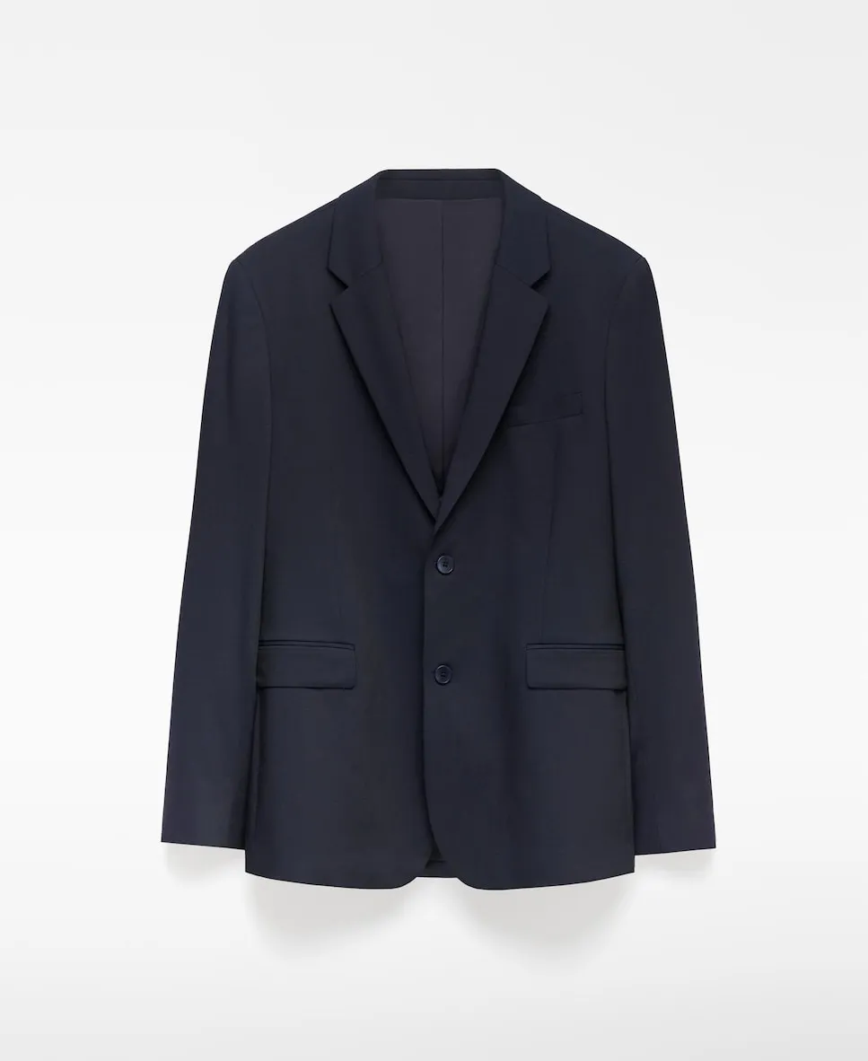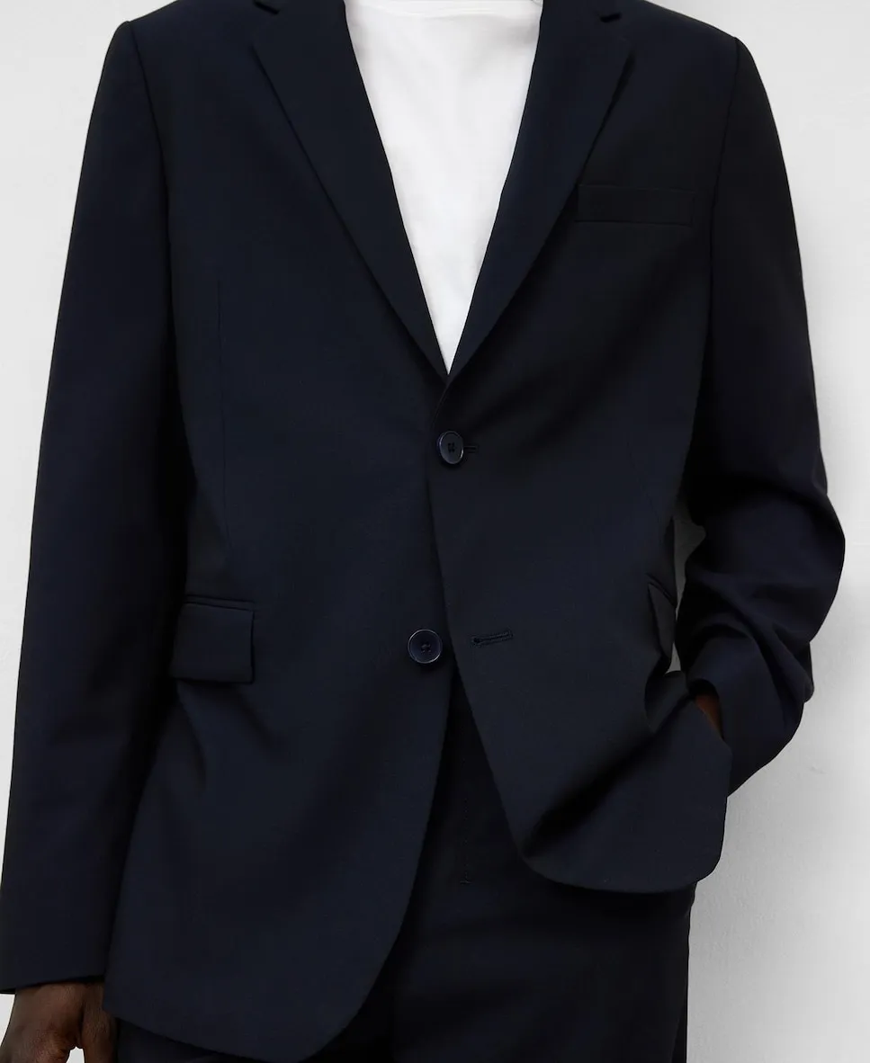 Классический пиджак прямого кроя с лацканами. Имеет длинные рукава с пуговицами на манжетах, застежку на две пуговицы спереди, прорезные карманы с клапанами спереди, прорезной карман на груди и внутренние прорезные карманы.