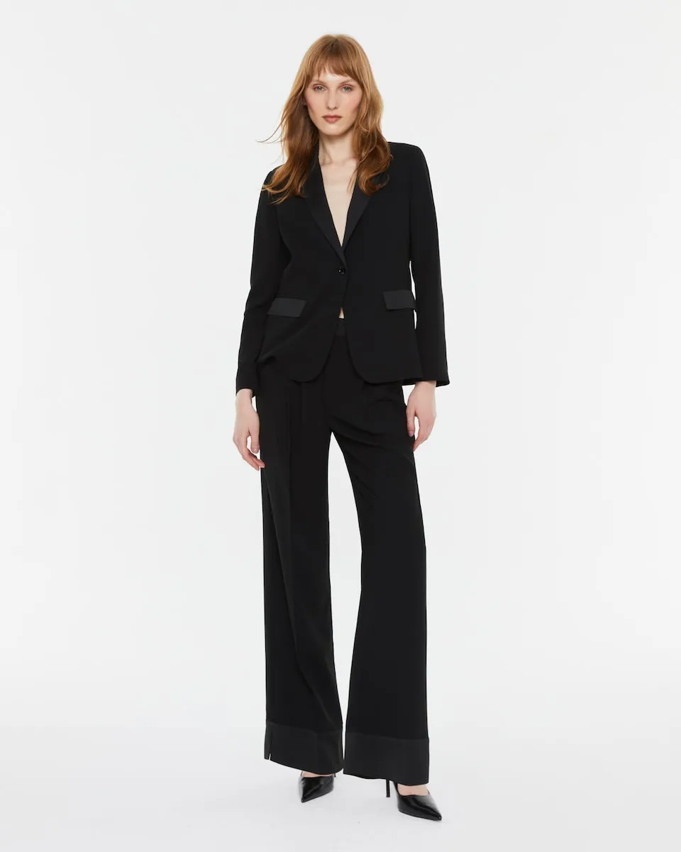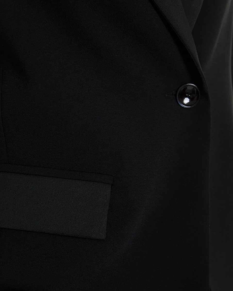 Блейзер с длинными рукавами и отложным воротником. Планки карманов и воротник выполнены из той же ткани, но с атласной стороны. Вы можете подобрать к нему подходящие брюки. Прямой крой.