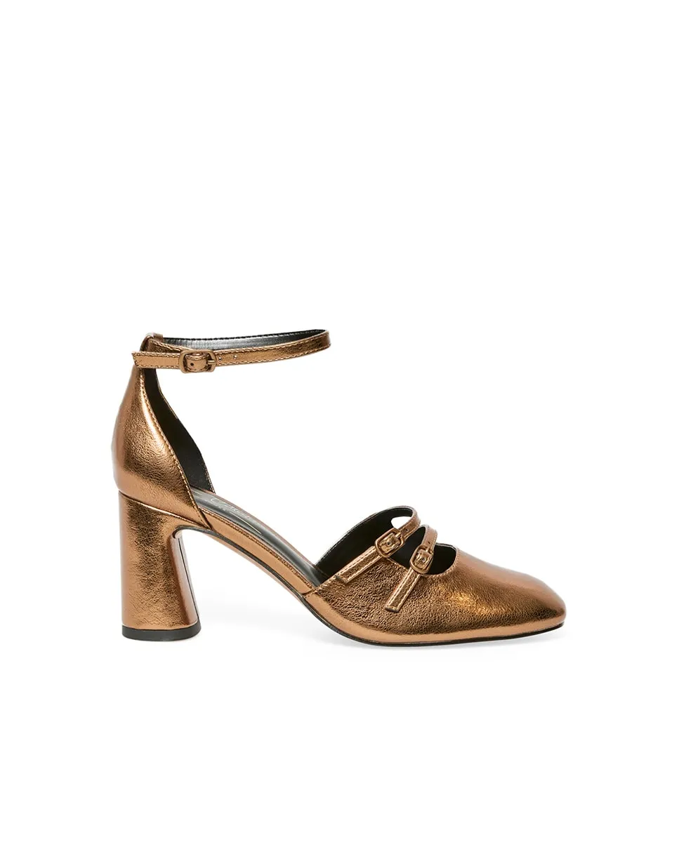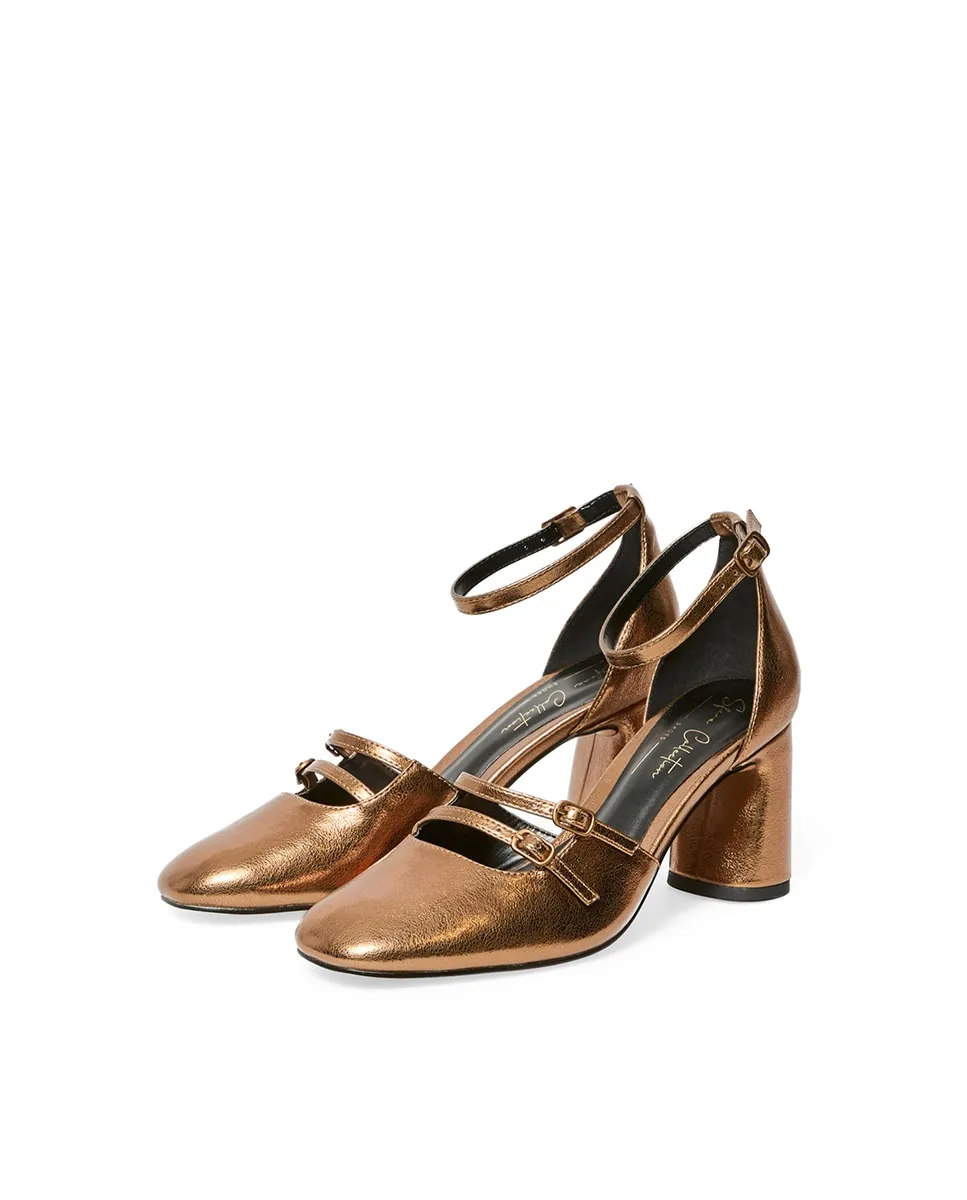 Ботинки типа Мэри Джейн на среднем каблуке с круглым носком. Детали с пряжками спереди. Застежка на щиколотке с пряжкой.