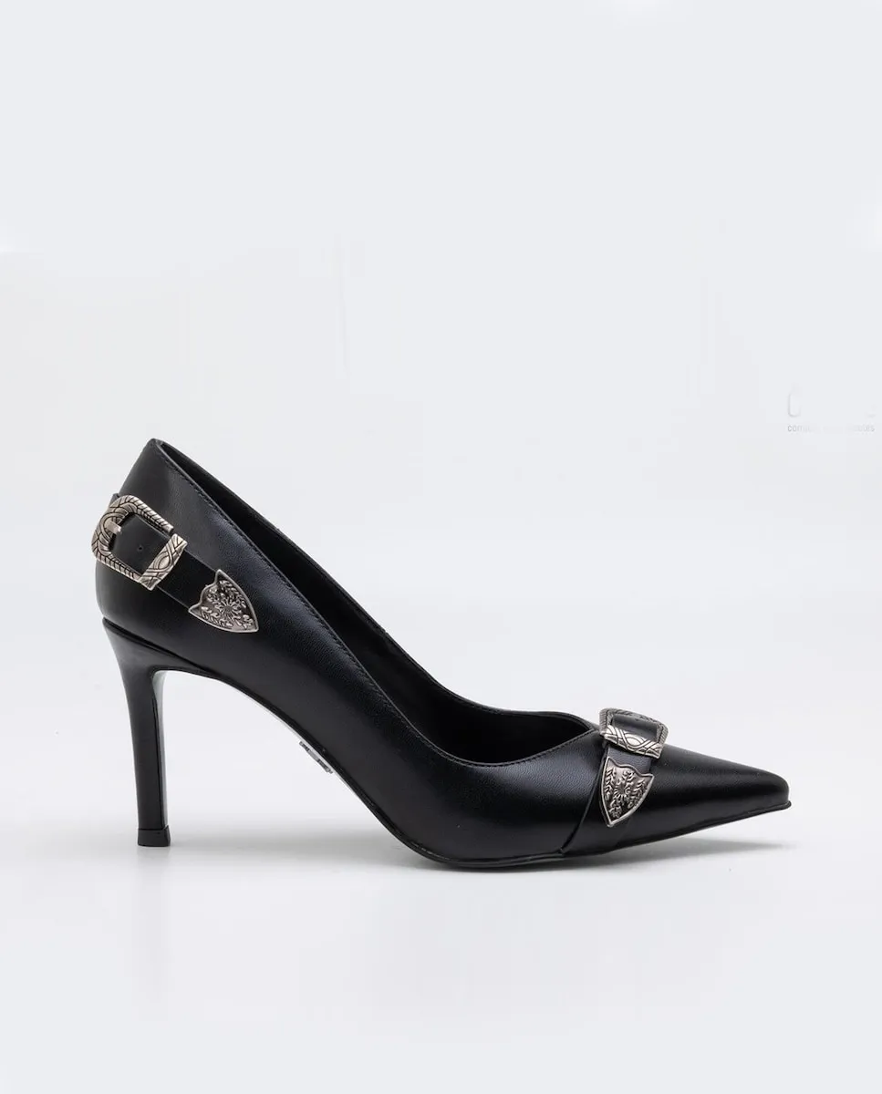 Туфли на каблуке черного цвета. С задней и передней пряжкой серебристого цвета.