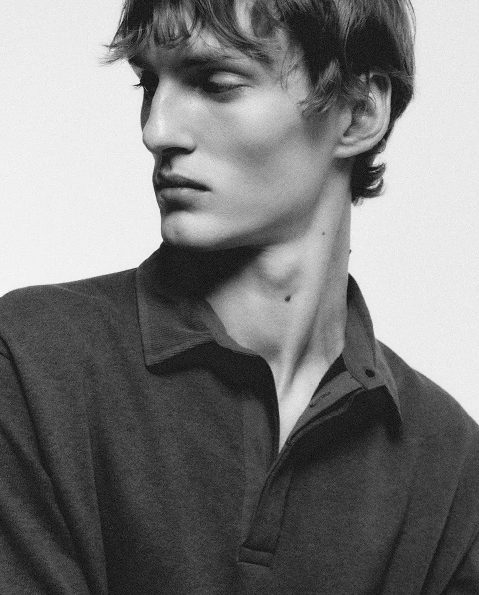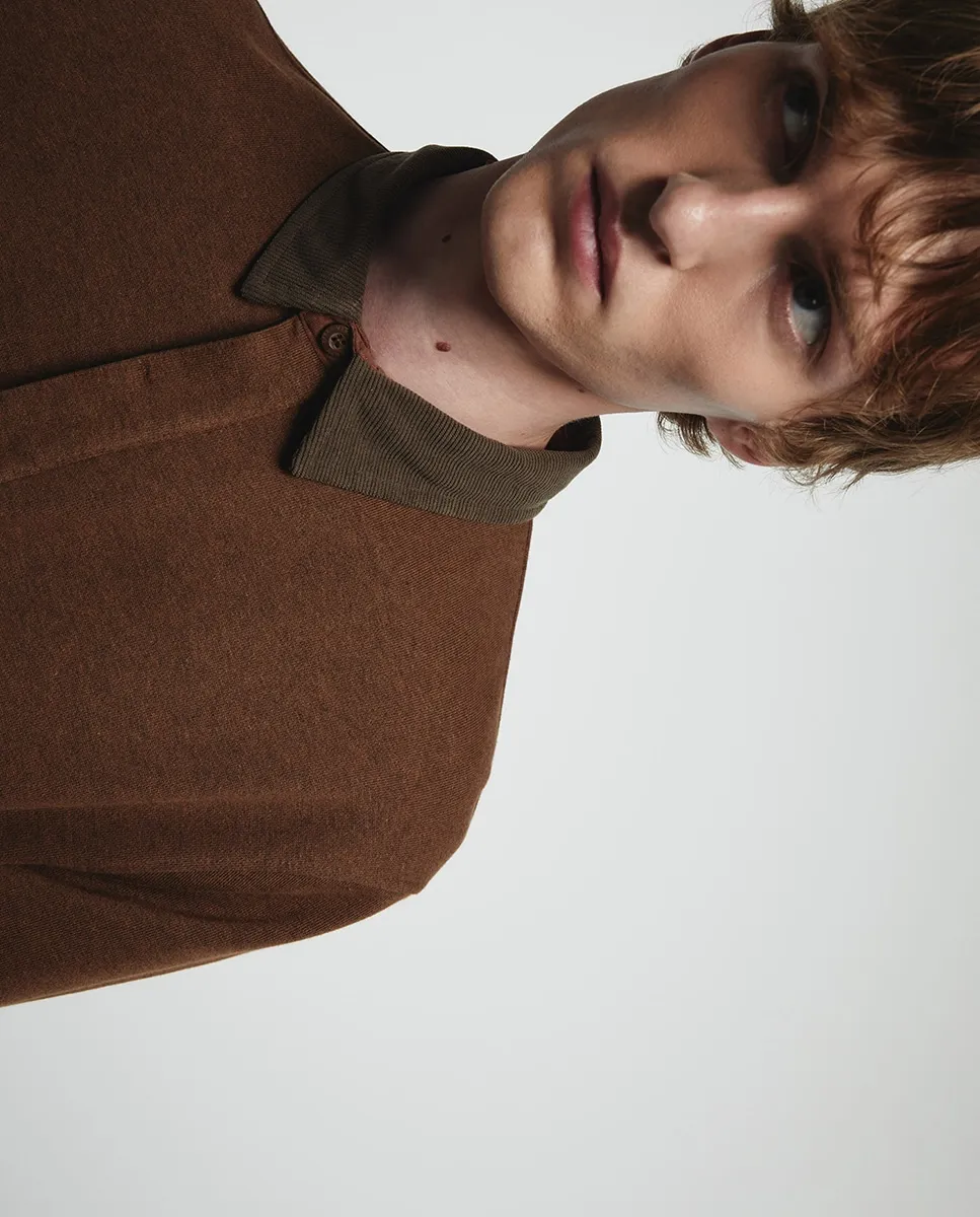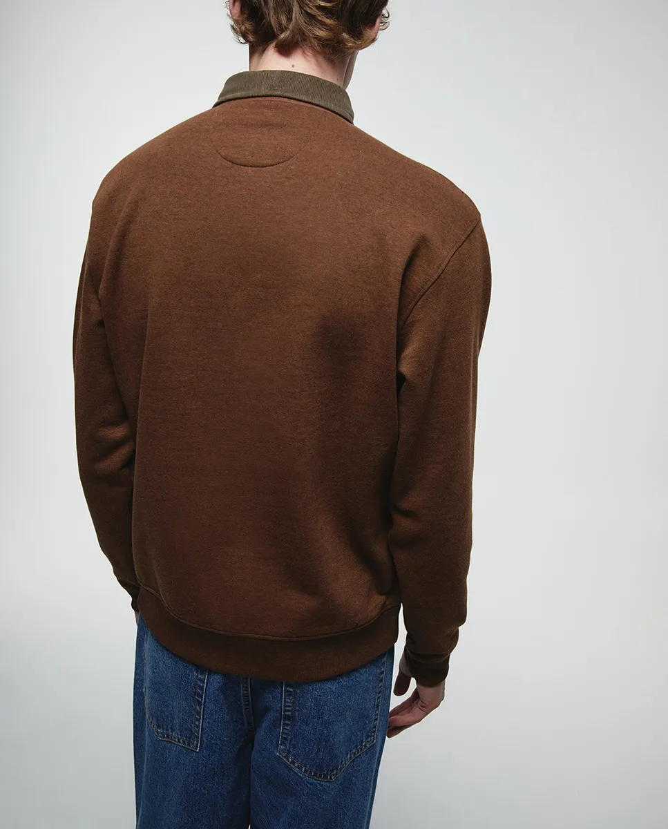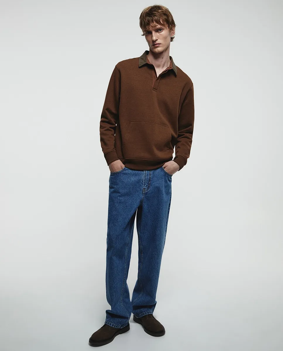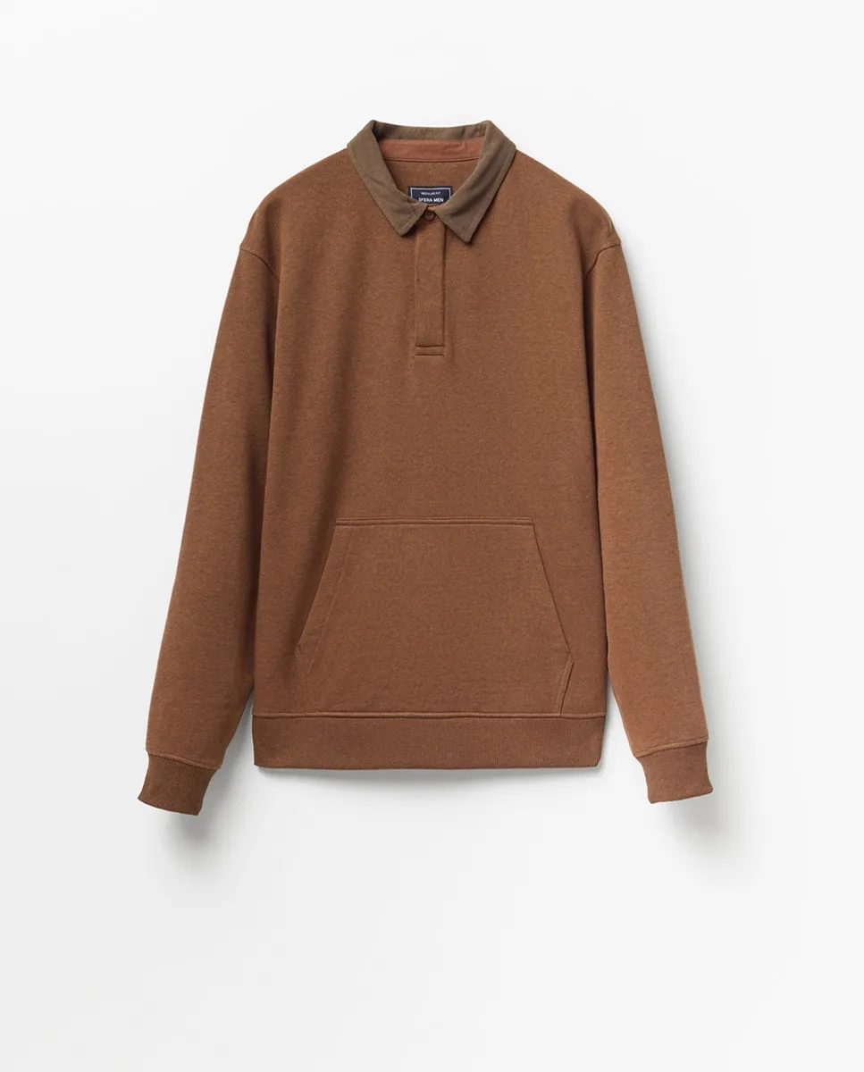 Свитшот с длинными рукавами, воротником поло контрастного цвета и передним карманом