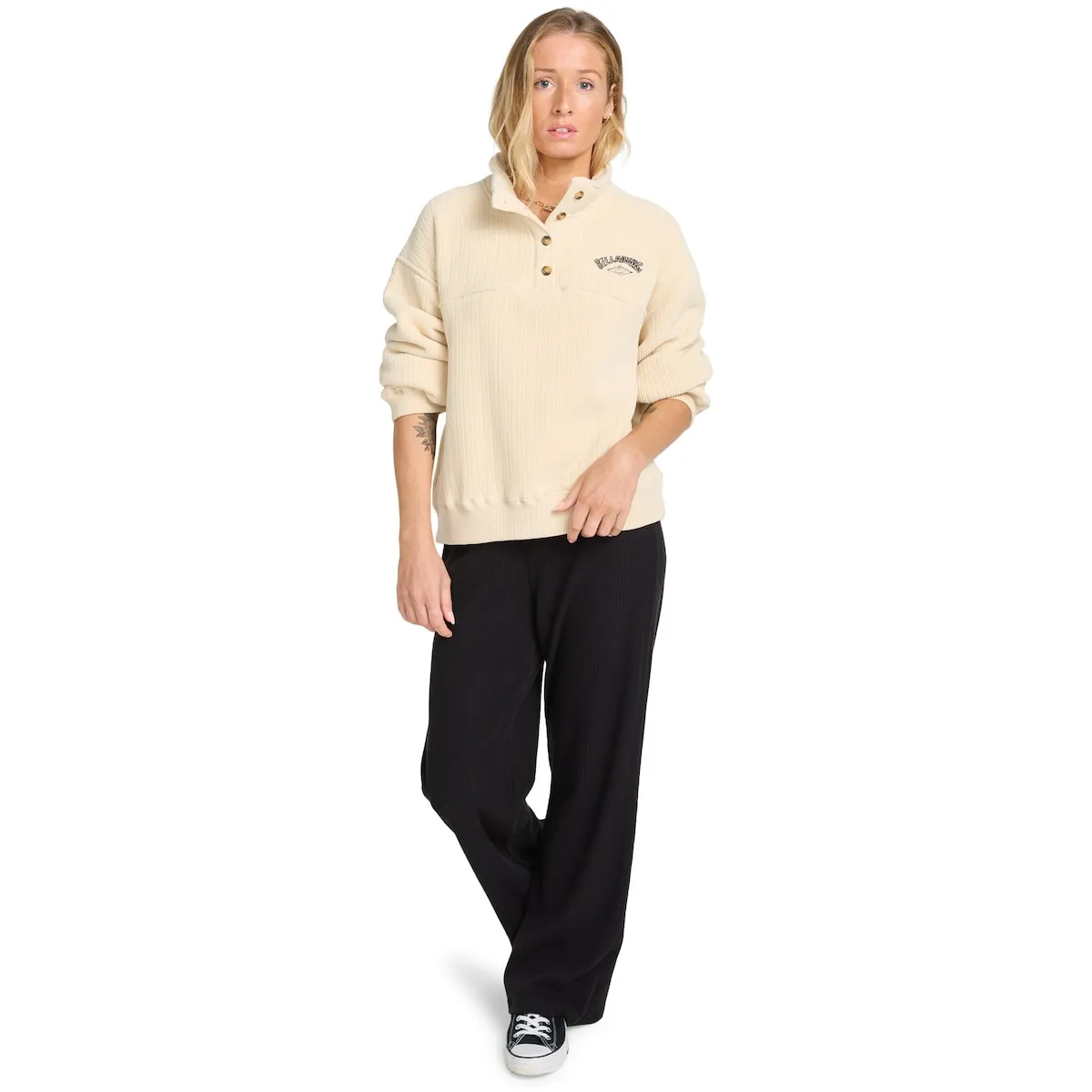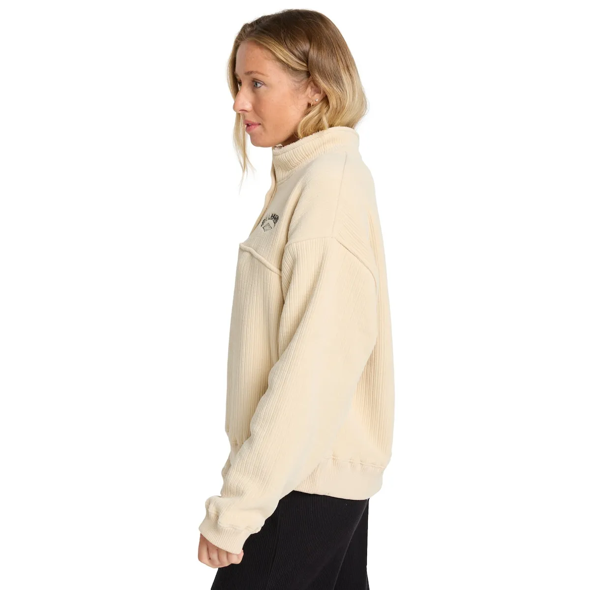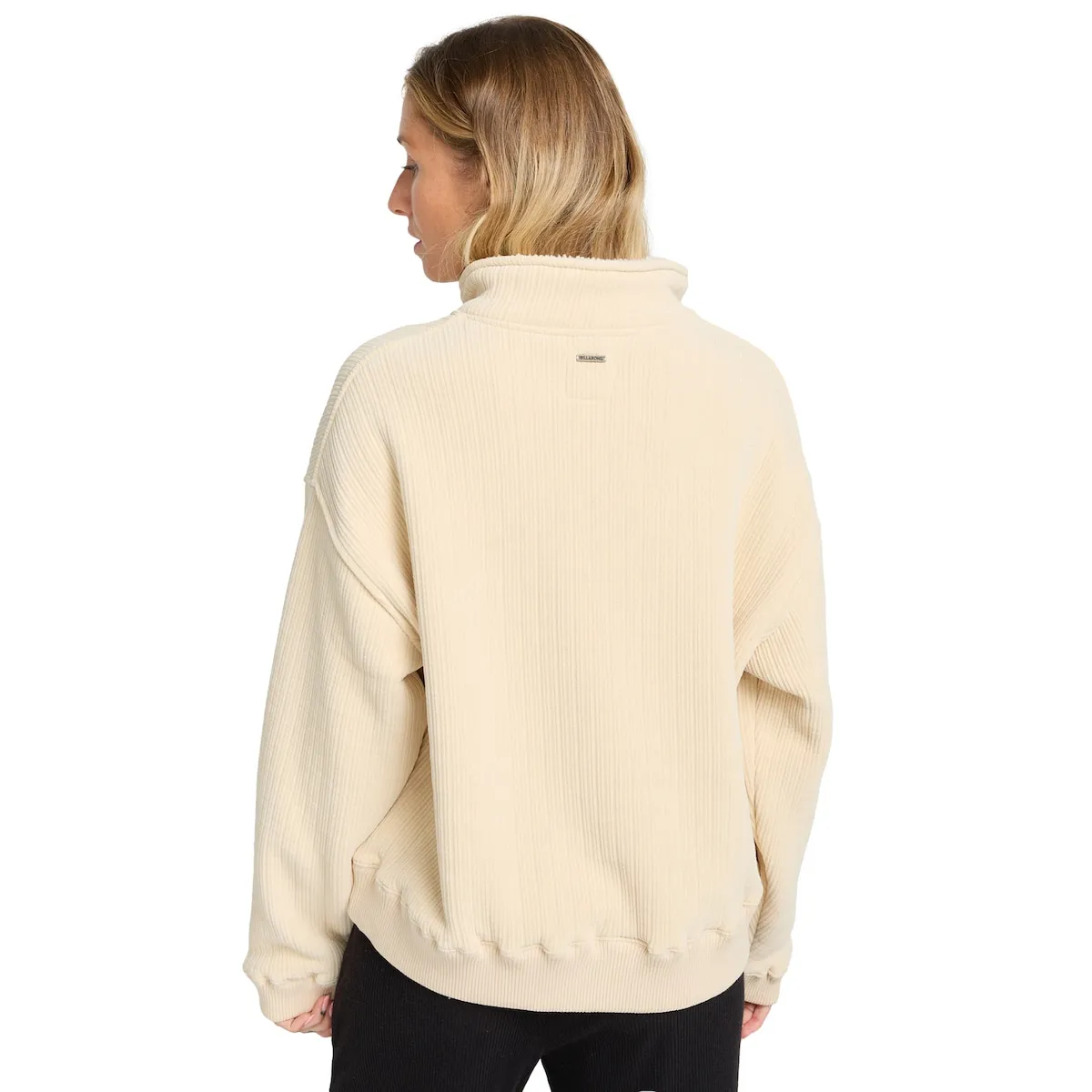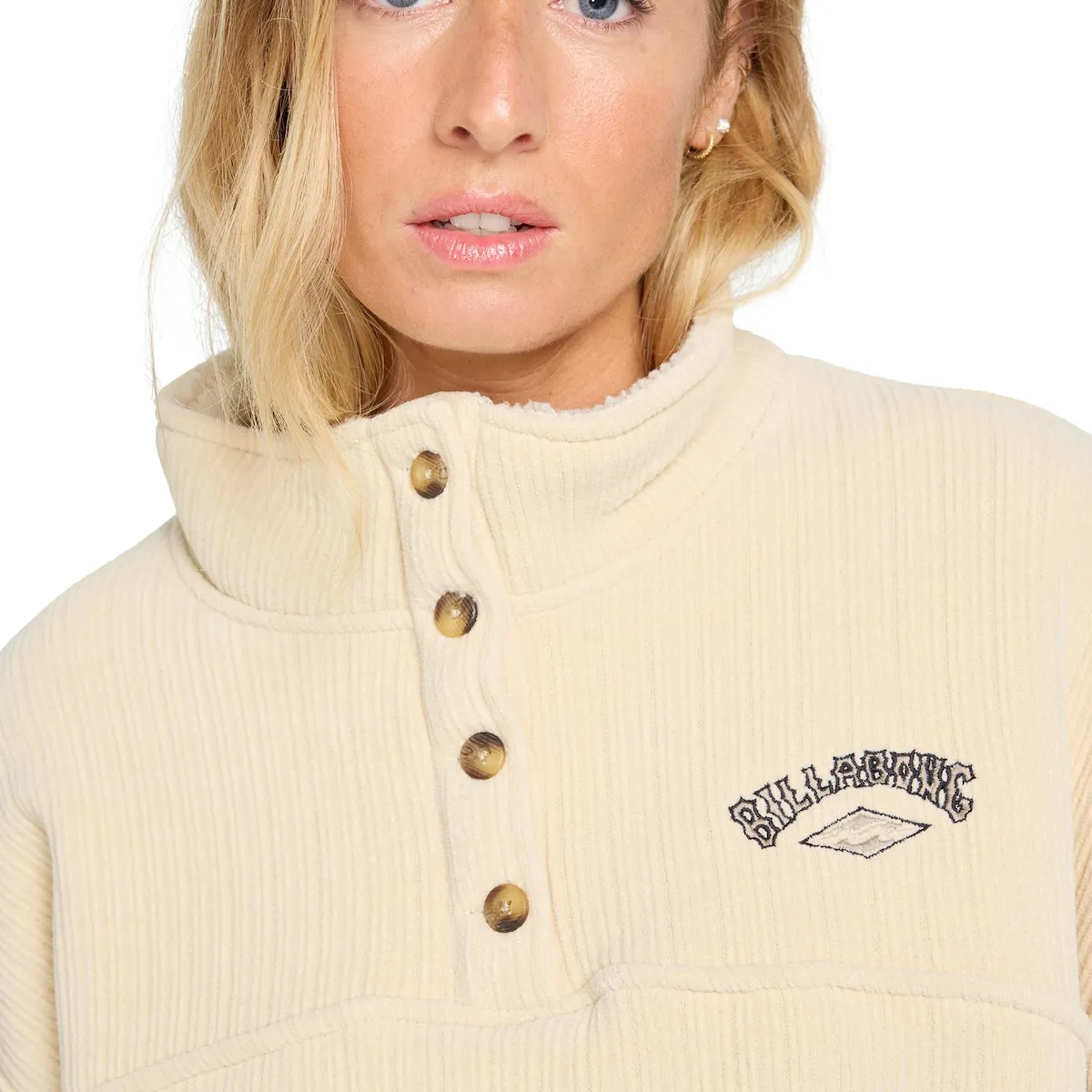 Женская толстовка. Особенности включают: Материал: усиленный вельвет, Посадка: свободная, Детали: высокий воротник с застежкой на пуговицы, Эластичные манжеты и подол, Бренд: вышитый логотип на груди и металлическая эмблема бренда.