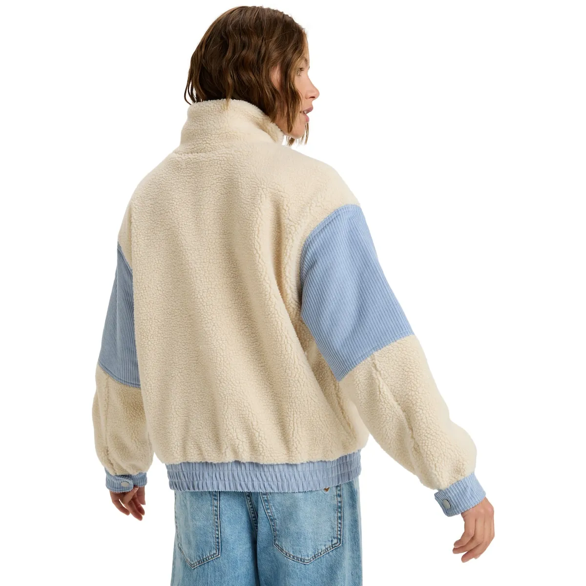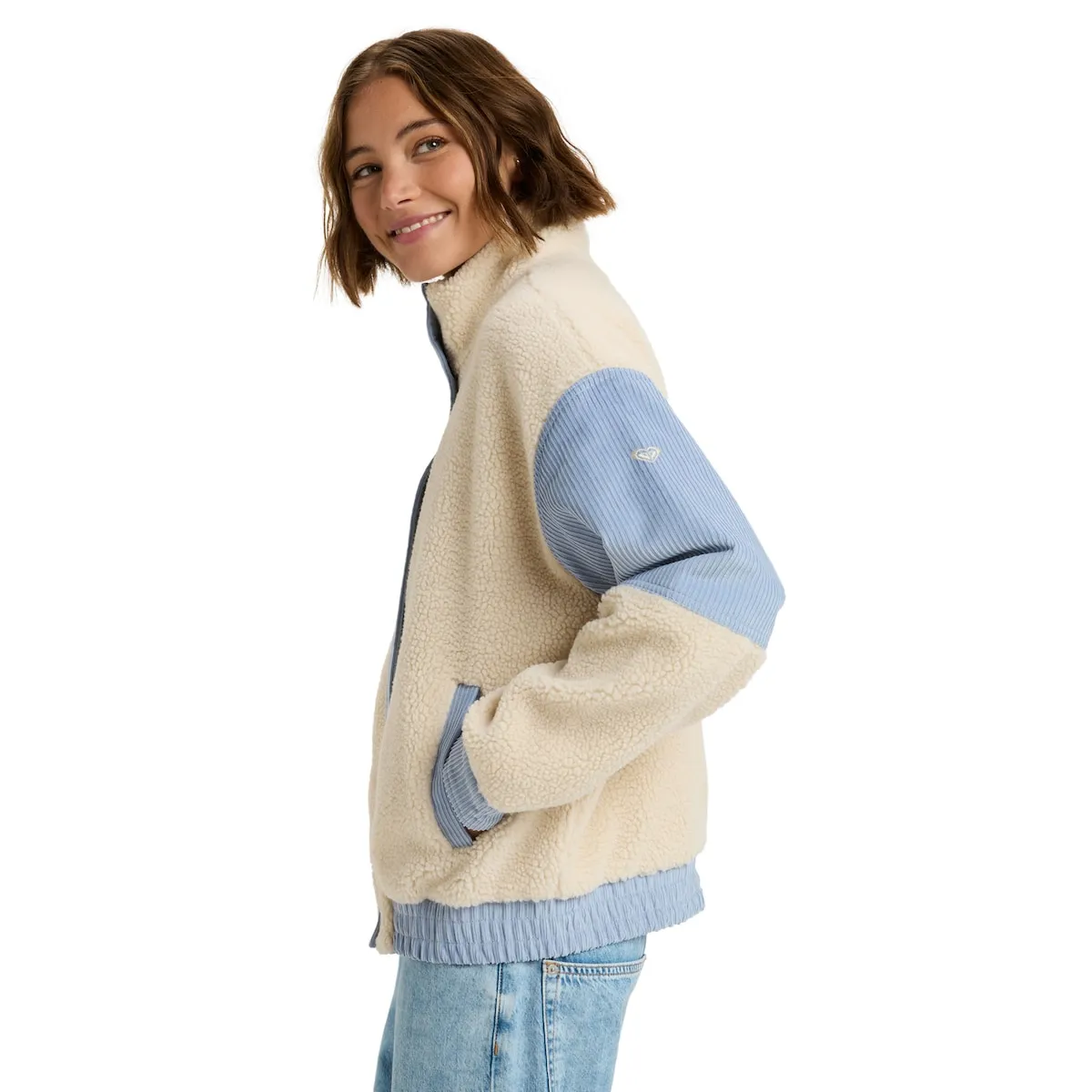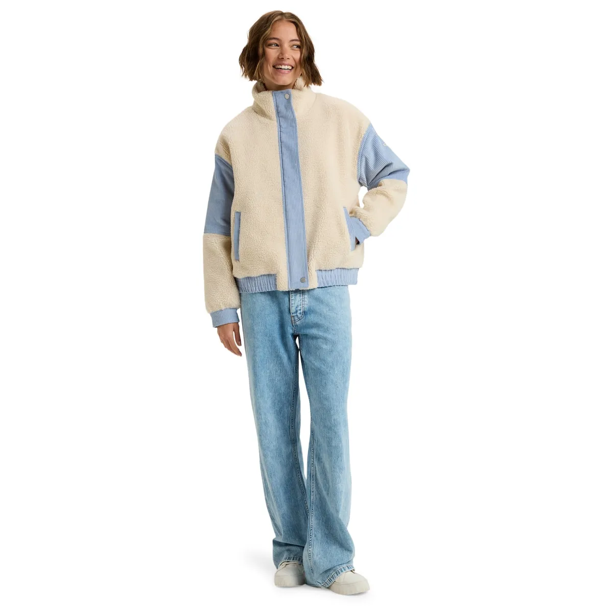 Женская шерпа-куртка с вельветовыми блоками. Характеристики включают: Ткань: полиэстеровая шерпа с хлопковым вельветовым блоком, Крой: свободный крой «бойфренд», Подкладка: полностью подбитый тафтовый подклад, Карманы: боковые карманы, Застежка: передняя молния с планкой и вышивка сердца Roxy на рукаве.