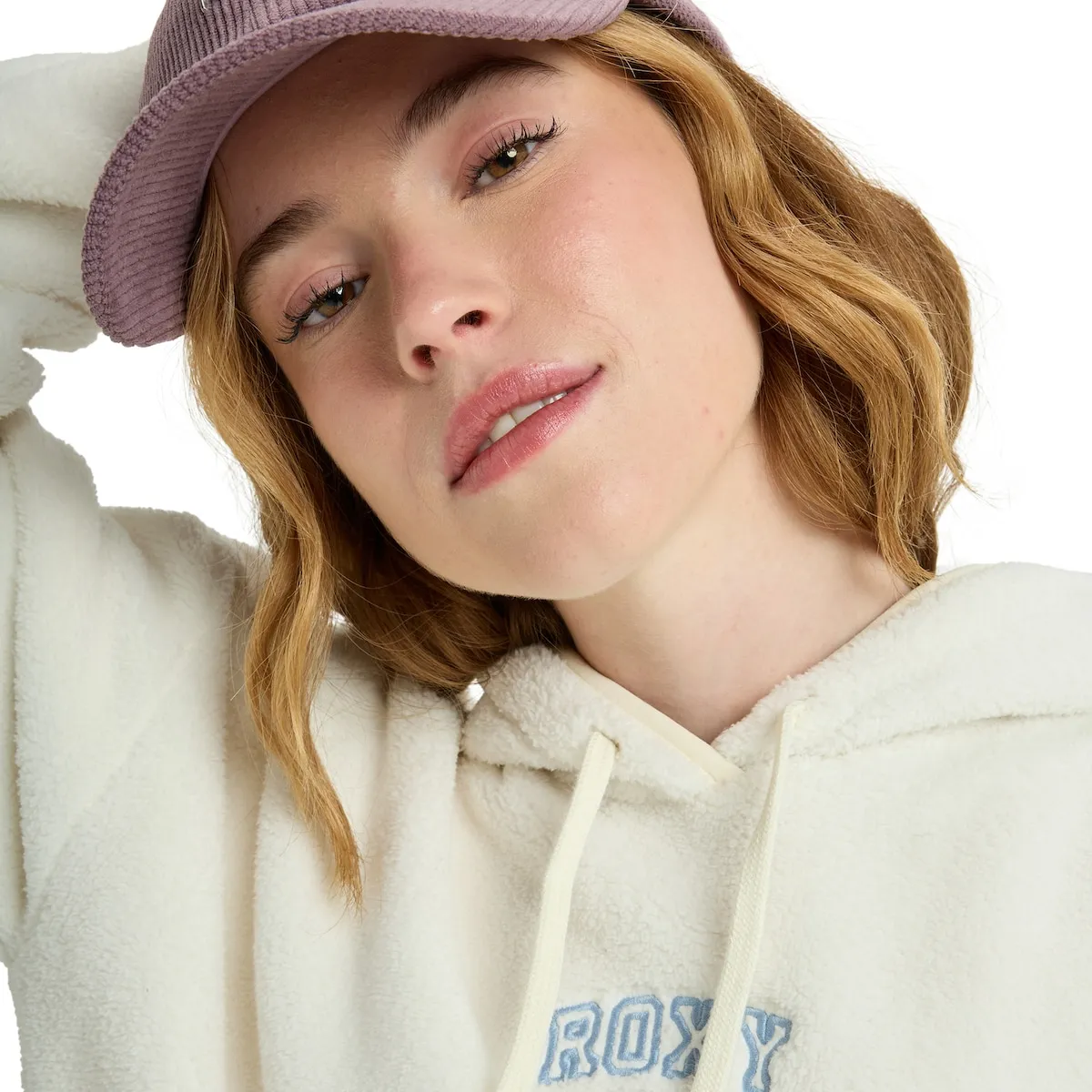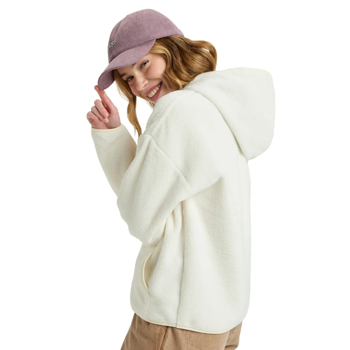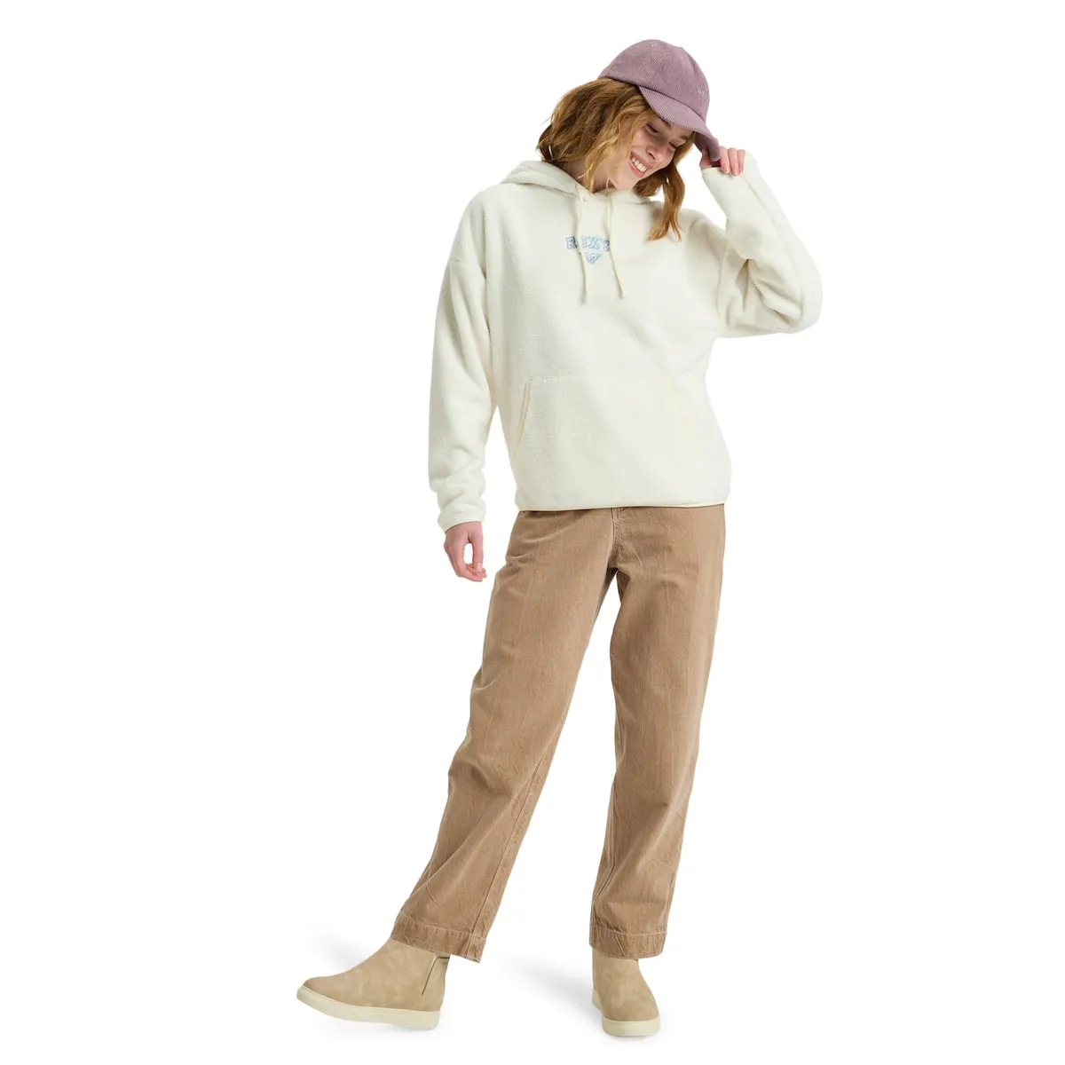 Флисовая толстовка с капюшоном для женщин. Характеристики включают: Материал: полиэстеровый флис, Крой: обычный, Капюшон: с подкладкой, Карманы: карман-кенгуру, Детали: вышивка Roxy на груди и капюшоне с завязками.