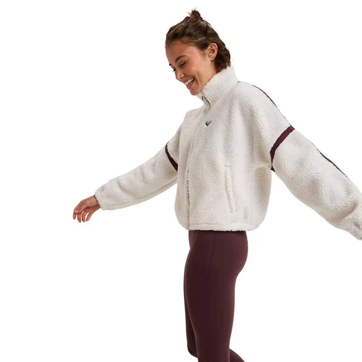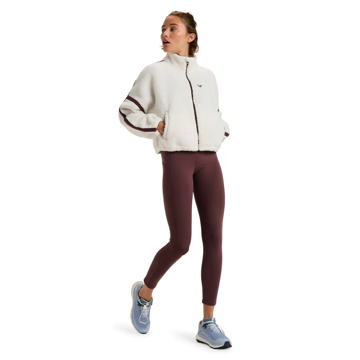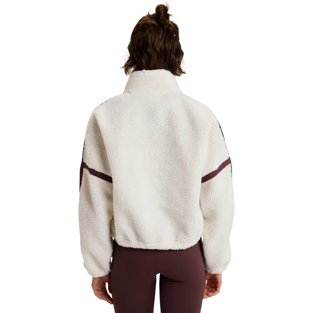 Женская спортивная толстовка. Характеристики включают: Крой: укороченный крой с молнией и высоким воротником, низ и манжеты с эластичной отделкой, карманы, защита подбородка и ткань: теплый мягкий шерпа для дополнительного комфорта.