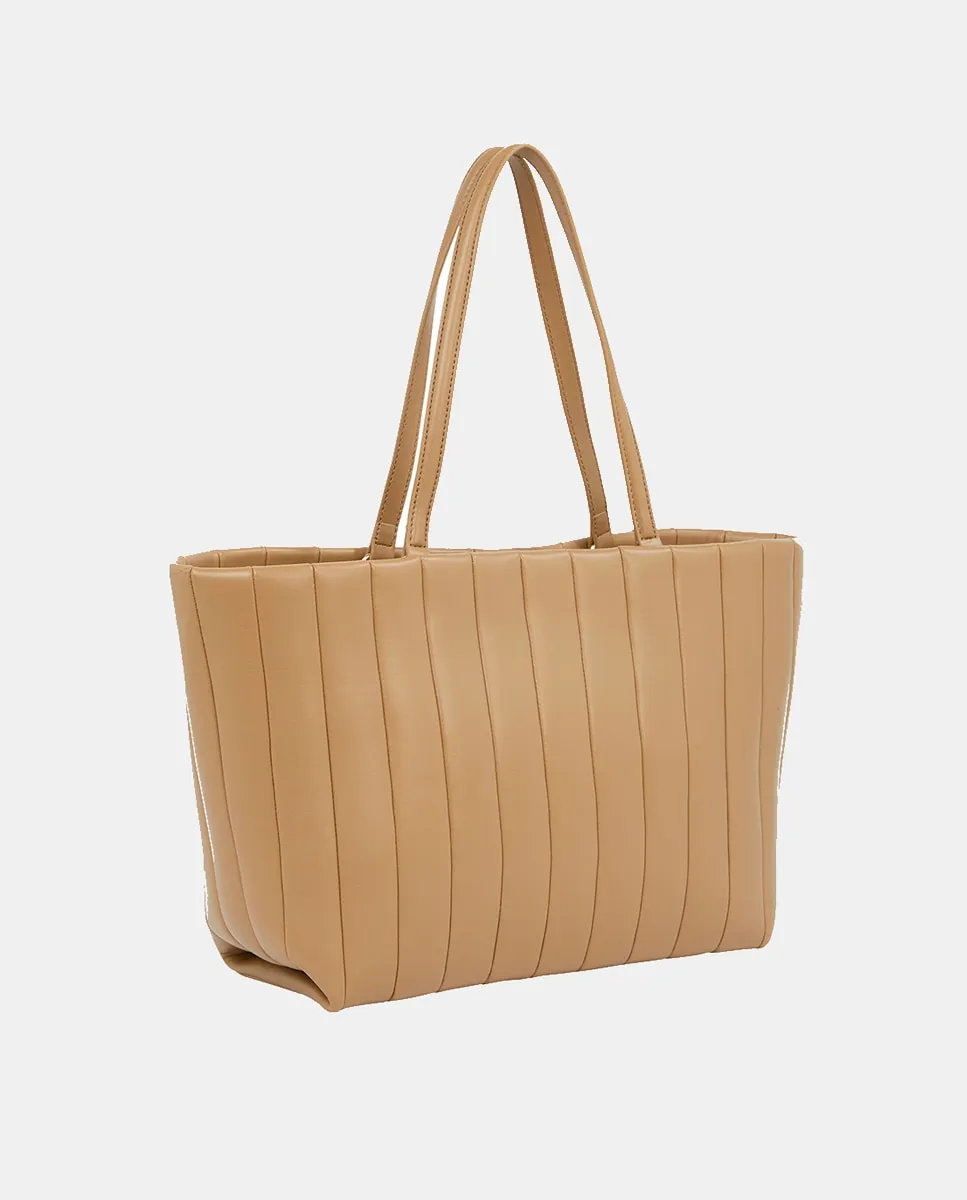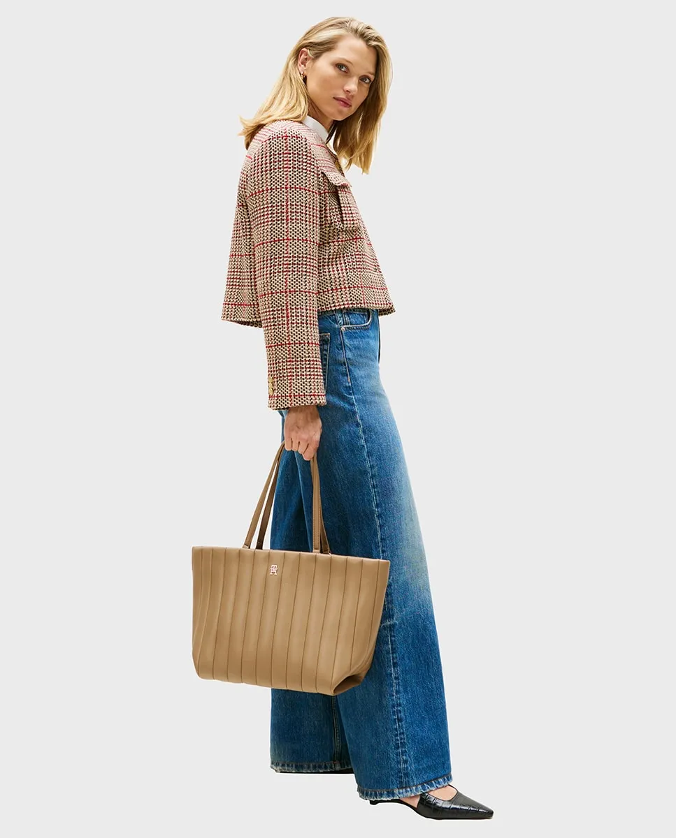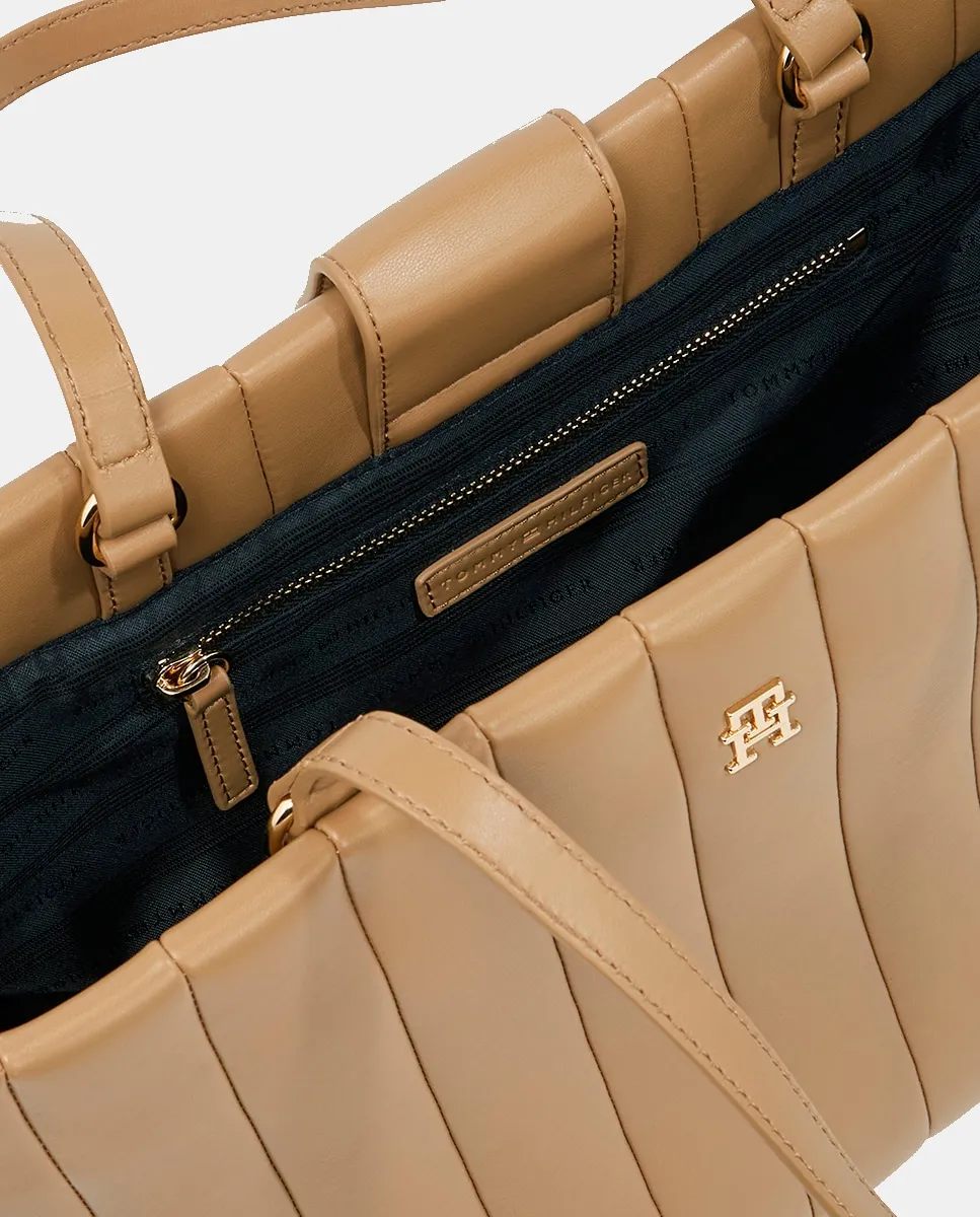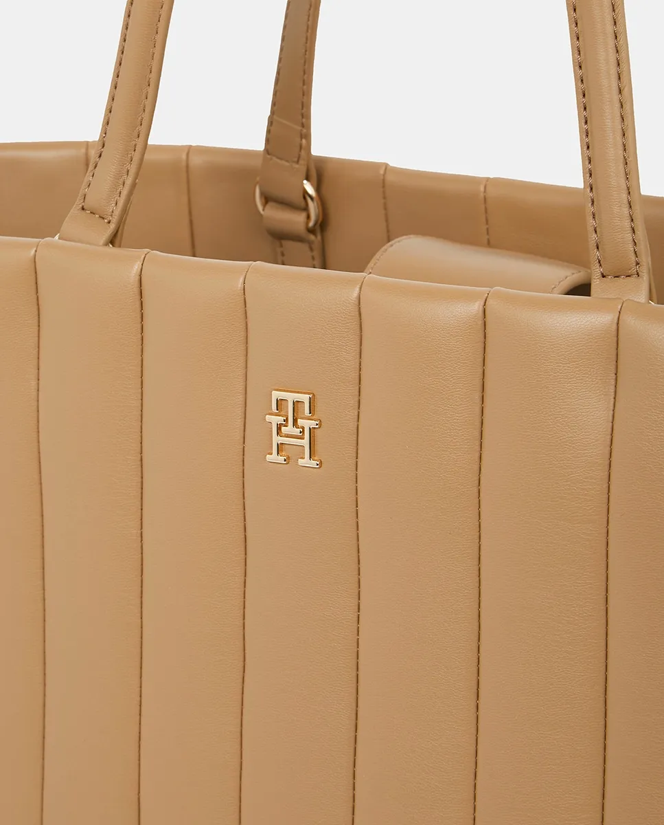 Женская сумка в стиле тоут, выполненная из экокожи цвета верблюжьей шерсти с эффектом стеганой ткани. Дизайн с металлическим логотипом Tommy Hilfiger на лицевой стороне.