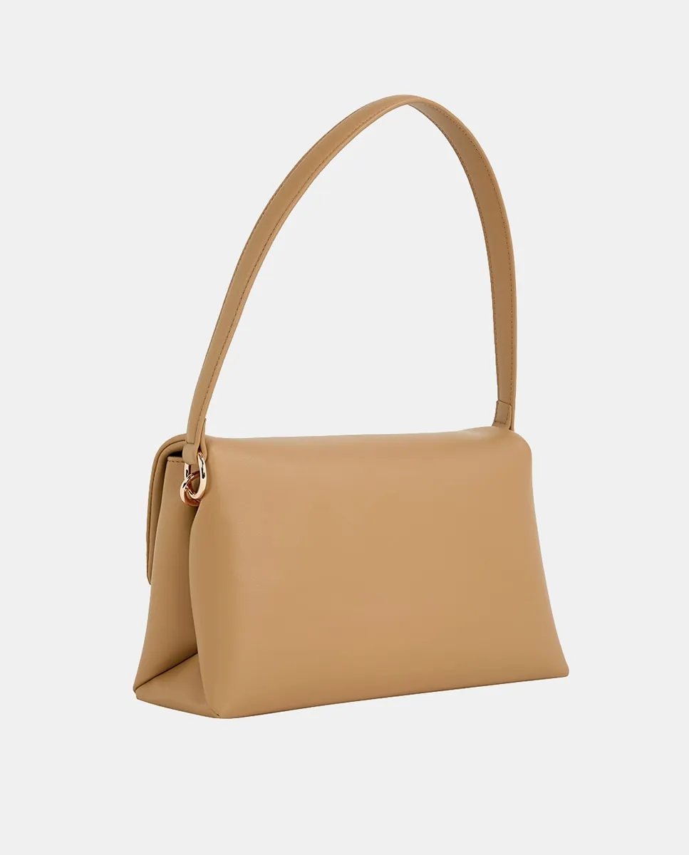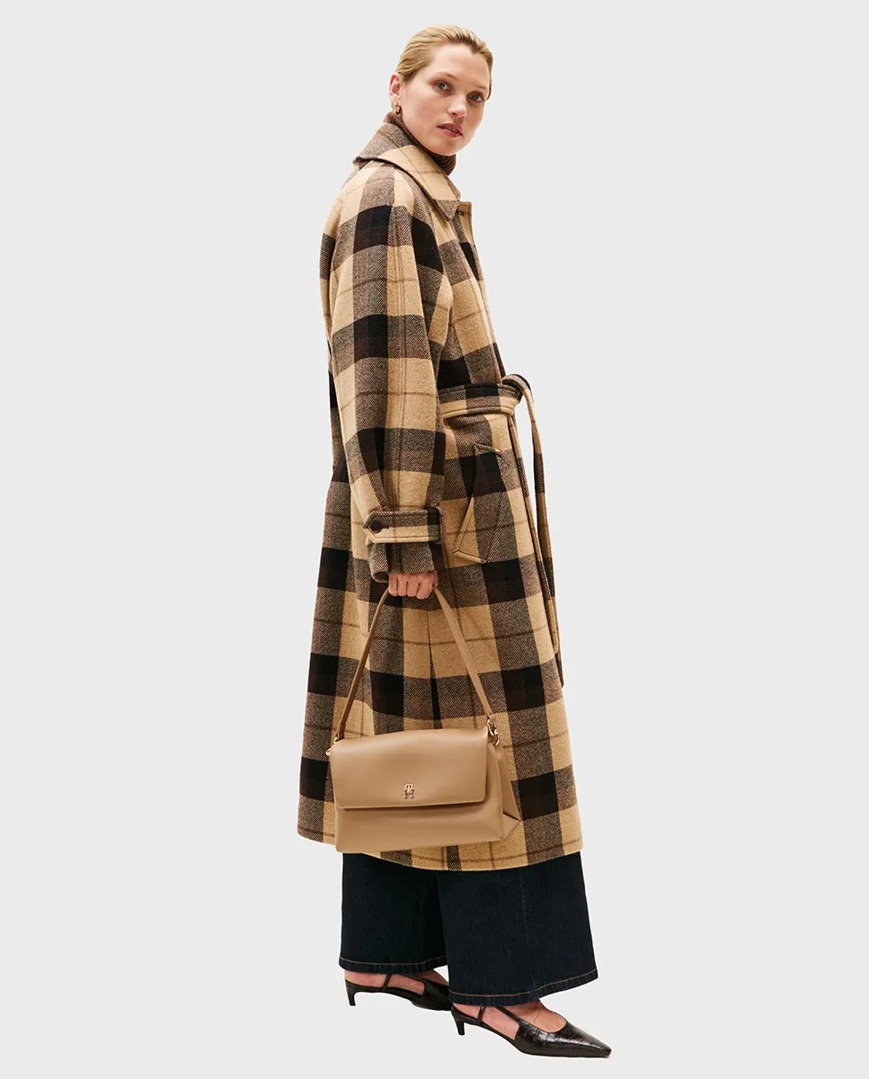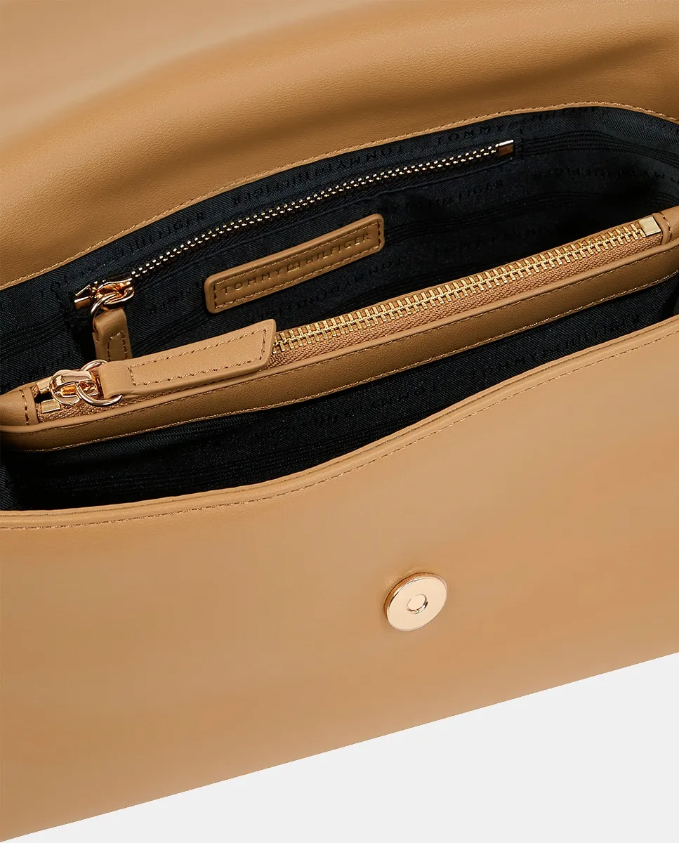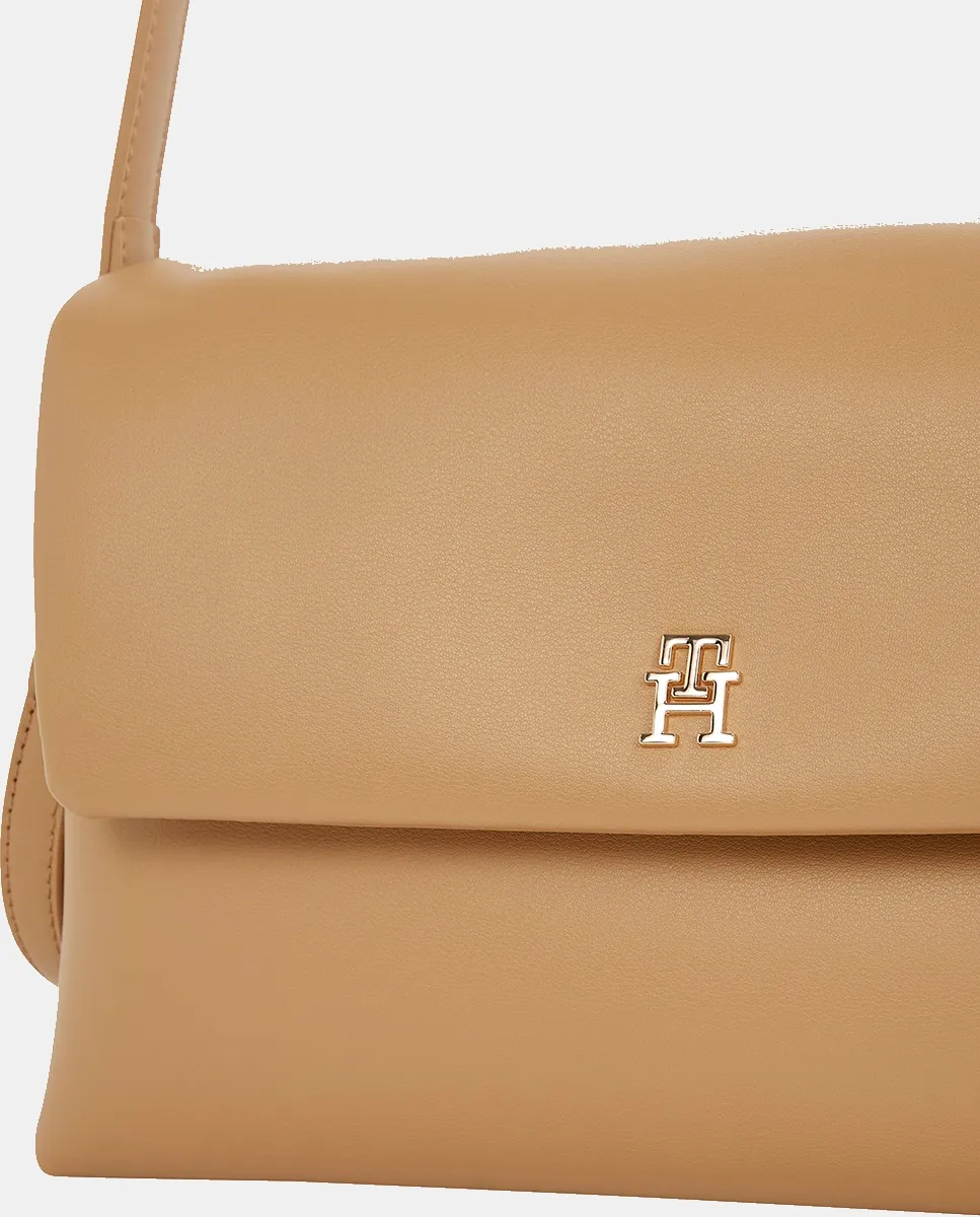 Женская сумка через плечо, выполненная из переработанного полиэстера цвета верблюжьей шерсти. Дизайн с регулируемым ремнем через плечо, застежкой с клапаном и металлическим логотипом Tommy Hilfiger на передней стороне.
