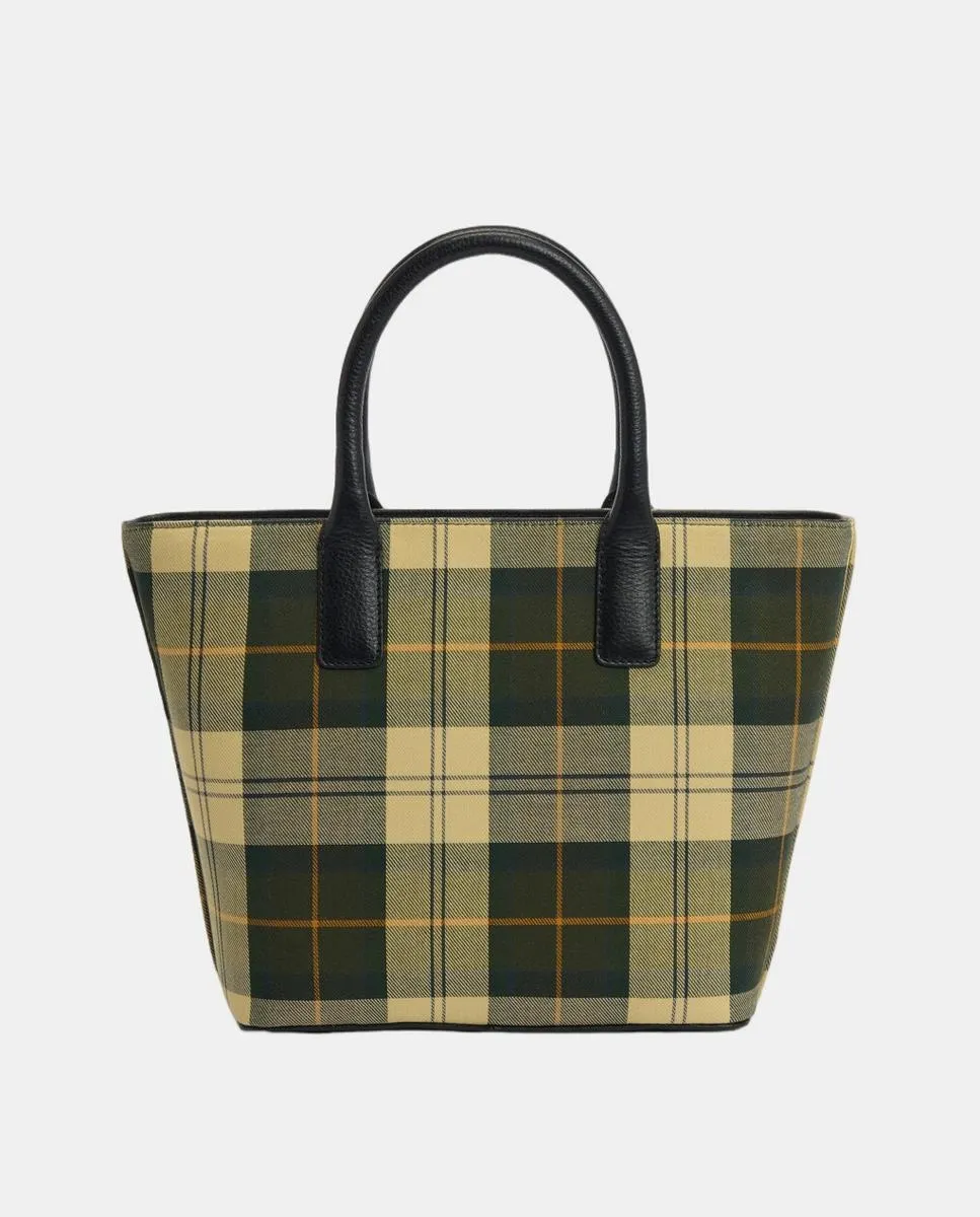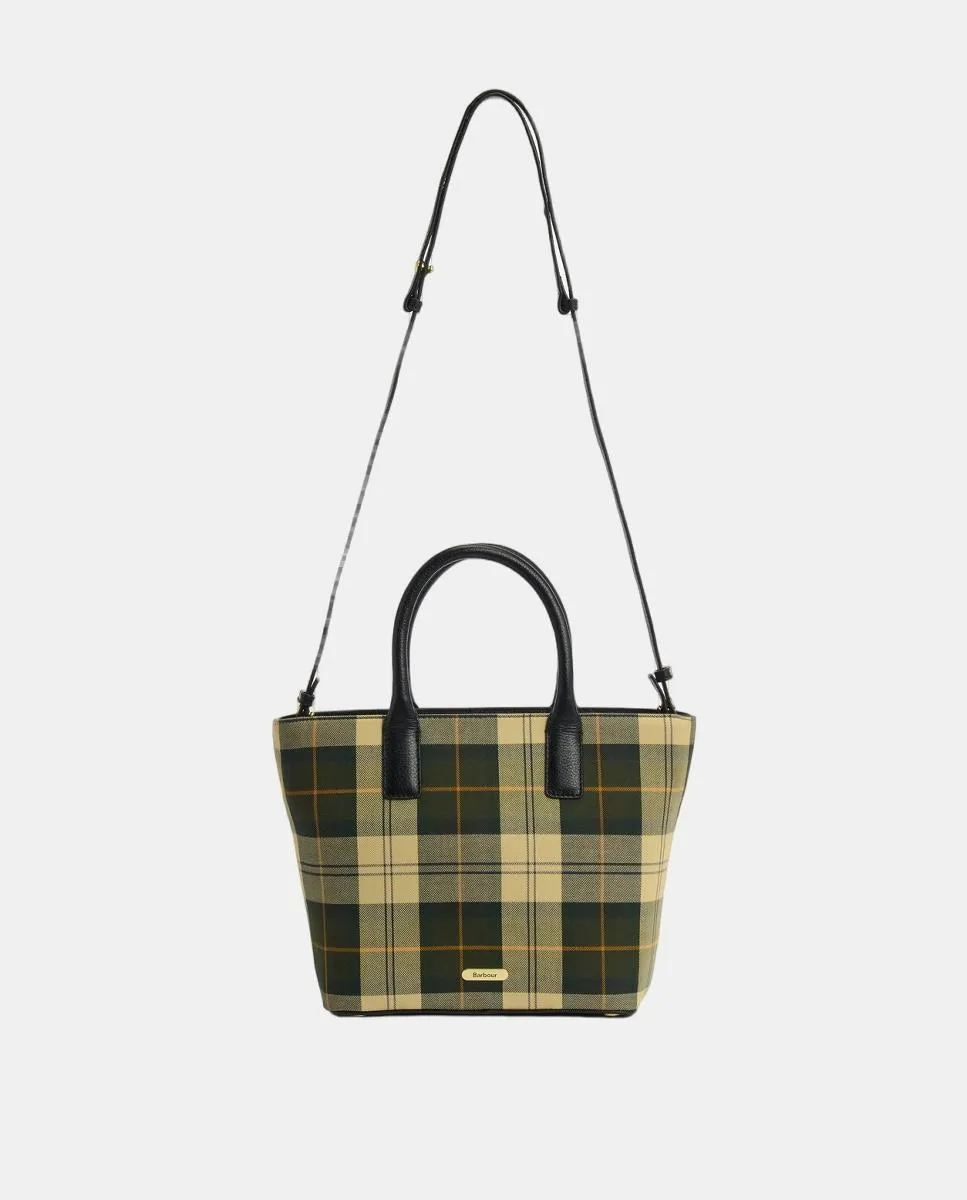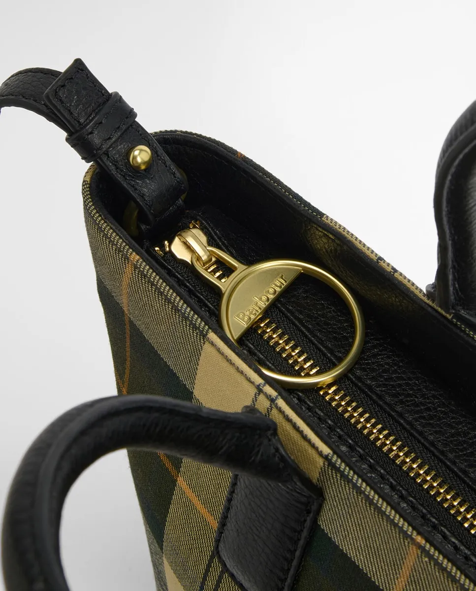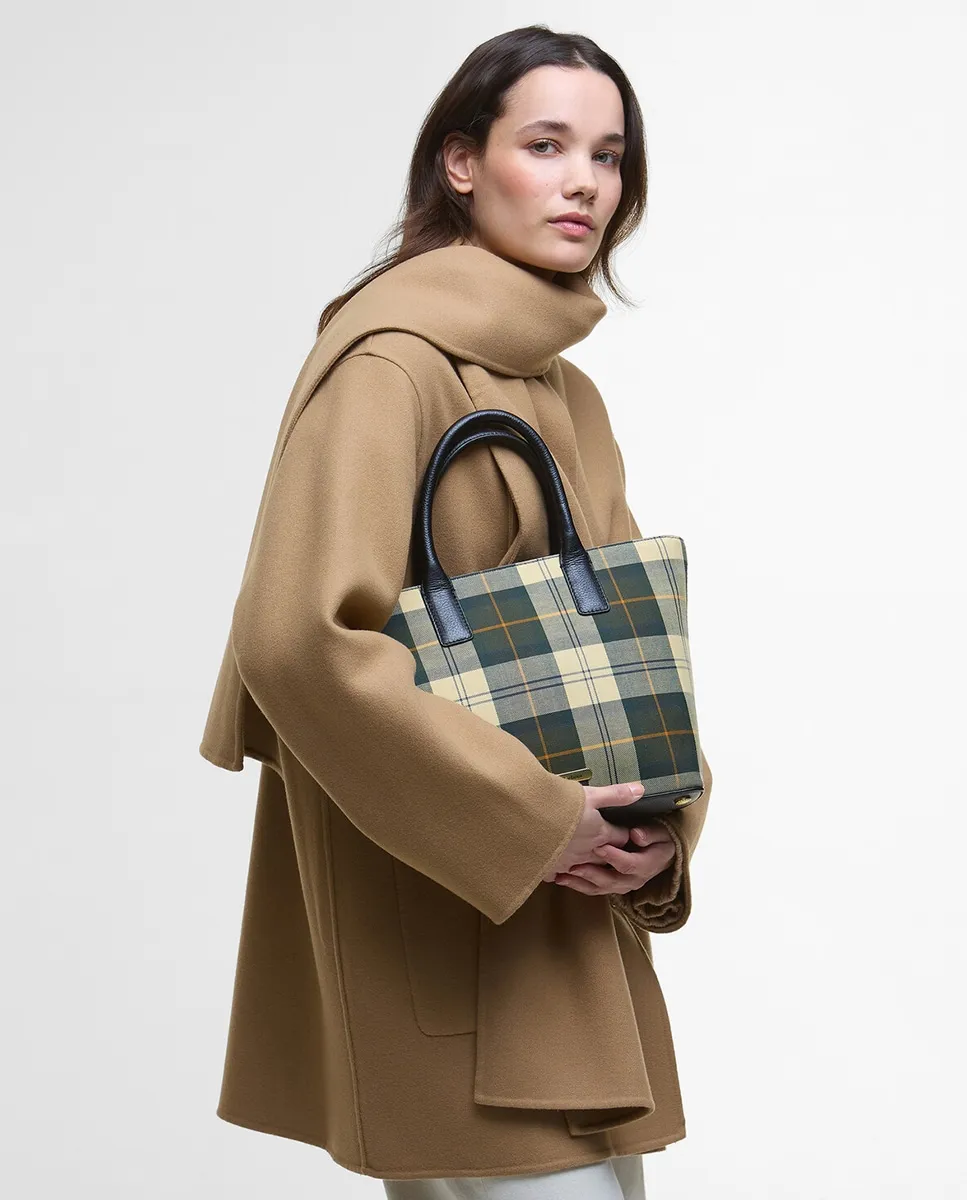 Маленькая сумка-тоут из тартана Barbour с застежкой-молнией, ручками и отделкой из натуральной кожи. Дно с заклепками с логотипом бренда снизу, съемный плечевой ремень из кожи и внутренний карман на молнии.