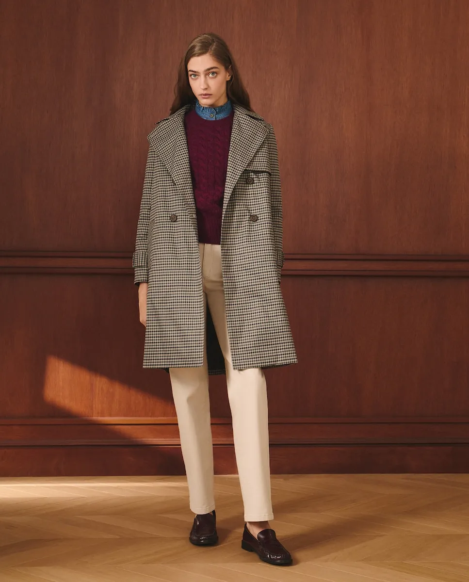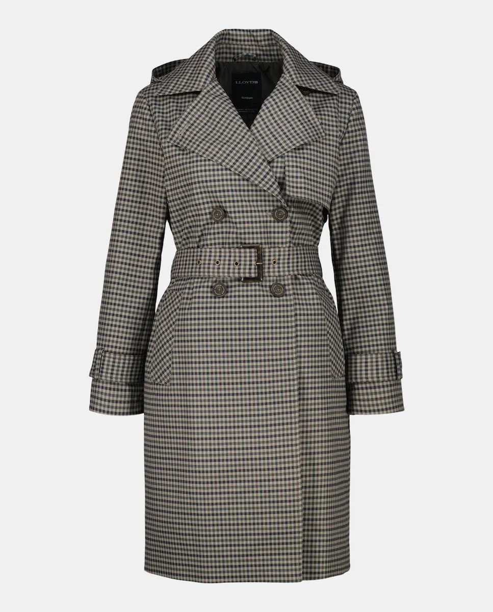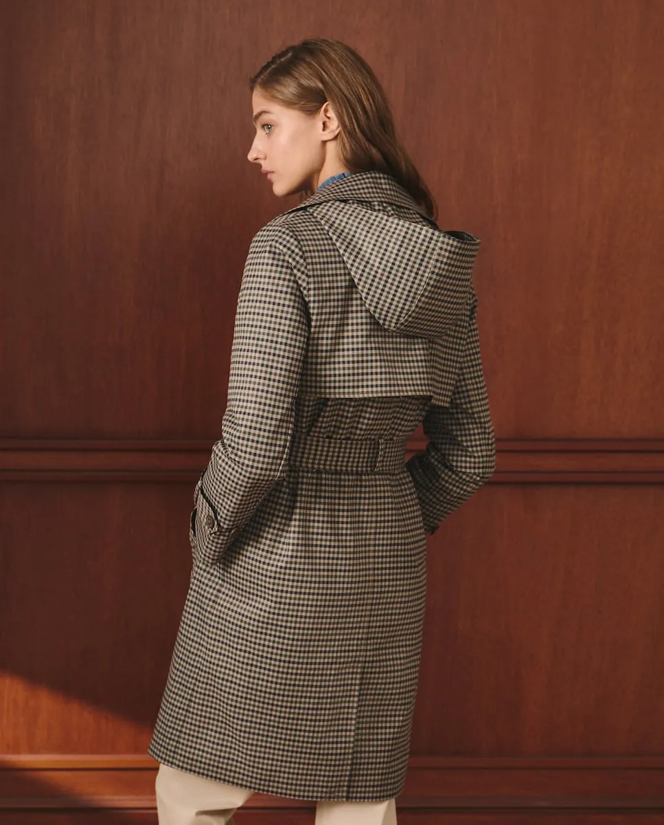 Длинный плащ в клетку с капюшоном.