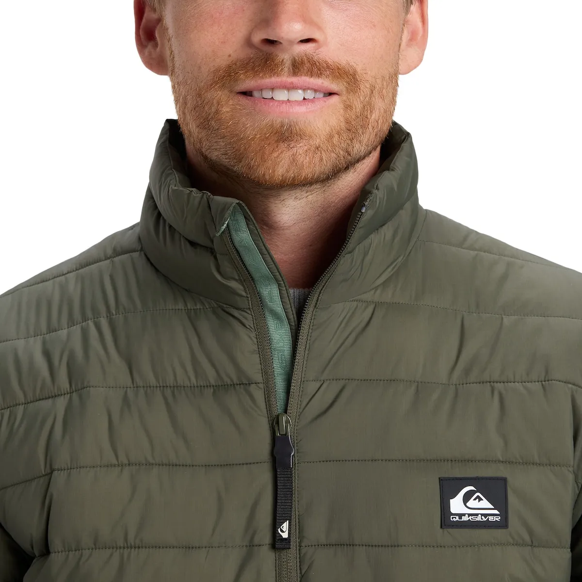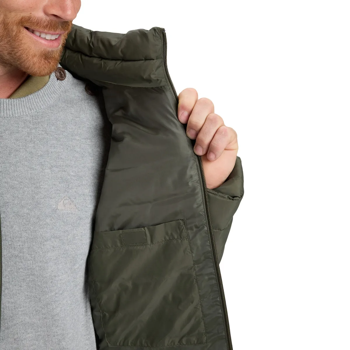 Мужская куртка с изоляцией. Характеристики включают: Подходит для: ежедневных приключений, ПРЕИМУЩЕСТВА, Технология Quiksilver DryFlight защищает от ветра и влаги, Уровень WarmFlight 2/3 очень теплый утеплитель с небольшим объемом, Вес наполнителя: полифил 285 г, Made Better, Изготовлено из переработанного преконсумного нейлона и переработанных полиэфирных волокон из пластиковых бутылок, Долговременная водоотталкивающая обработка без ПФОС, Ткань: переработанный нейлон 37 г/м², ХАРАКТЕРИСТИКИ, Крой: обычный крой, Подкладка: тафта из переработанного полиэстера, Молнии: фронтальная застежка-молния, Карманы: два кармана на молнии для рук, Прочее: подол и манжеты с эластичными краями.