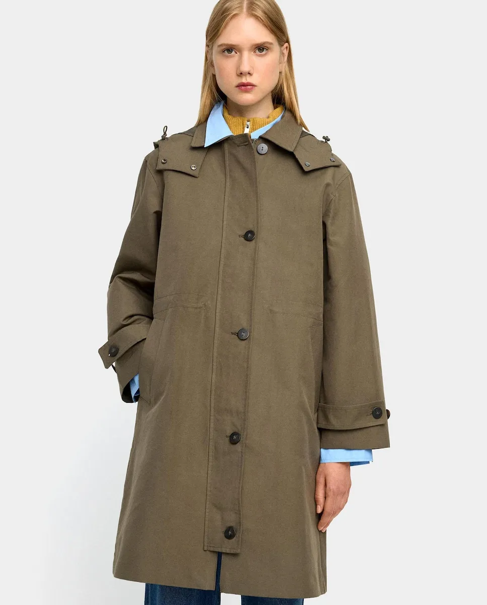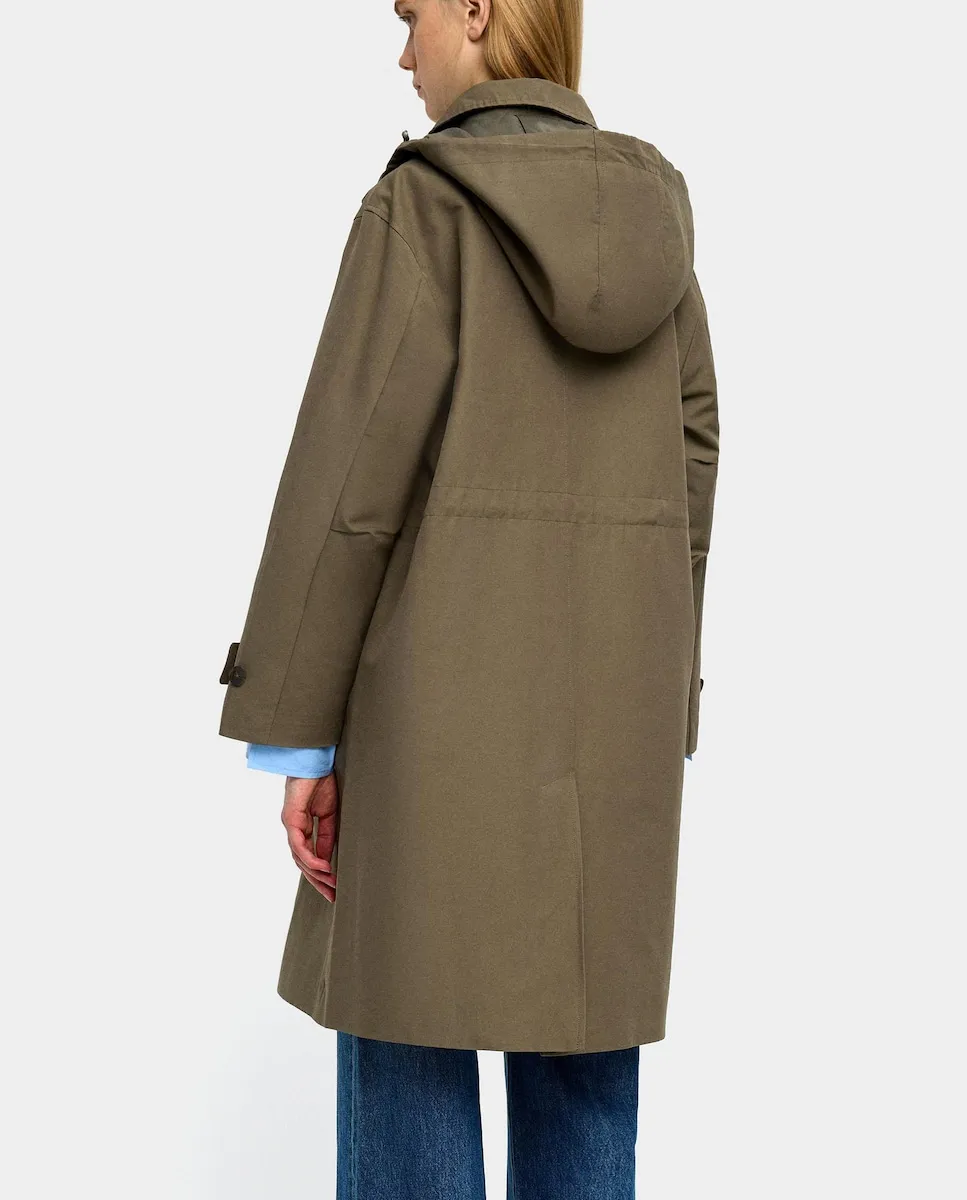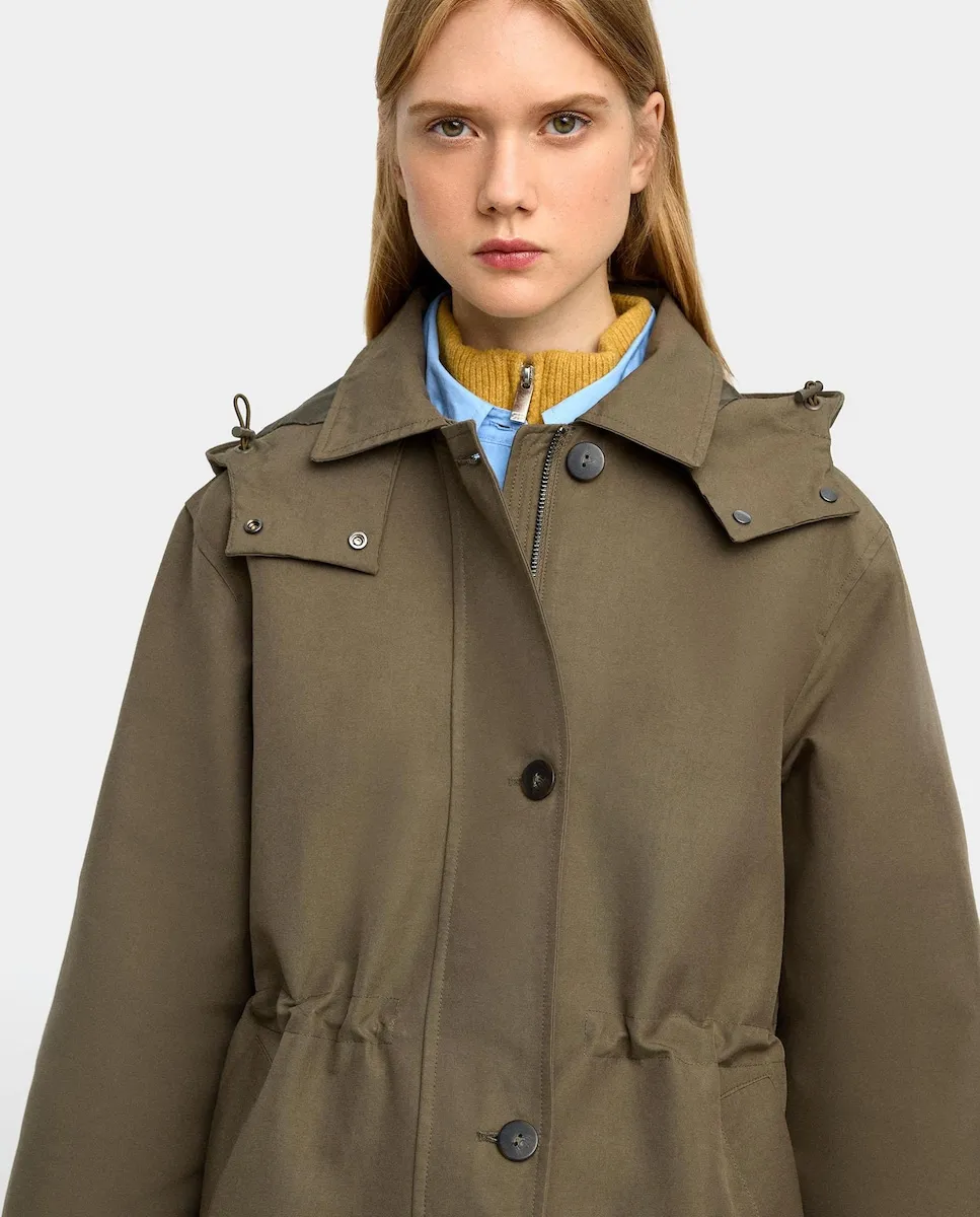 Легкая парка с капюшоном и боковыми карманами. Воротник с отворотом. Рукава длинные с декоративными пуговицами на манжетах. Эластичная лента на талии для регулировки. Скрытая застежка-молния с пуговицами. Модель ростом 1,75 м и носит размер XS-S.