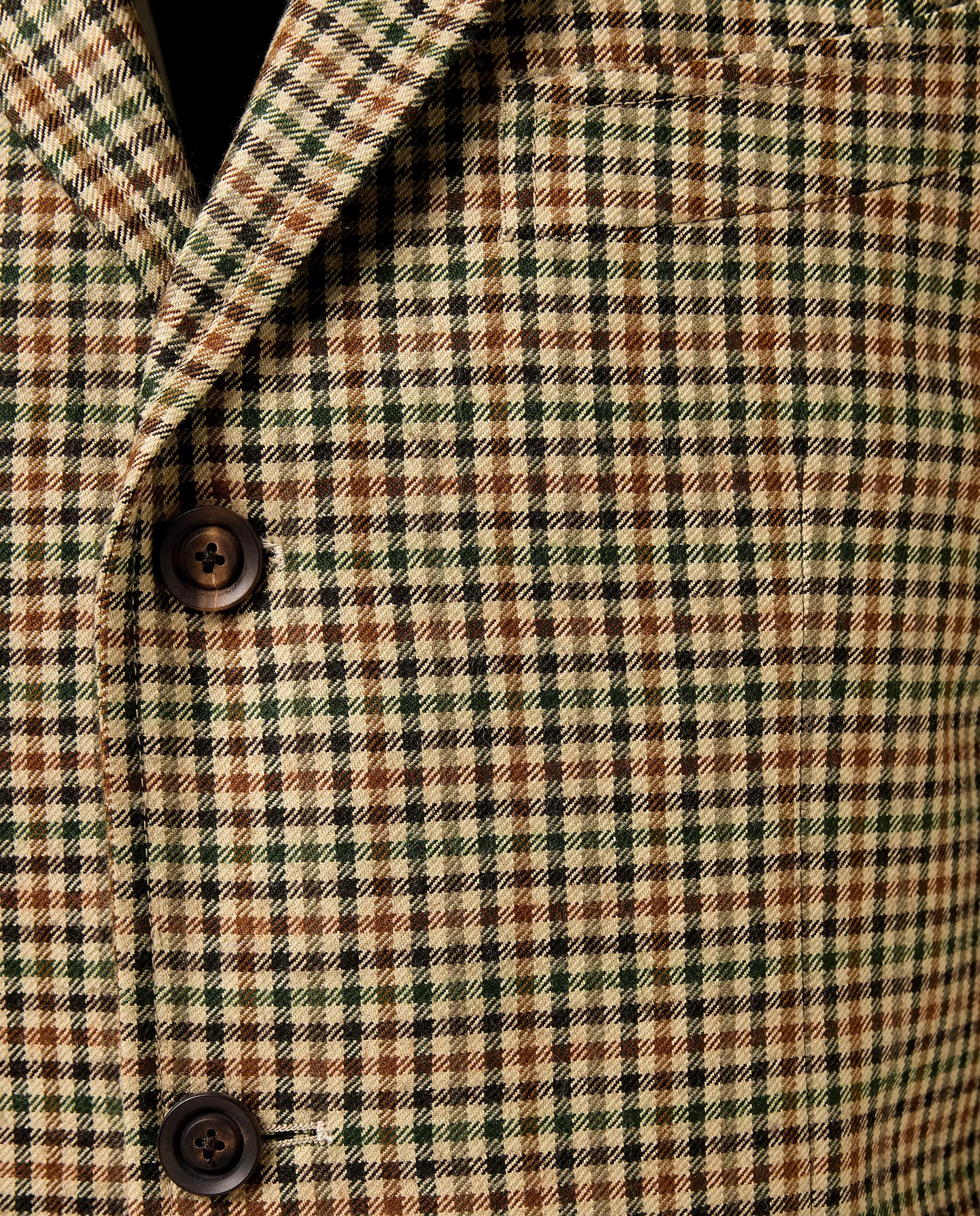 Жакет Харрис из габардиновой ткани, один ряд, три пуговицы, два разреза, накладные карманы с клапанами и подкладкой.