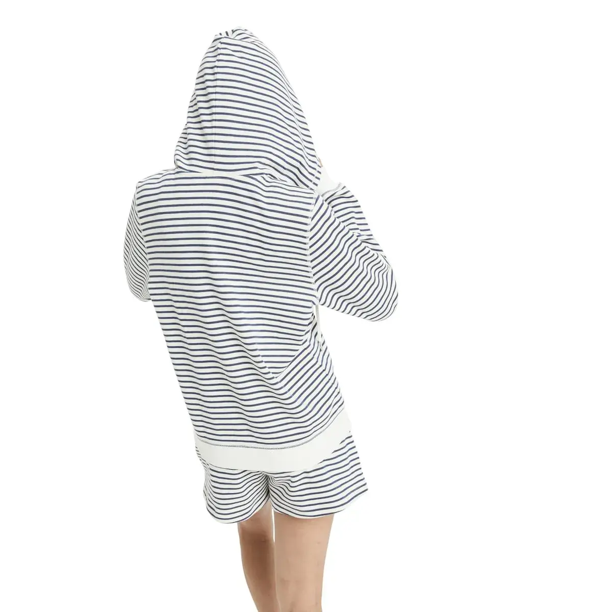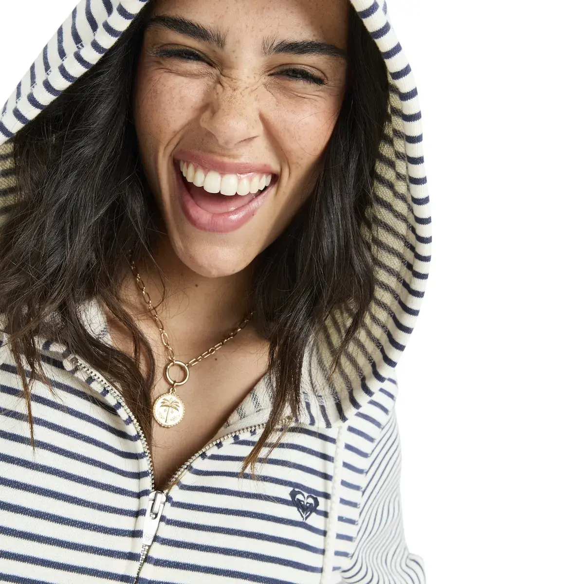 Толстовка с капюшоном и молнией для женщин. Особенности включают: Ткань: хлопок с окрашенными в нить полосами, флисовый полиэстер, Стиль: обычный крой, Карман-кенгуру, Капюшон с шнурком и тонкая вышивка сердечка Roxy на передней части.