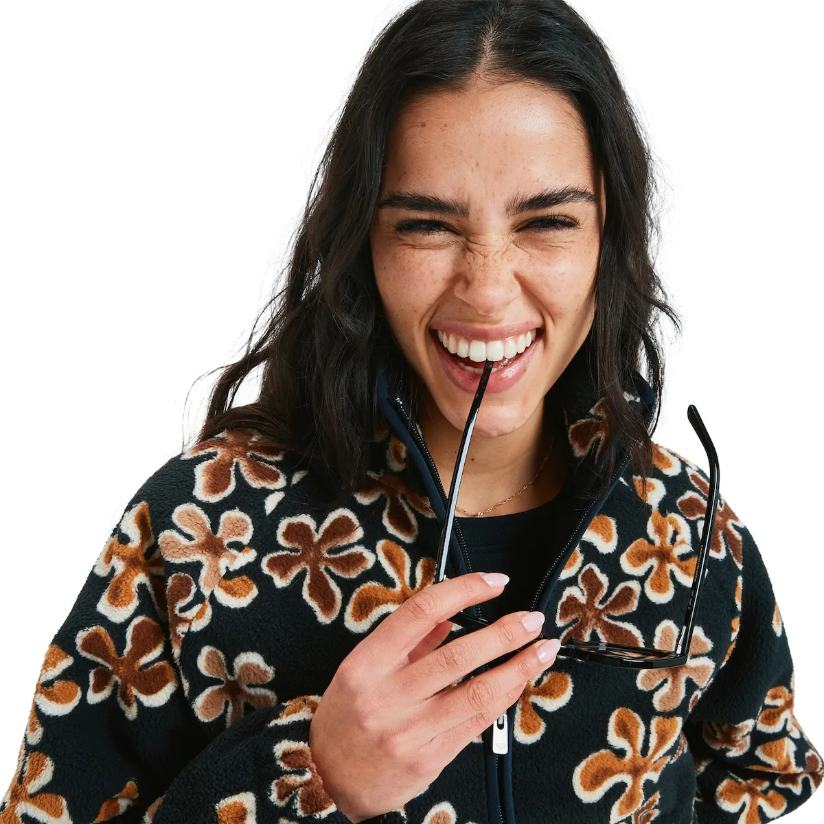 Флисовая куртка на молнии для женщин. Особенности включают: Ткань: полиэстеровый шерпа с принтом и двойной отделкой [300 г/м²], Крой: свободный, Воротник: высокий воротник, Подкладка: без подкладки, Карманы: боковые карманы, Эластичные края и кожаная нашивка Roxy на левом рукаве.
