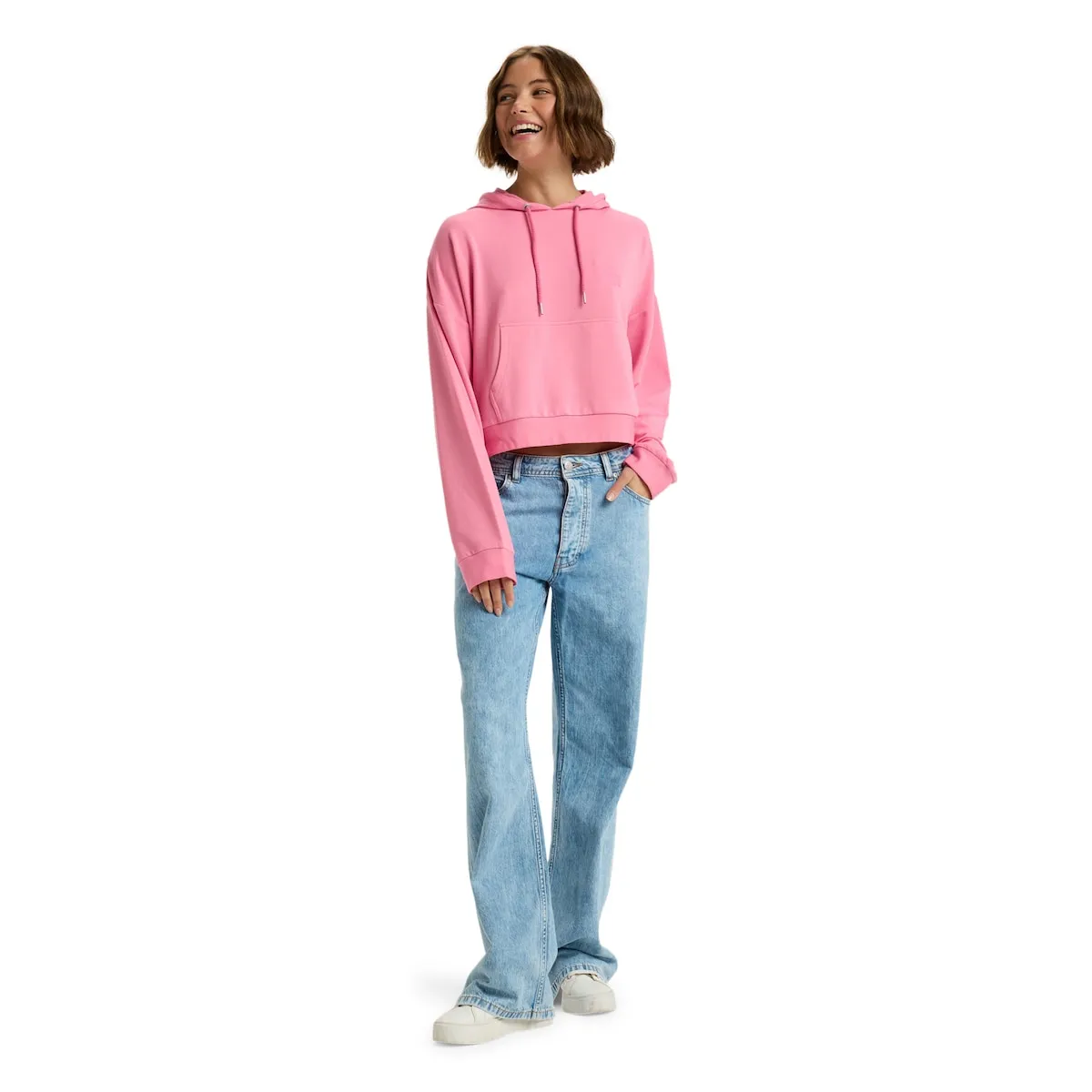 Свободная толстовка с капюшоном для женщин. Характеристики включают: Ткань: модал, полиэстер и эластан, Крой: свободный, Вышивка на груди, Подол и манжеты из той же ткани.