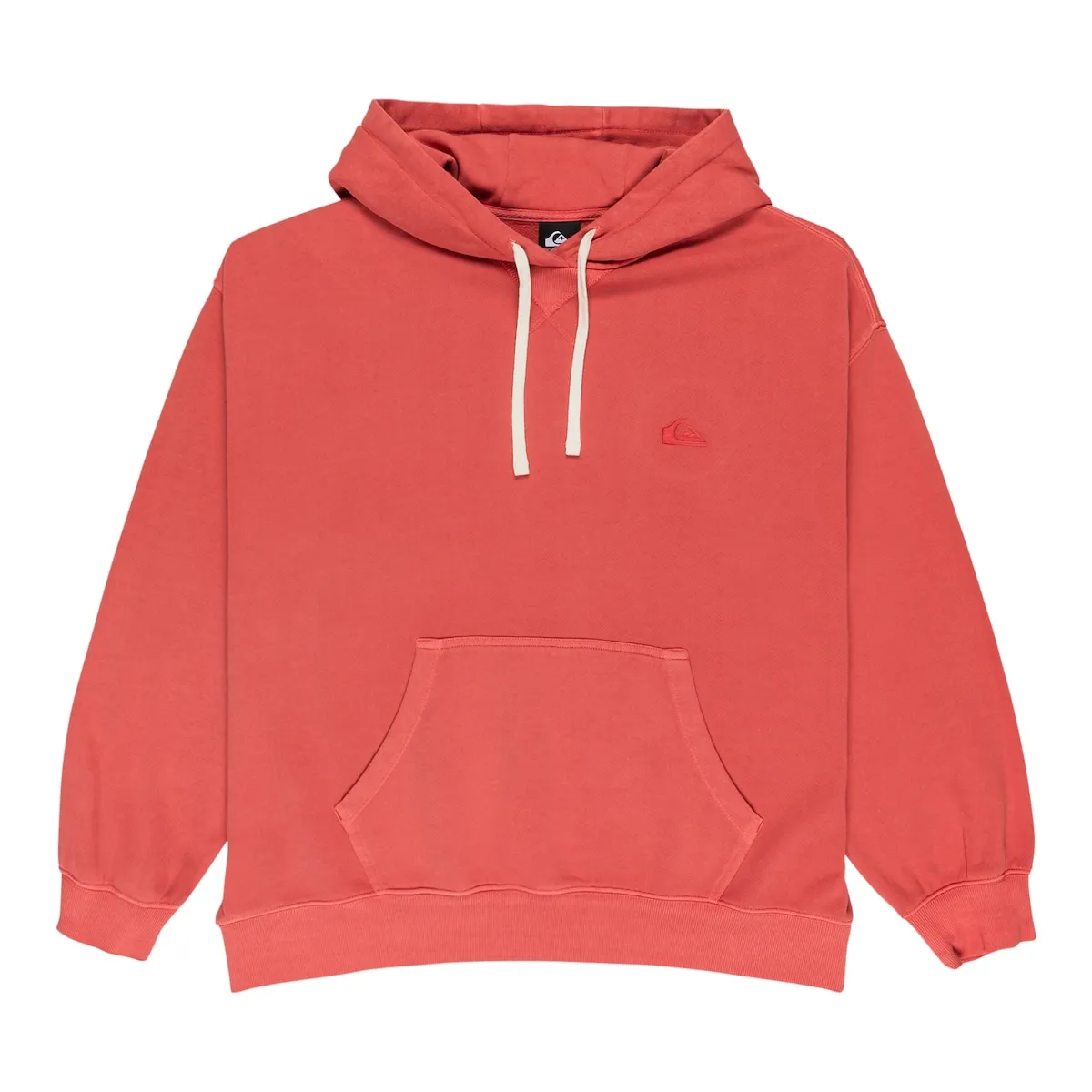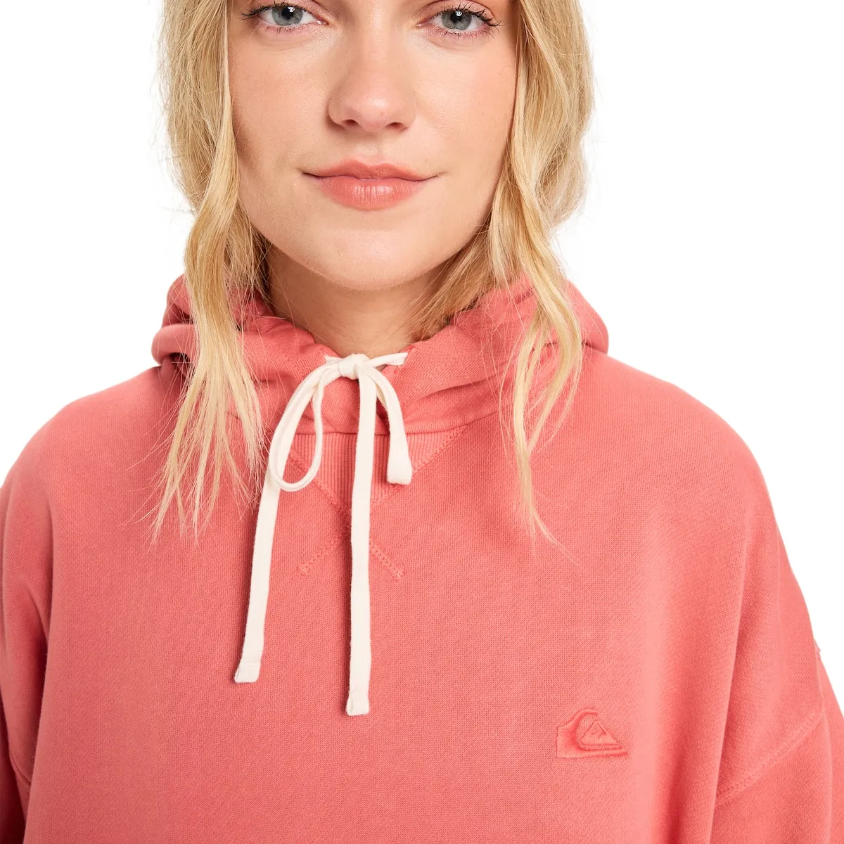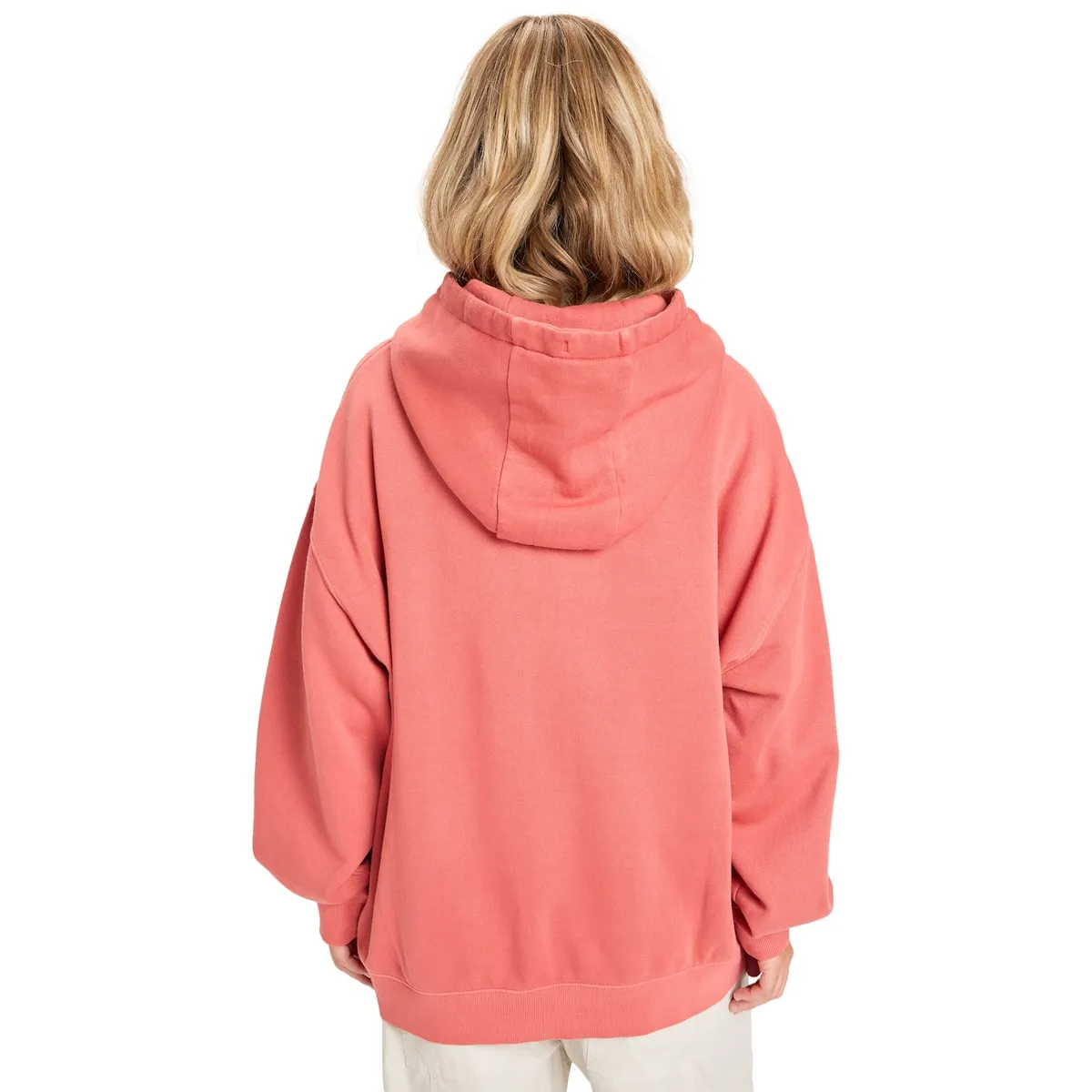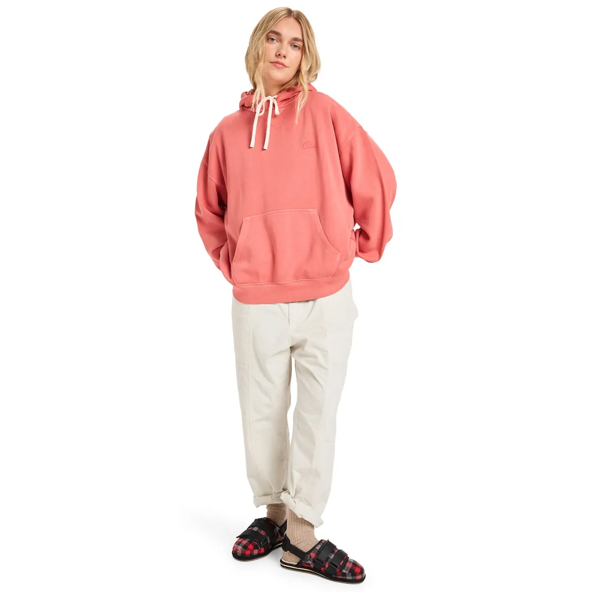 Женская толстовка с капюшоном. Характеристики включают: Материал: органический хлопок, 300 г/м², Кроя: классический, Воротник: с капюшоном, Стирка: окраска пигментами с кондиционером для винтажного вида, Мягкая махровая ткань, Вышитый логотип в тон спереди, Воротник с ребристой отделкой 2x2, Манжеты и низ изделия, Капюшон с подкладкой из той же ткани, Шнурок в тон, и просторный карман.