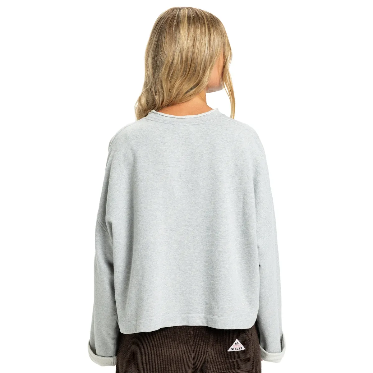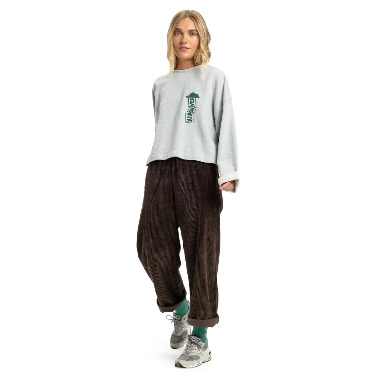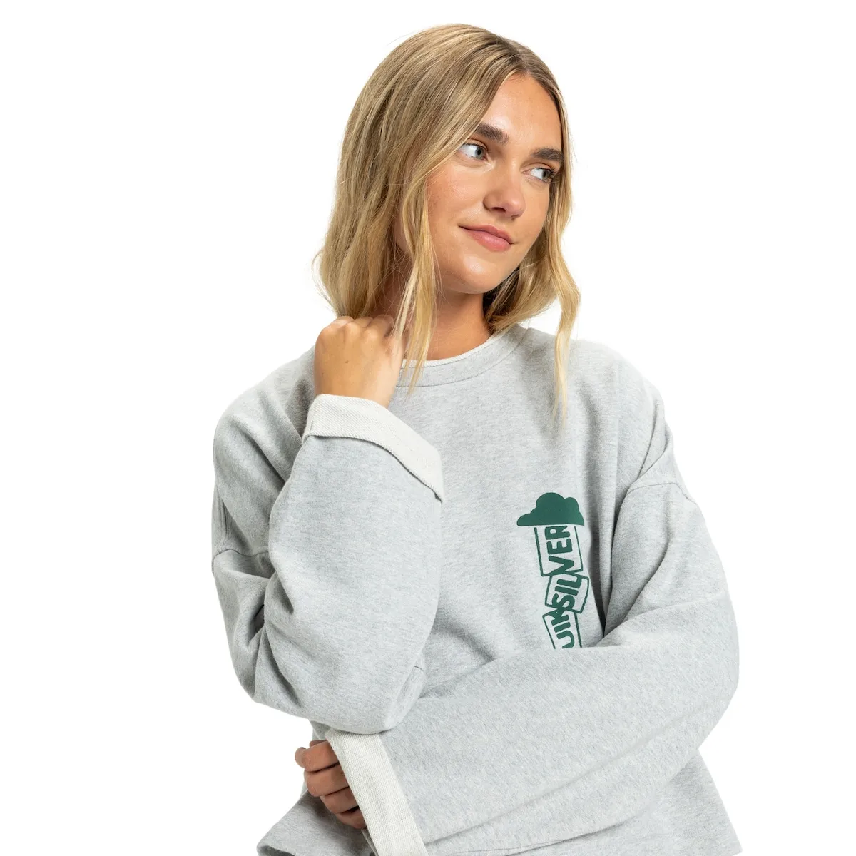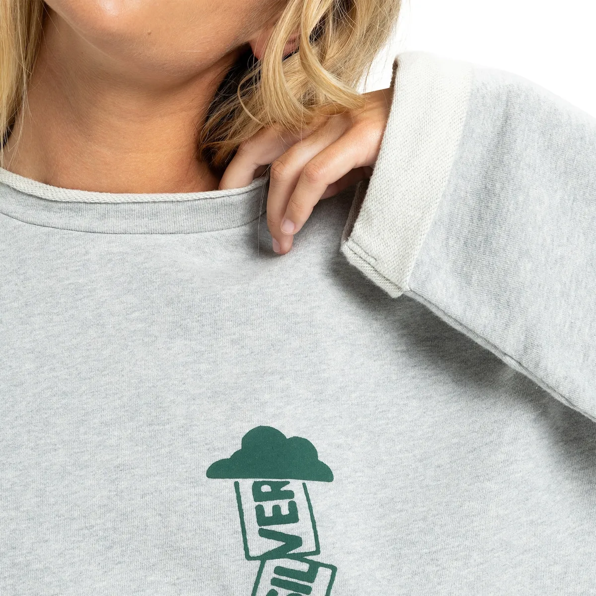 Женский свитшот с круглым вырезом. Особенности включают: Ткань: хлопок, 280 г/м², Крой: с опущенными плечами, Вырез: круглый, Длина: укороченная, Стирка: обработка камнем для винтажного вида, Французский махровый трикотаж, Вырез с необработанными краями, Манжеты с подворотом, Сезонная графика с объемной краской на передней части и Смесь переработанных этикеток.