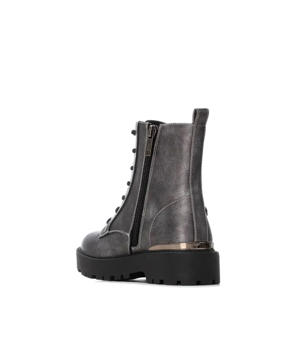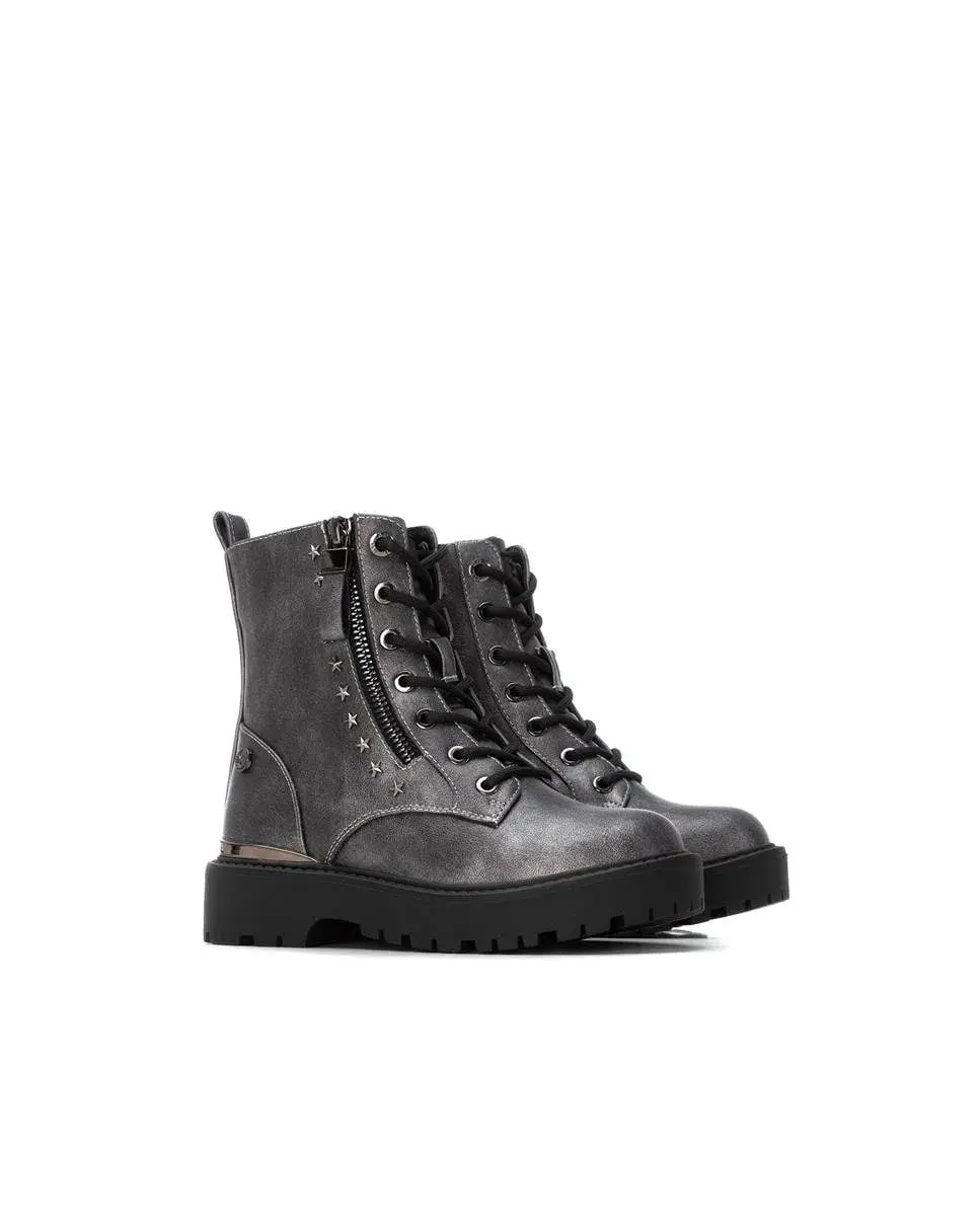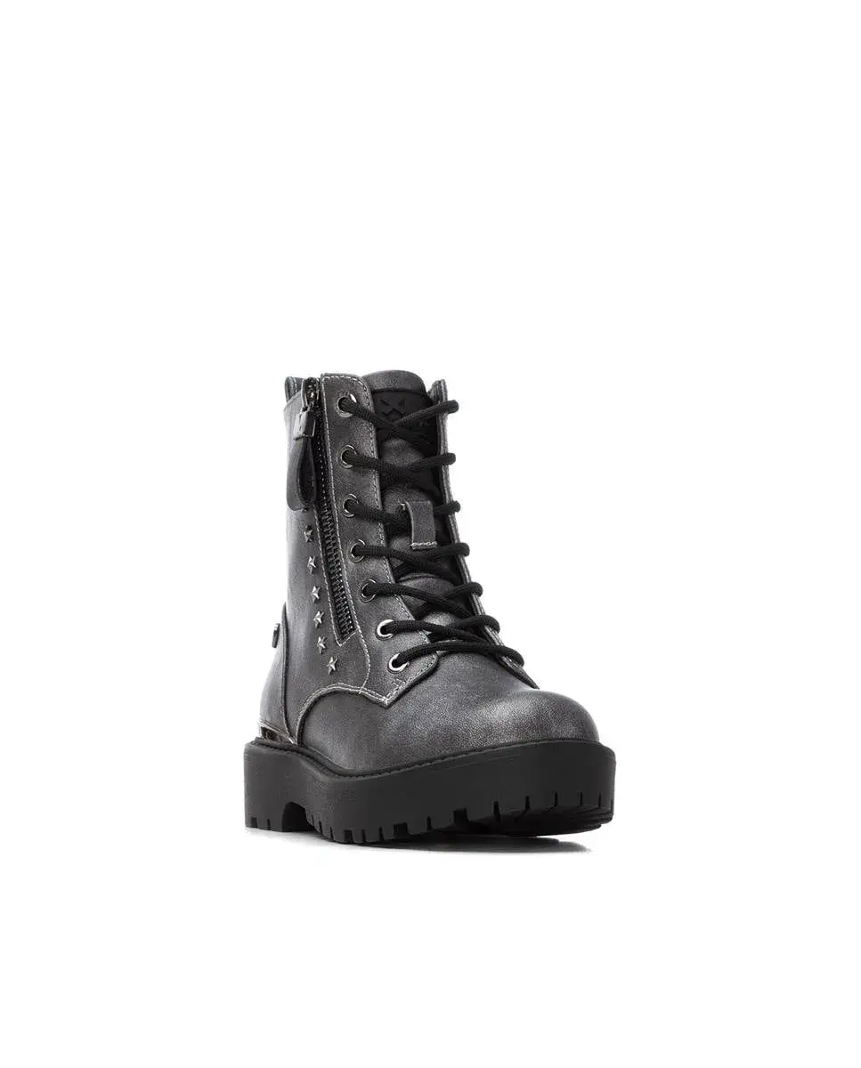 Детские ботинки в военном стиле от бренда Xti Kids. Изготовлены из прочного синтетического материала, с современным дизайном и характером. Снабжены шнуровкой спереди и боковой молнией рядом с шнурками для удобства надевания. Включают декоративные элементы в виде маленьких звездочек рядом с молнией, которые придают оригинальность и веселье. Каблук украшен металлической деталью, добавляющей блестящий контраст. Толстая прорезиненная подошва с зубцами обеспечивает хорошее сцепление и стабильность. Идеально подходят для создания стильного городского образа. Эта модель получила сертификат веганской продукции от всемирной организации PETA (Организация по защите прав животных).