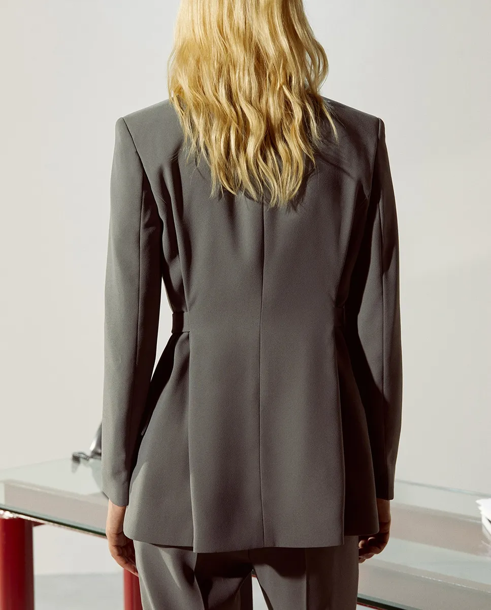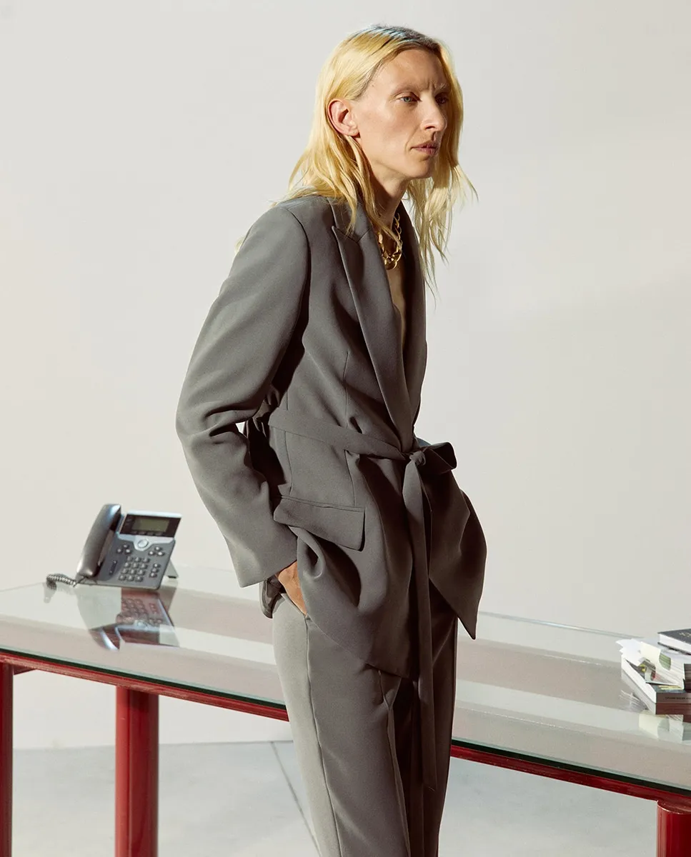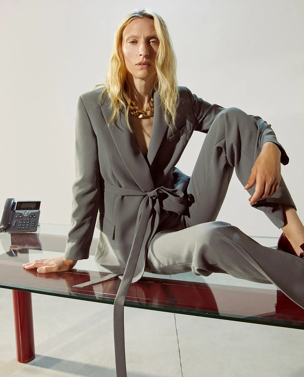 Блейзер с поясом из той же ткани и боковыми карманами с клапаном