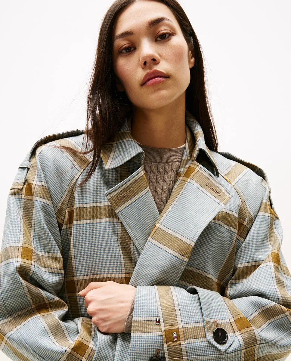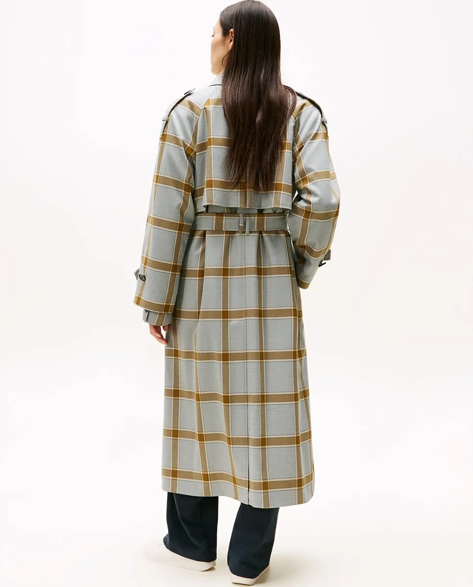 Женский шерстяной тренч с обычным силуэтом. Двубортная застежка и регулируемый пояс. Дизайн с клетчатым принтом и деталями на манжетах и плечах.