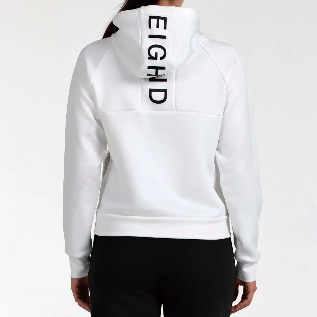 Женская толстовка с капюшоном, полиэстер с начесом, фирменная этикетка +8000. Декоративная графика идет от капюшона до спины. Капюшон регулируется шнурком. Манжеты и подол на резинке. Передний карман.