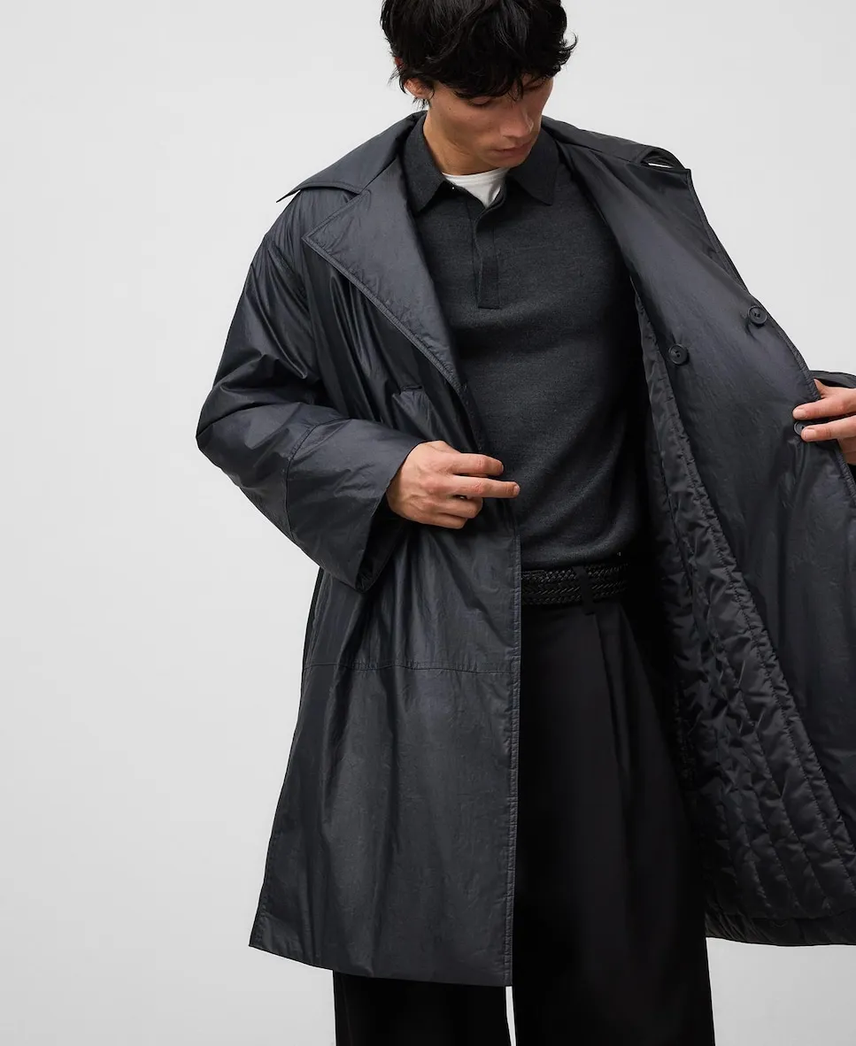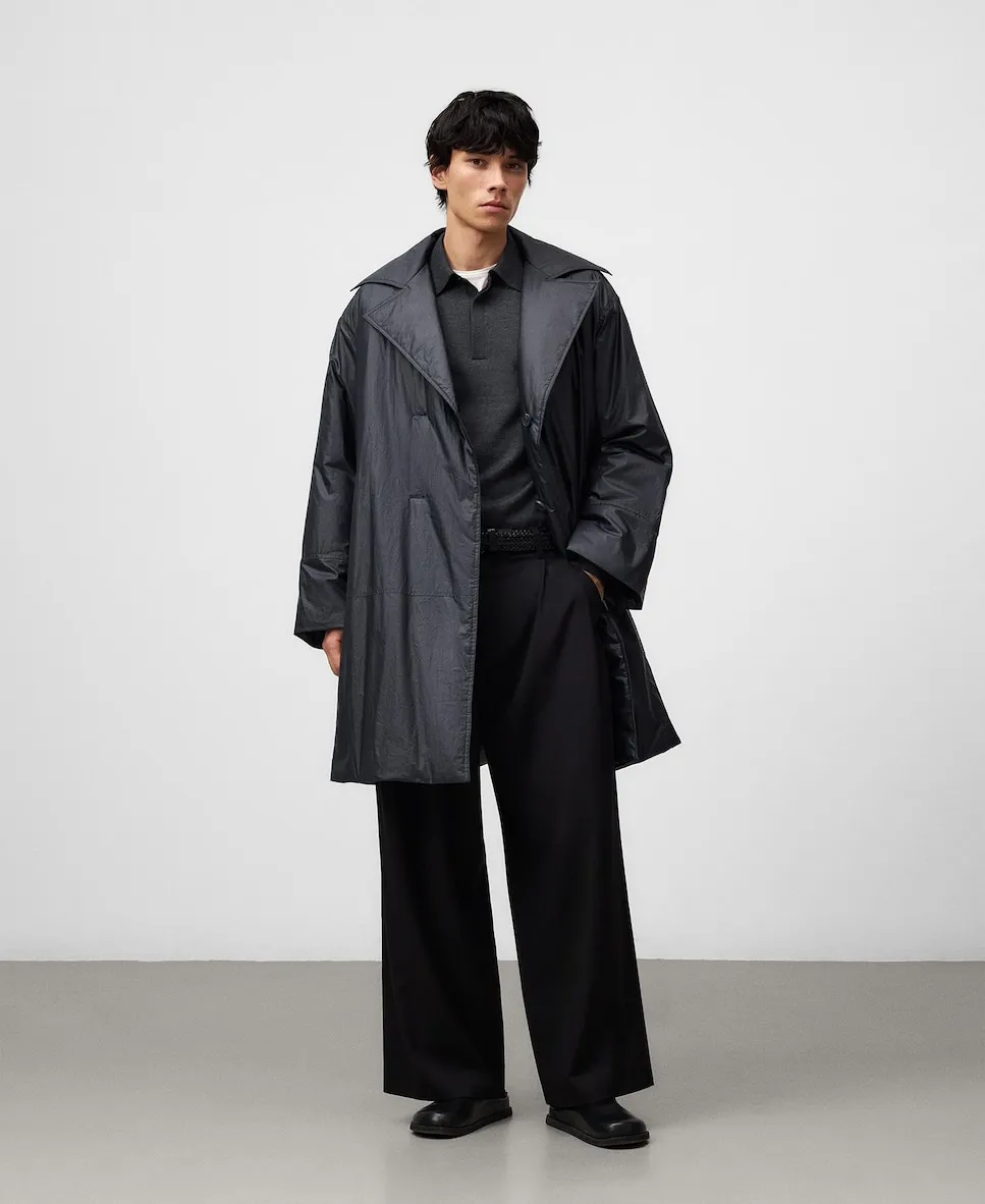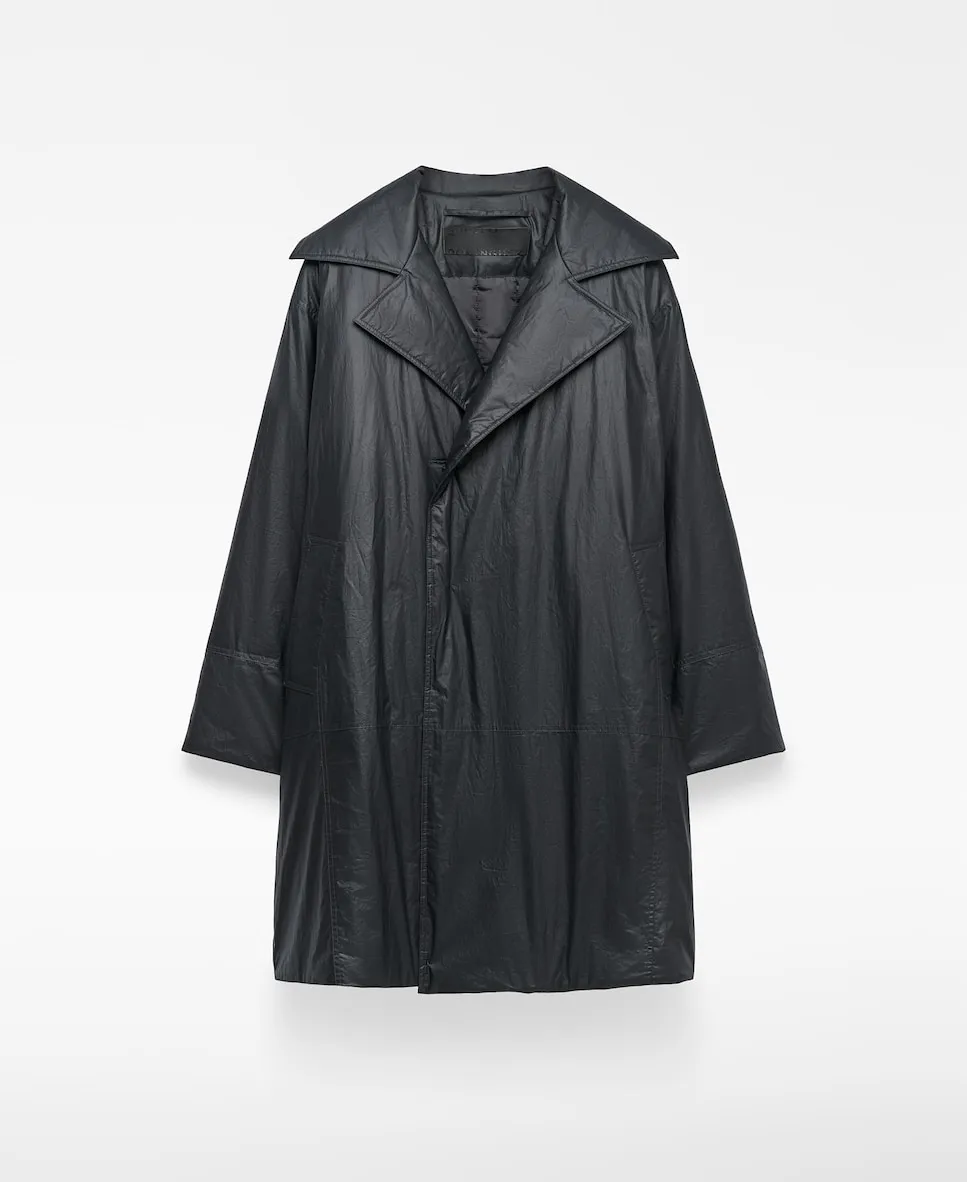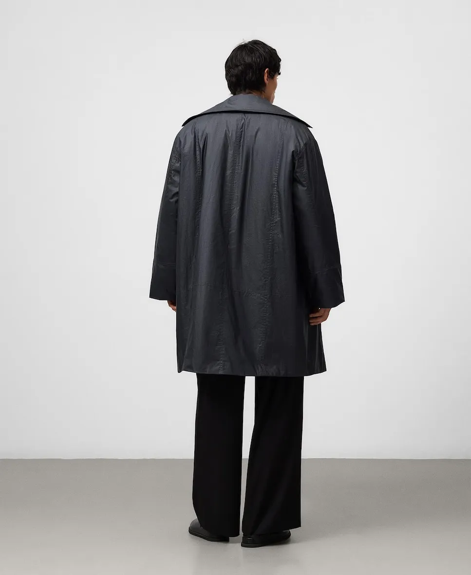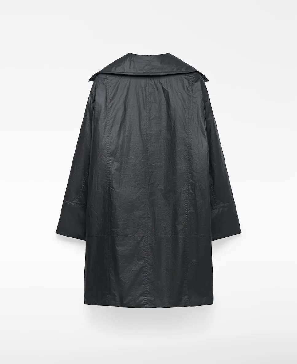 Водонепроницаемый оверсайз плащ с клапаном. Имеет длинные рукава и застежку спереди с перекрестным закрытием, скрытым под планкой, а также наклонные прорезные карманы спереди.