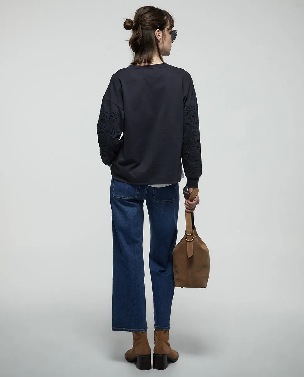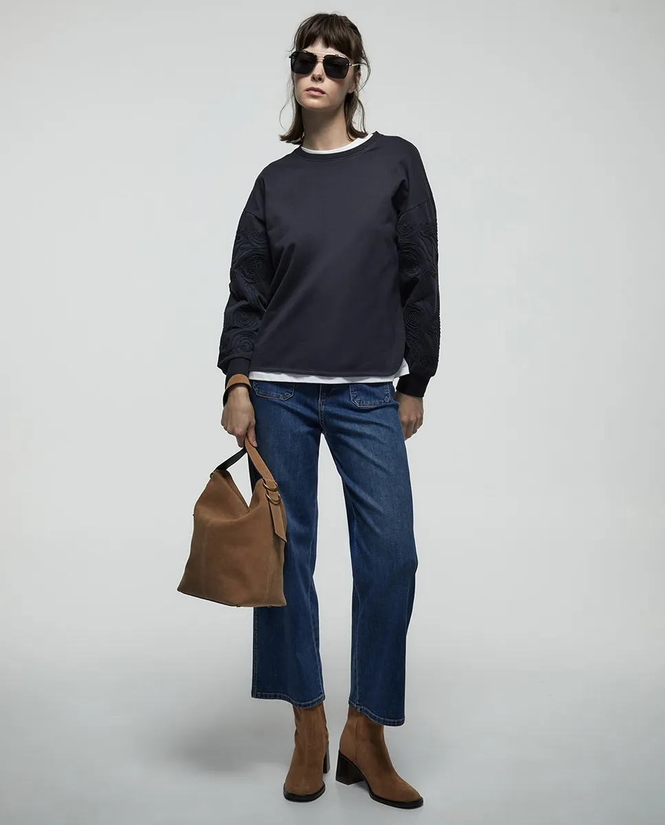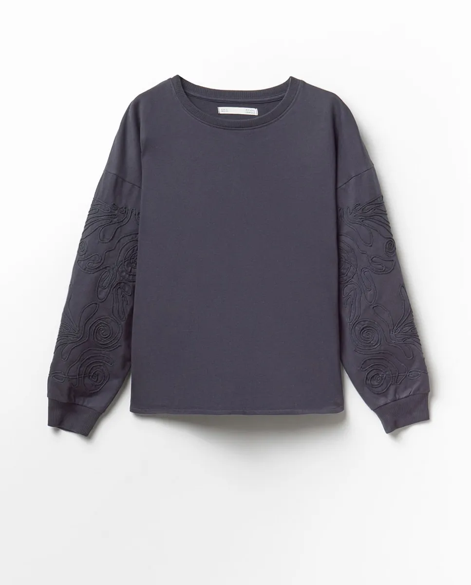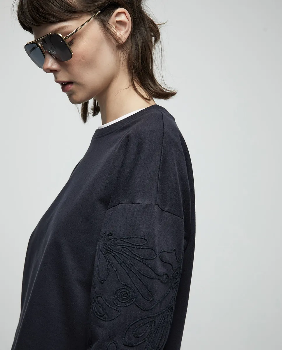 Костюм с толстовкой с круглым вырезом и длинными рукавами. Передняя вышивка и ткань из хлопковой смеси