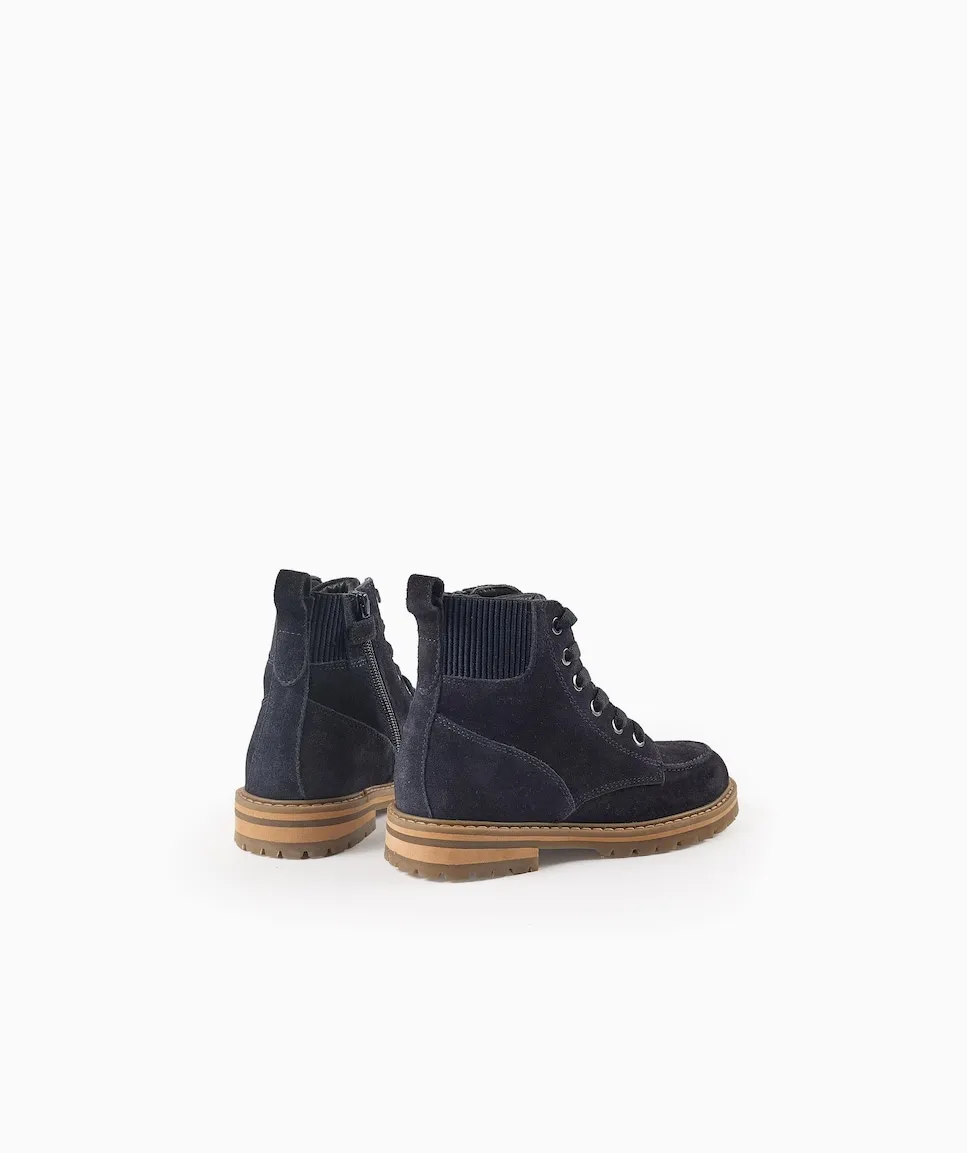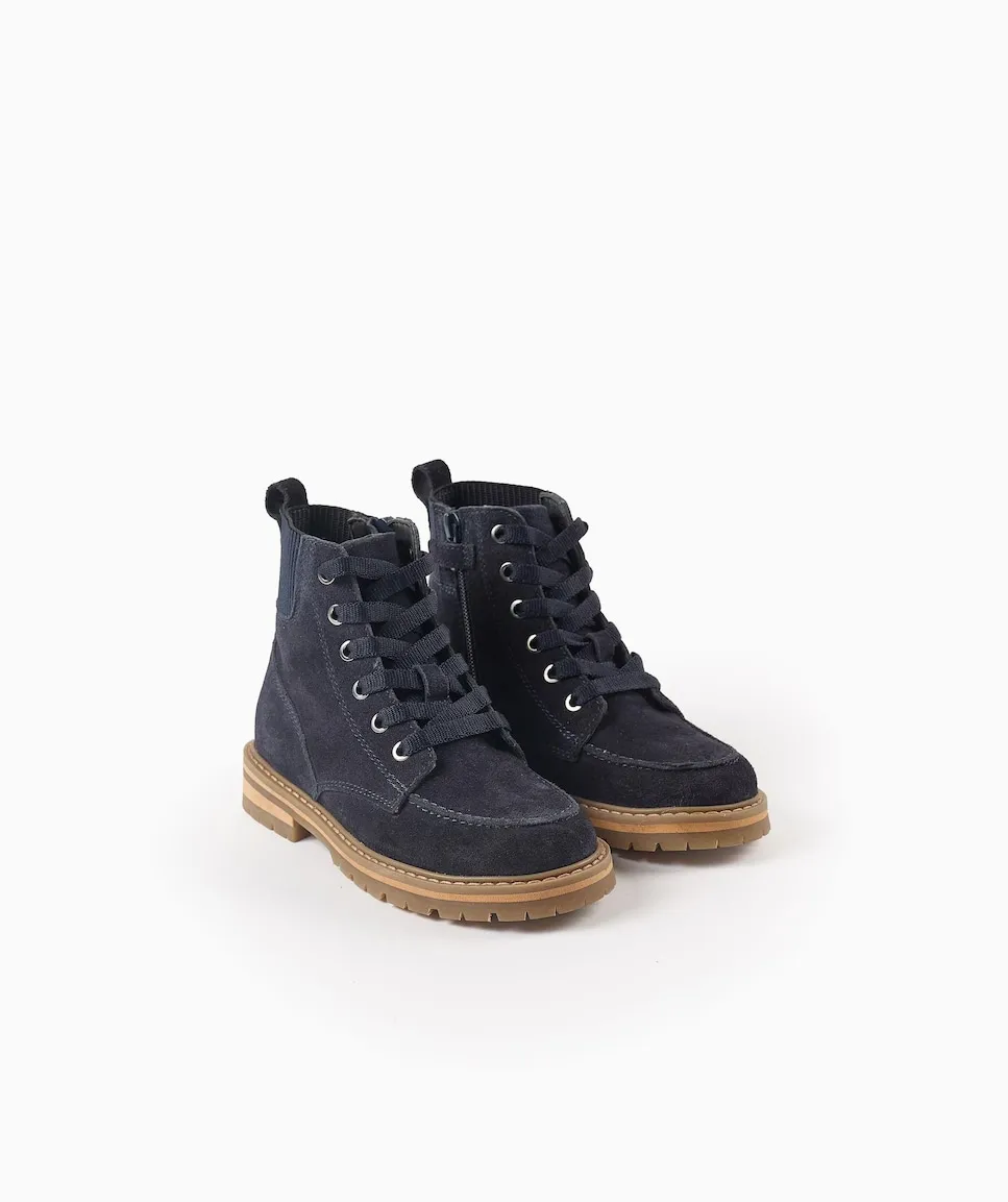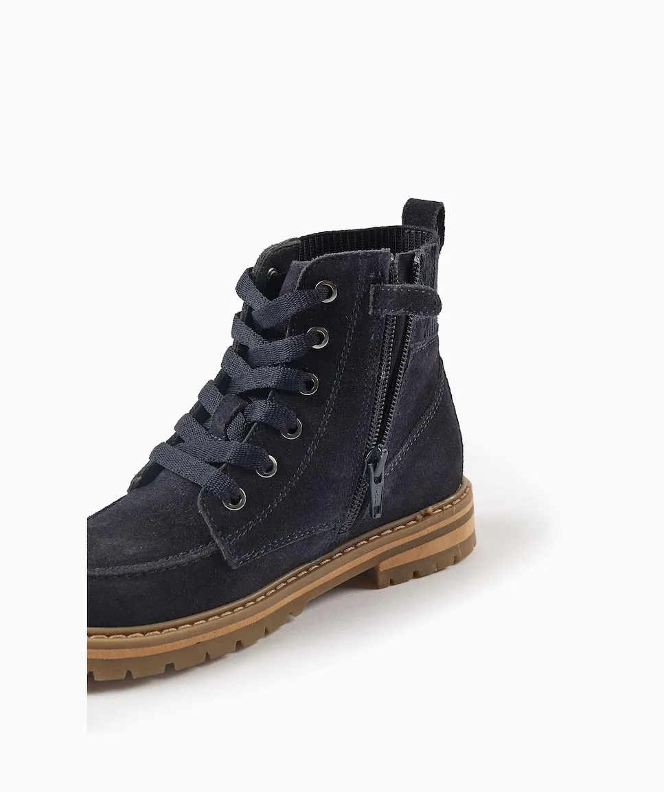 Темно-синие замшевые ботинки для мальчика с шнурками и боковой застежкой-молнией для легкого надевания. Эластичные вставки на пятке. Стелька из кожи. Противоскользящая резиновая подошва. Классическая и универсальная обувь.
