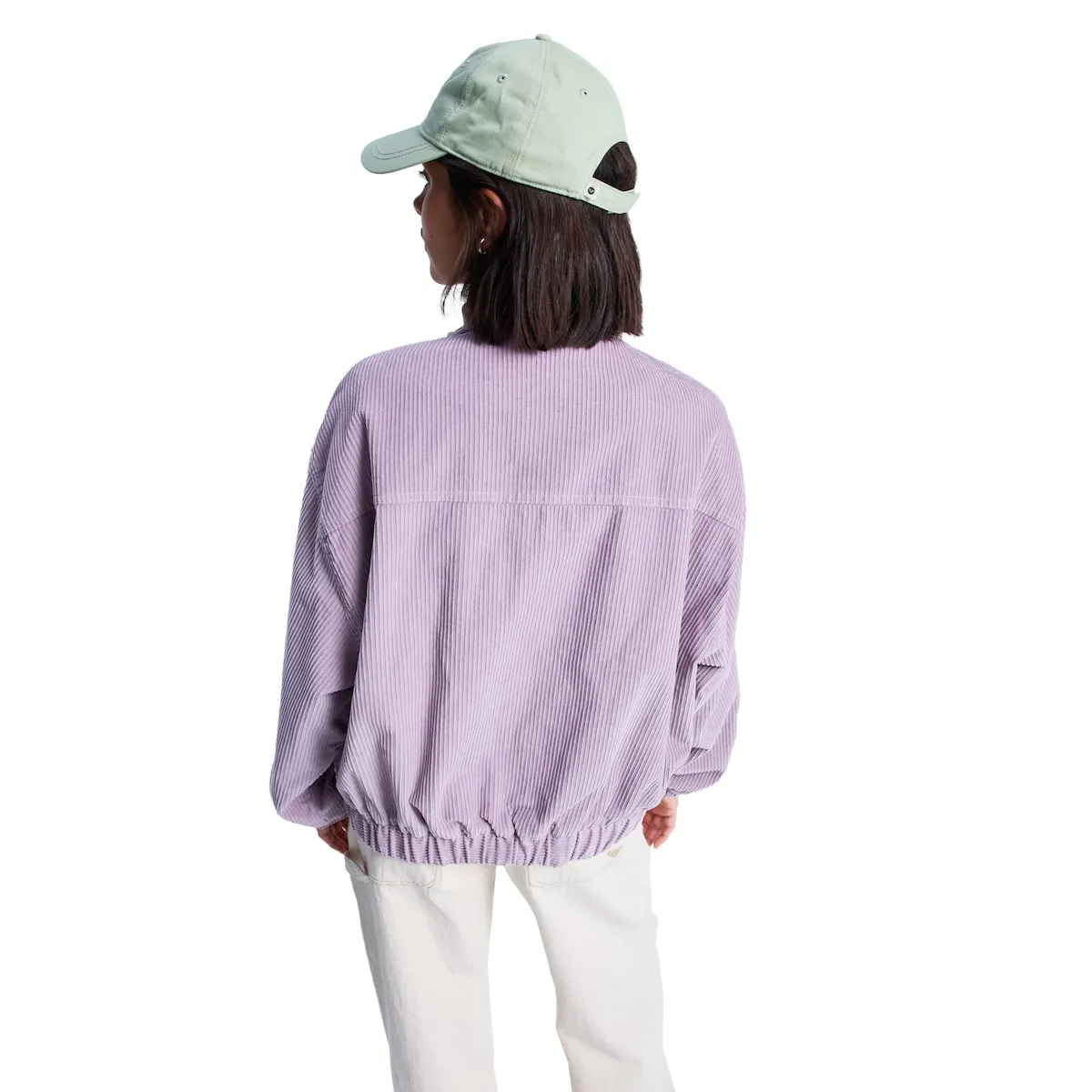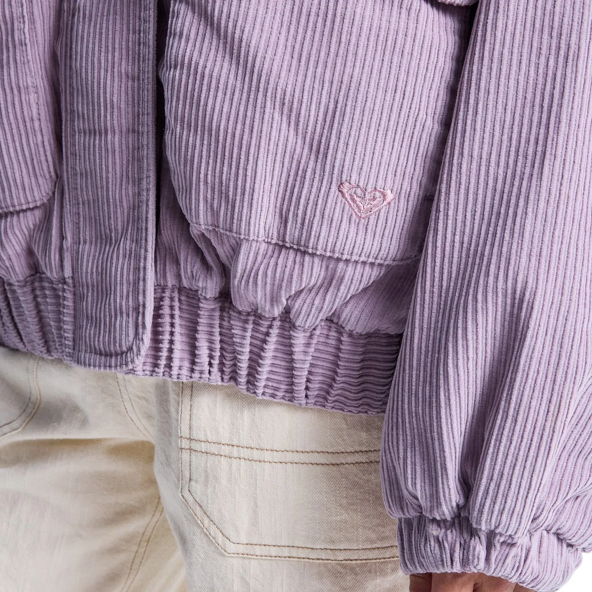 Женская оверсайз куртка из вельвета. Характеристики включают: Ткань: хлопковый вельвет [298 г/м²], Крой: свободный крой boyfriend, Внутренняя ткань: полностью подкладка из хлопкового поплина, Карманы: передние накладные карманы с боковым входом, Застежка: передняя молния с планкой и вышивка сердца Roxy на левом кармане.