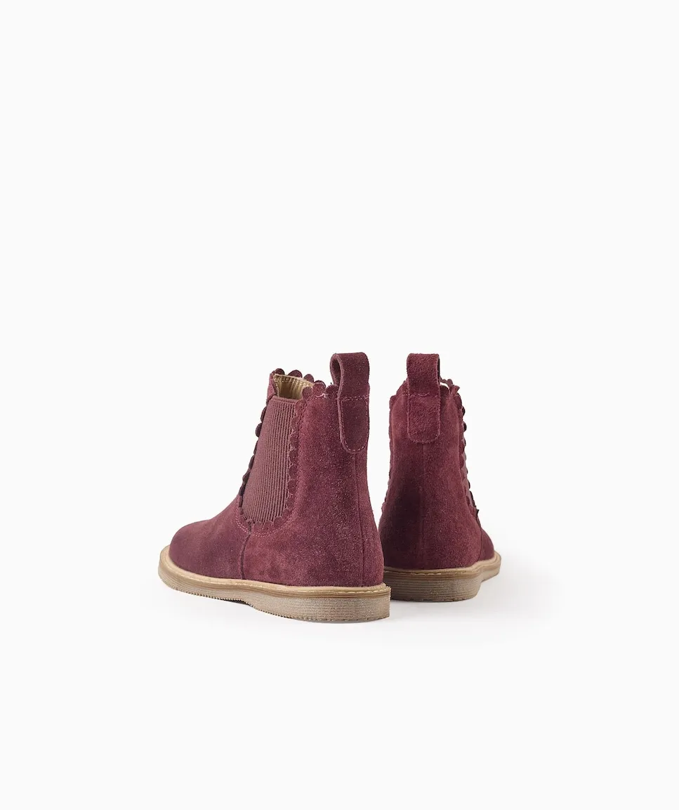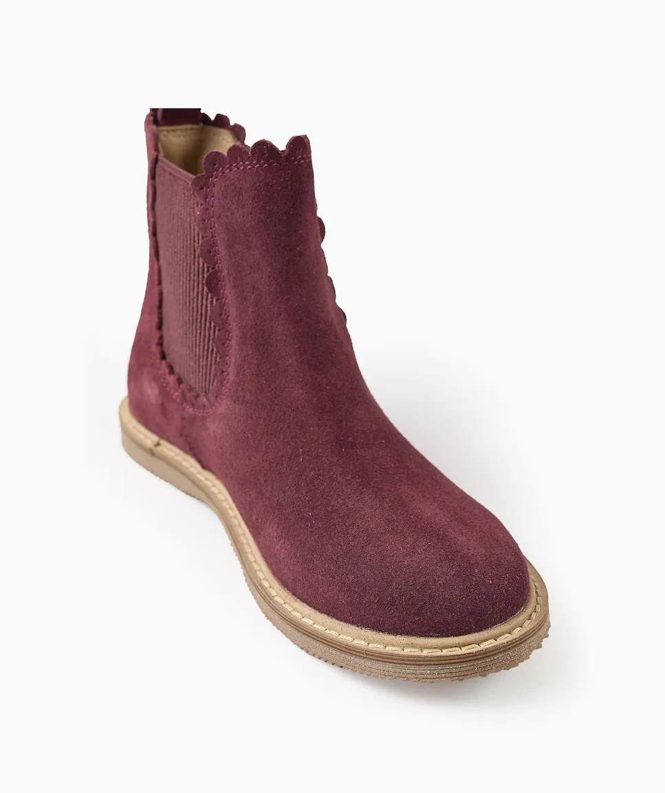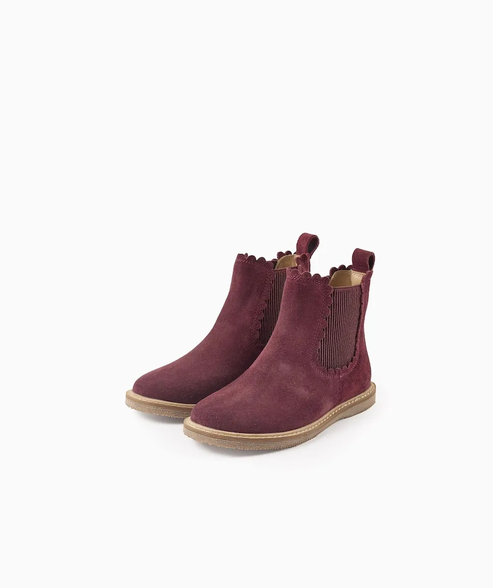 Бордовые замшевые ботиночки для девочки. Стиль Chelsea, с эластичными панелями с текстурой с обеих сторон. Эффект выреза. Ремешок на пятке для более легкой обувки. Стелька из кожи с эффектом мягкой подкладки для максимального комфорта. Подошва из термопластичной резины, удобная и противоскользящая. Big Me: стельки с дизайном полукругов, чтобы ваш ребенок мог легко определить соответствующую ногу, способствуя его автономии. Идеальные ботинки для любого образа - более элегантного или более повседневного!