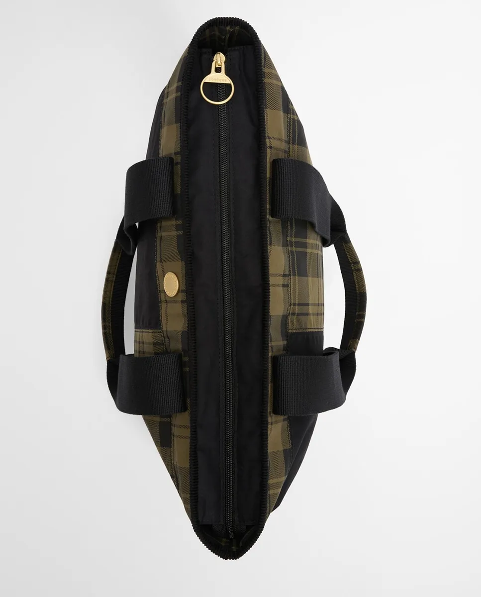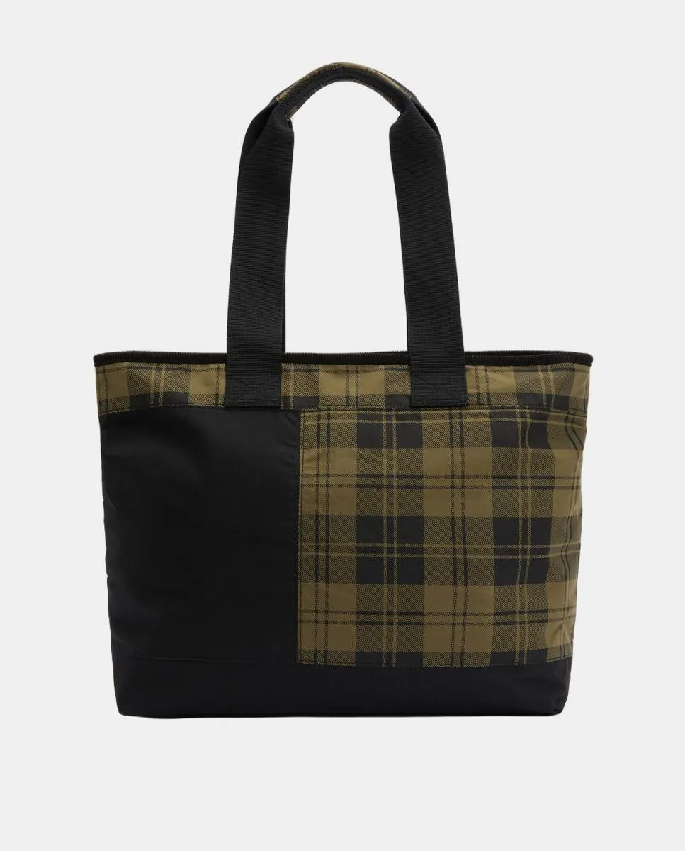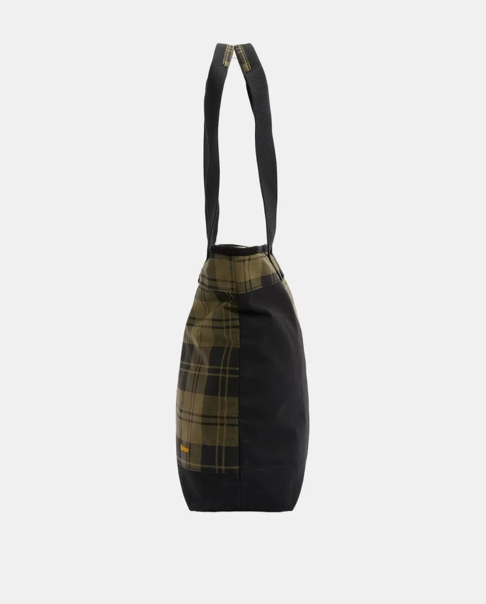 Текстильная сумка-тоут с восковым покрытием, с контрастными тартановыми вставками, верхним канатным кантователем и застежкой-молнией. Внутренний карман на молнии и ручки из ременной ленты.