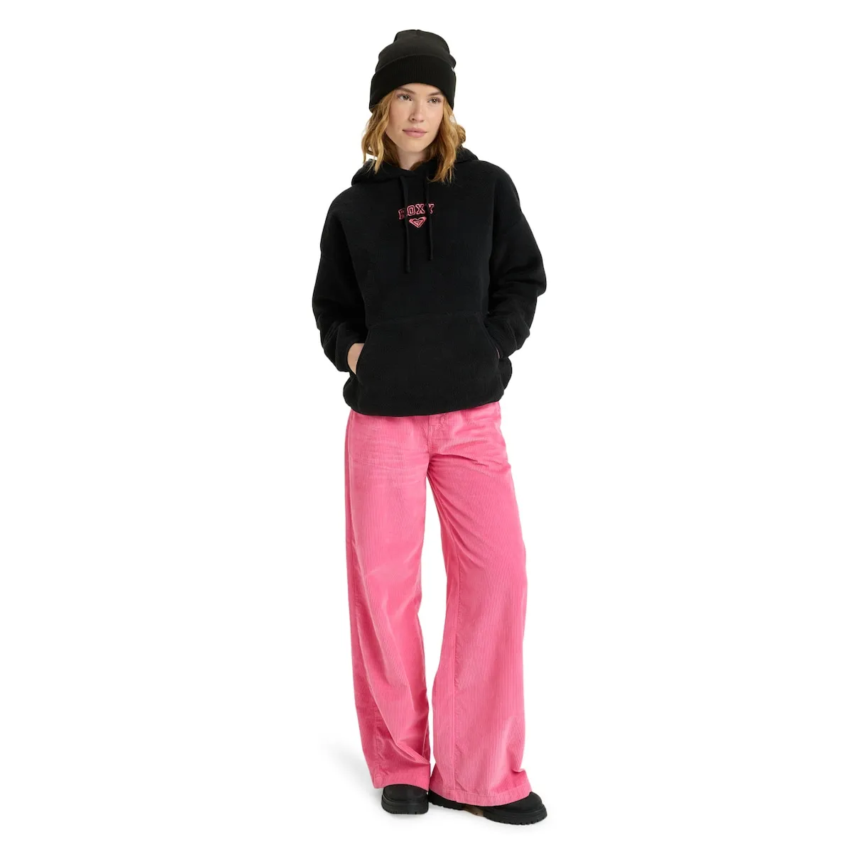 Флисовая толстовка с капюшоном для женщин. Характеристики включают: Материал: полиэстеровый флис, Крой: обычный, Капюшон: с подкладкой, Карманы: карман-кенгуру, Детали: вышивка Roxy на груди и капюшоне с завязками.
