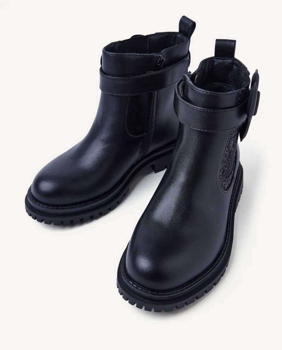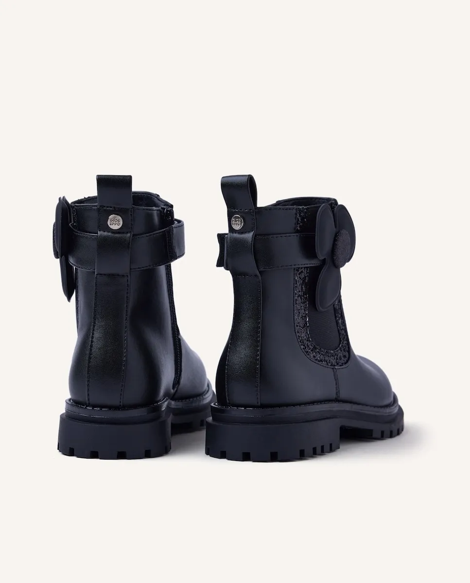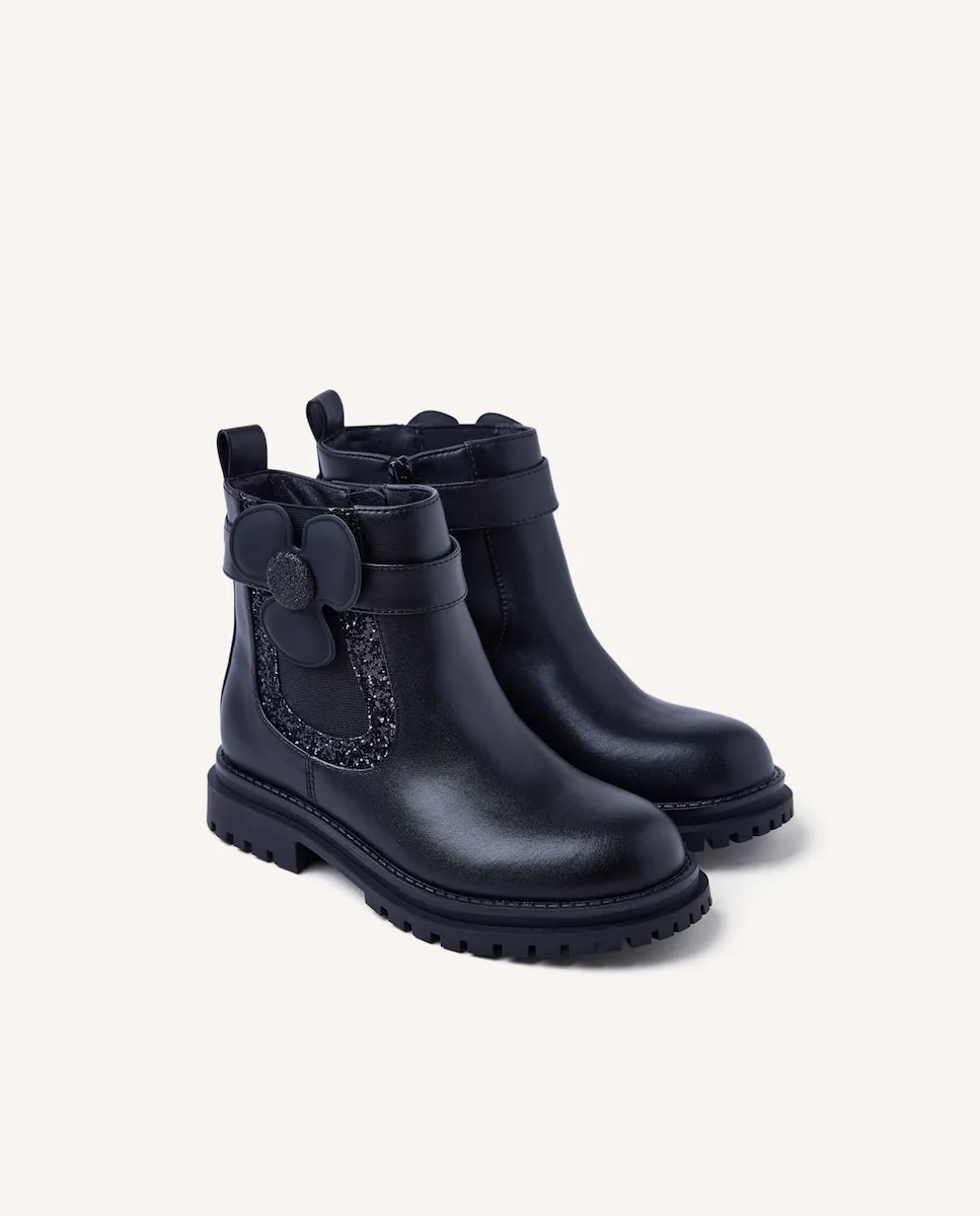 Ботинки с блестками и ремешком с цветком, который можно снимать. Подошва типа трек. Оснащены мягкой стелькой, эластичной вставкой с внешней стороны и молнией на внутренней стороне голенища. Верх из полиуретана, дышащего полиэстера и глиттера. Подкладка из полиуретана и дышащего полиэстера. Стелька из дышащего полиэстера. Гибкая подошва из TPR.
