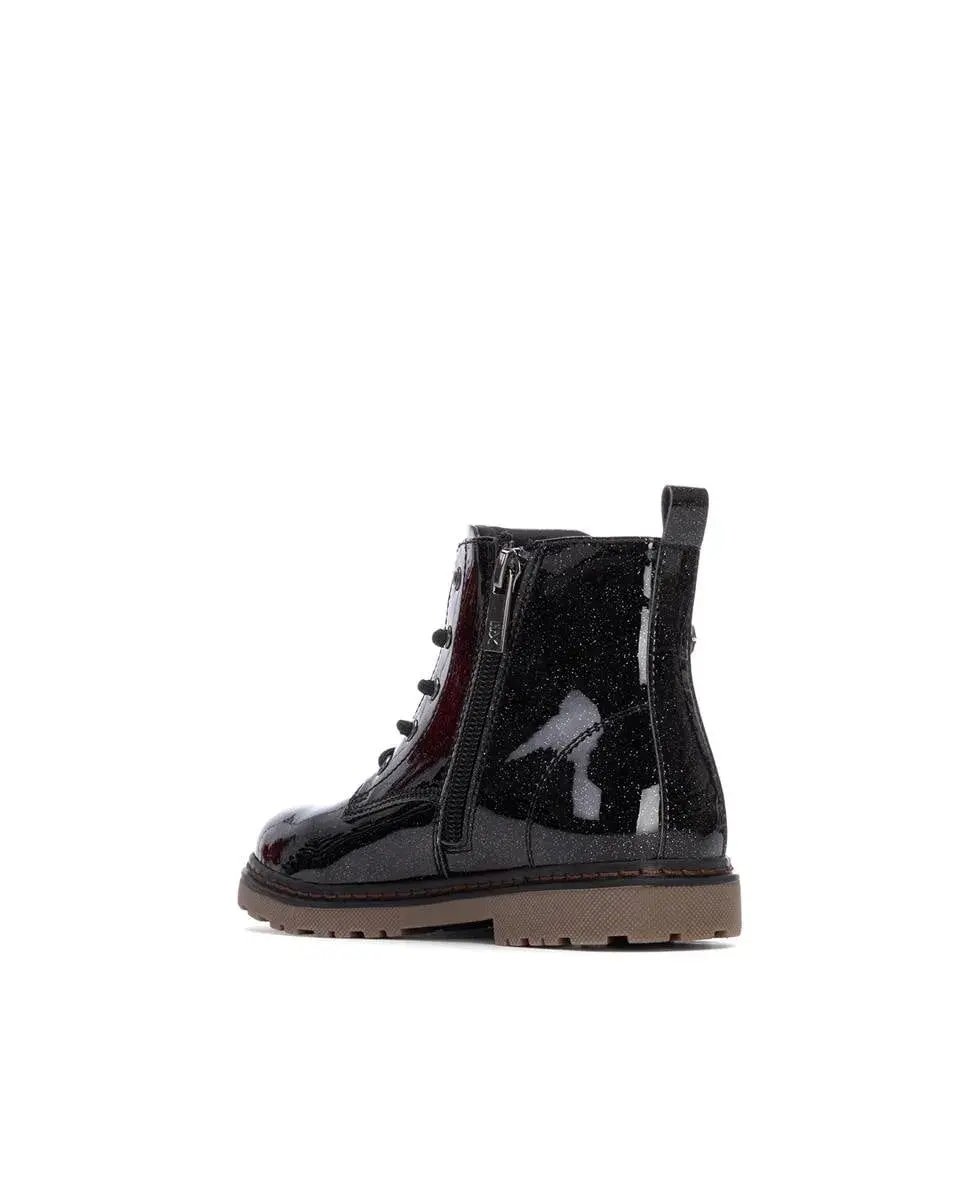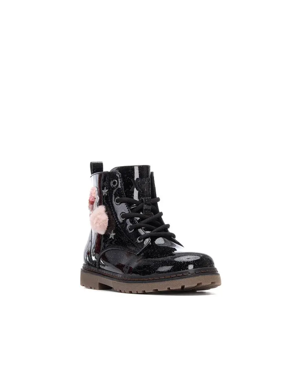 Детские ботинки в военном стиле от бренда Xti Kids. Сшиты из лакированной кожи с глиттером, придающим яркий и современный блеск. На боковой стороне имеется декоративная нашивка в виде животного-ежика, которая добавляет забавный и оригинальный элемент дизайну. Резиновая подошва обеспечивает комфорт и хорошее сцепление. Идеально подходит для образа с индивидуальностью и уникальным стилем.