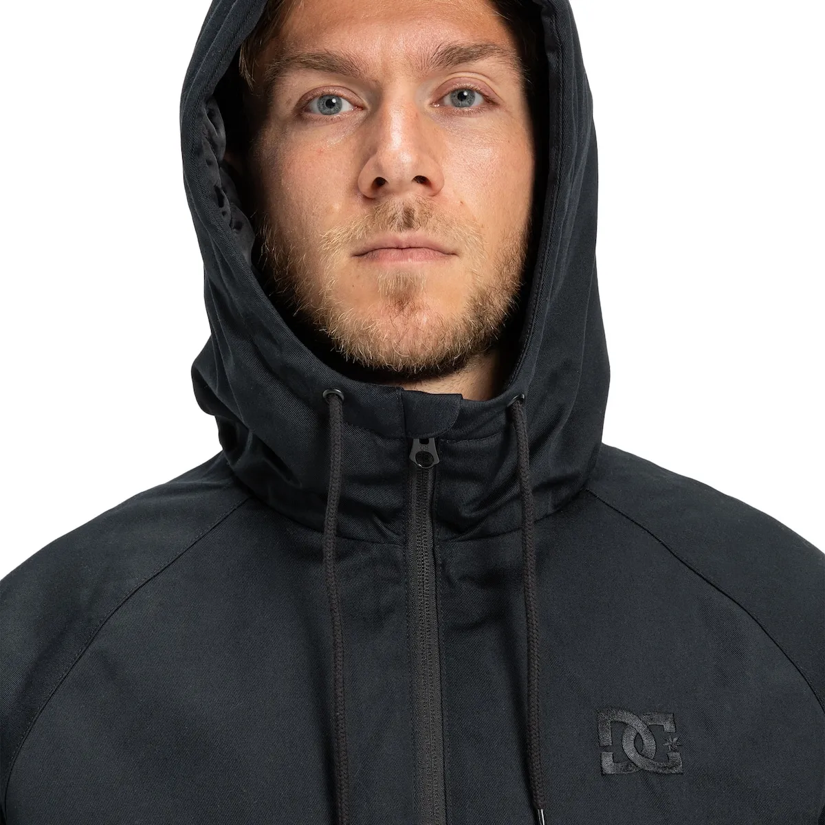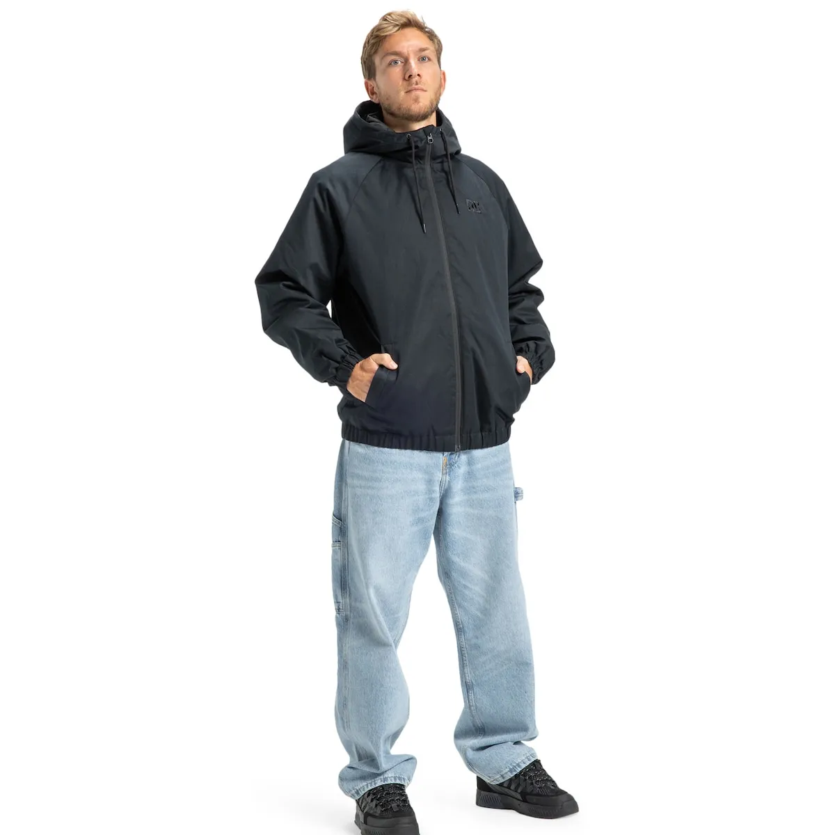 Мужская куртка с капюшоном. Характеристики включают: Ткань: смесь переработанного полиэстера и хлопка, Стеганая подкладка из переработанного полиэстера, Стандартный крой, Застежка-молния из нейлона спереди, Эластичные манжеты и низ, Два накладных кармана спереди, Внутренний карман на груди, Капюшон с шнурками, Вышивка звезды DC на груди и детали DC.