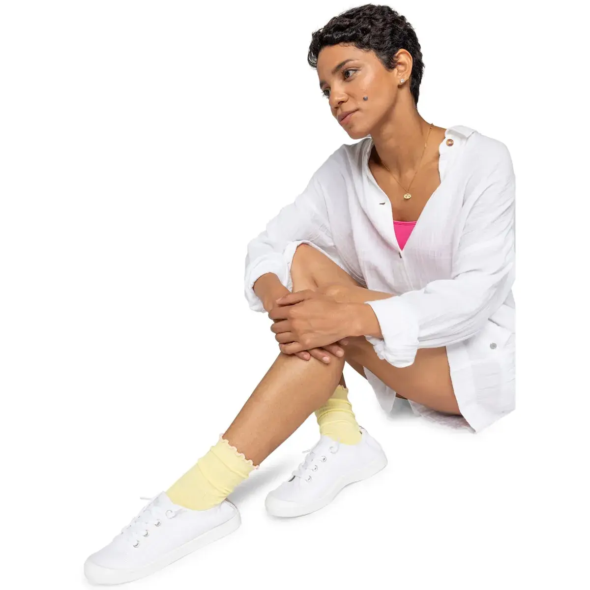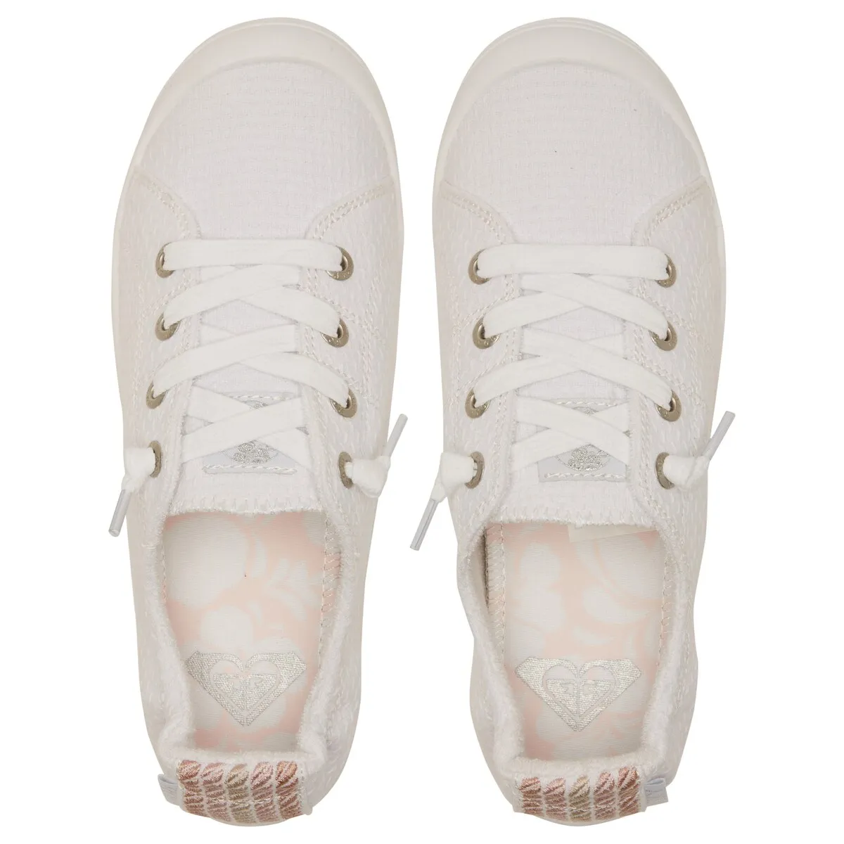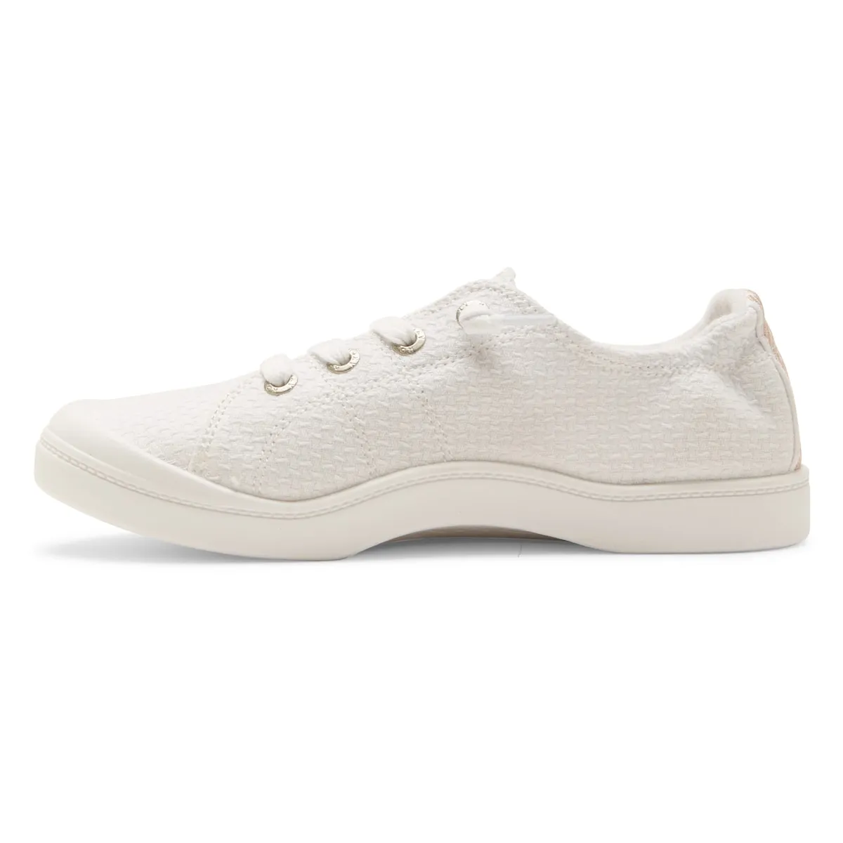Женские кроссовки. Характеристики включают: Верх: текстиль с графическим принтом на основе водной краски [в зависимости от модели], Застежка: эластичный верх с дизайном slip-on и завязанными хлопковыми шнурками, Стелька: стелька с мягкой подкладкой из памяти формы и внутренней частью из переработанного холста с подкладкой из флиса REPREVE, Подошва: инжектированная гибкая подошва из TPR с 50% переработанного материала, с формованной дугой и классическими деталями Roxy.