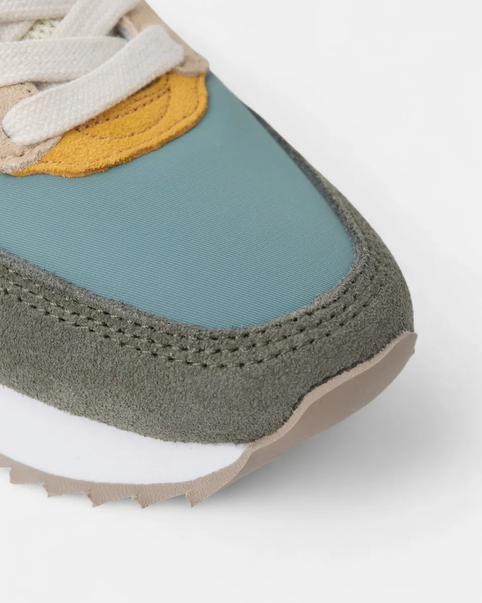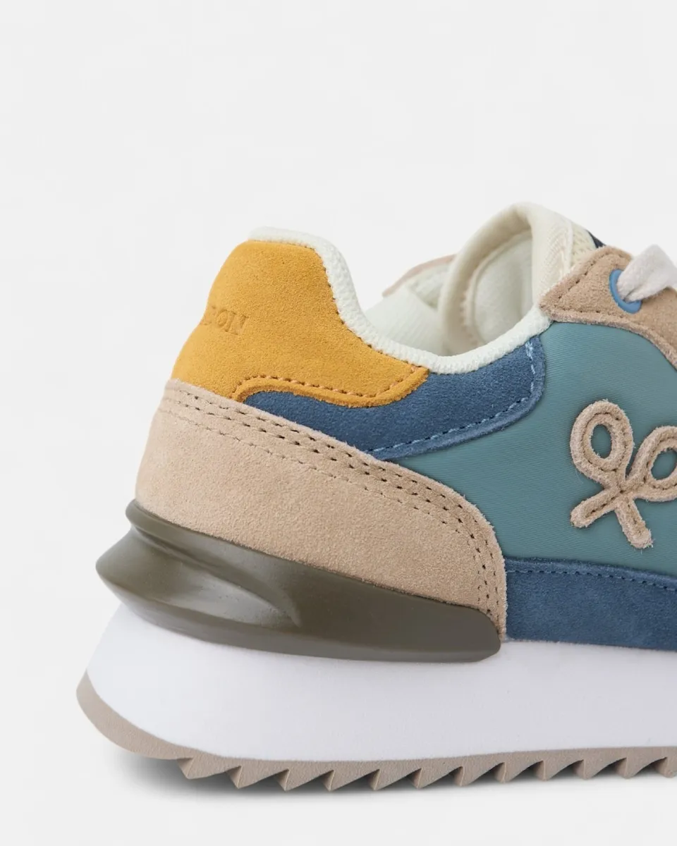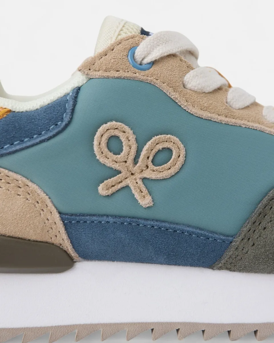 Детские кроссовки для бега многоцветные в зеленых, синих и желтых тонах, выполненные из замши и перфорированной технической ткани. Сбоку украшены аппликацией с ракеткой и застежкой на персонализированные шнурки. Имеют удобную резиновую подошву, мягкую кожаную внутреннюю отделку и персонализированную этикетку на язычке.